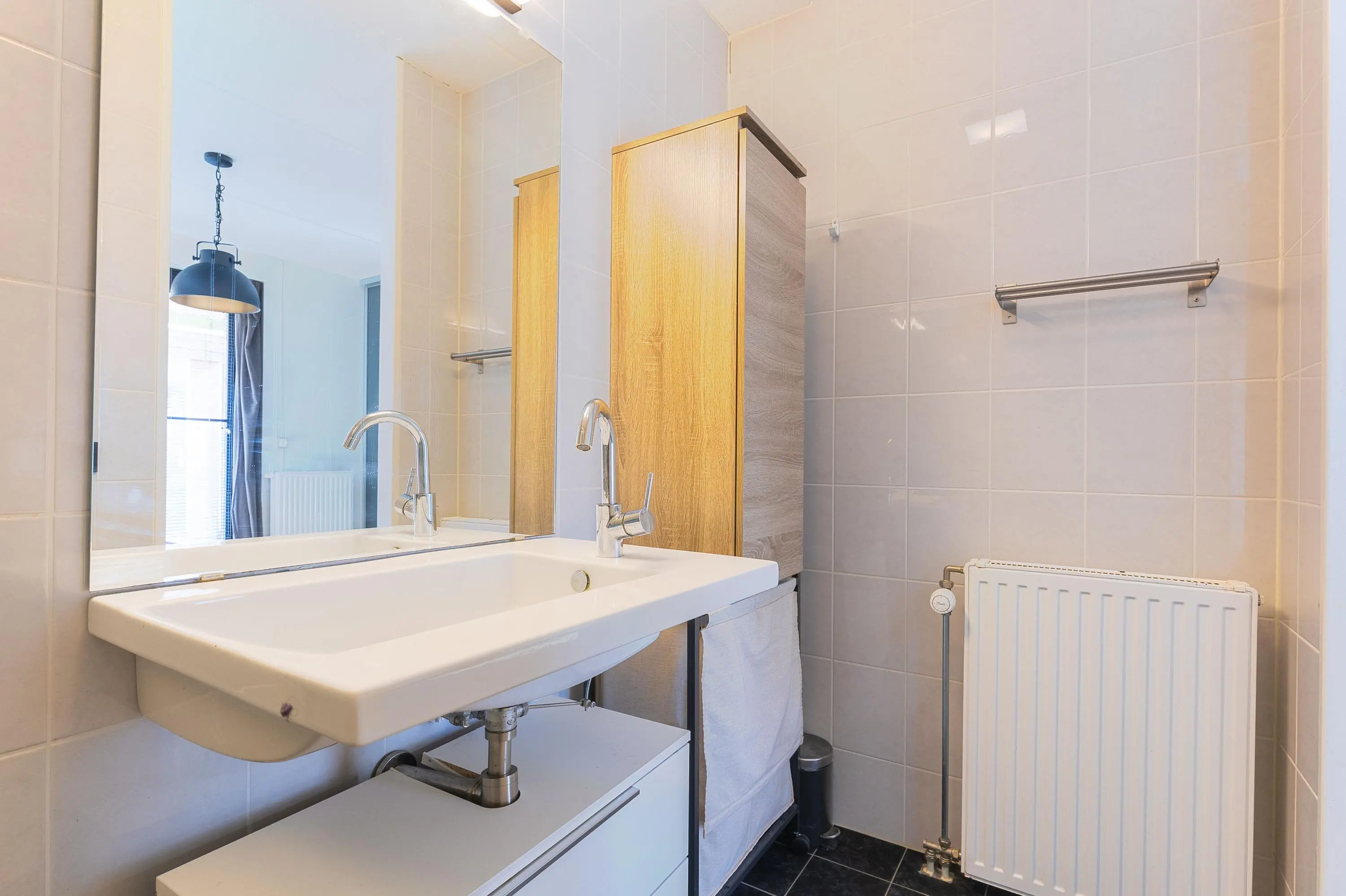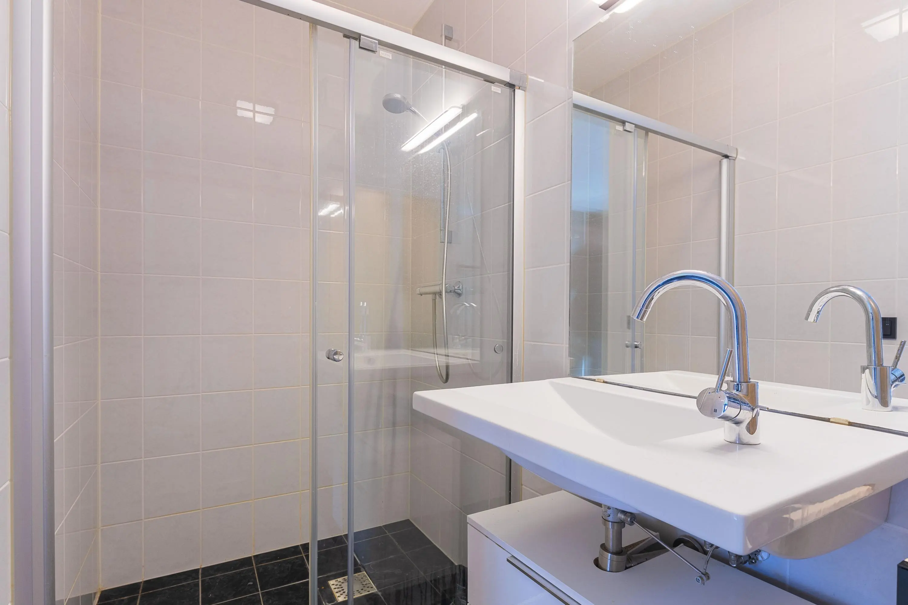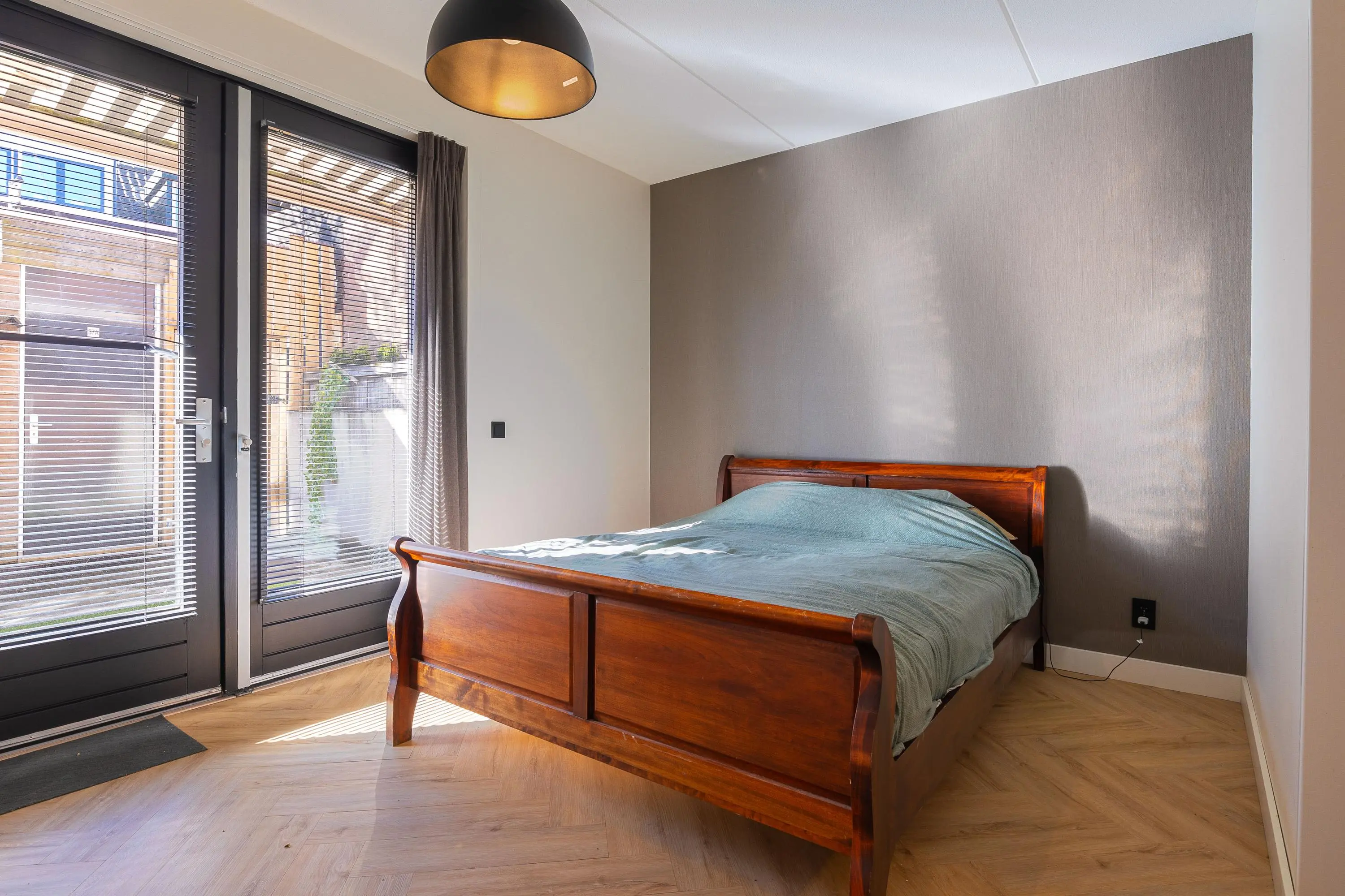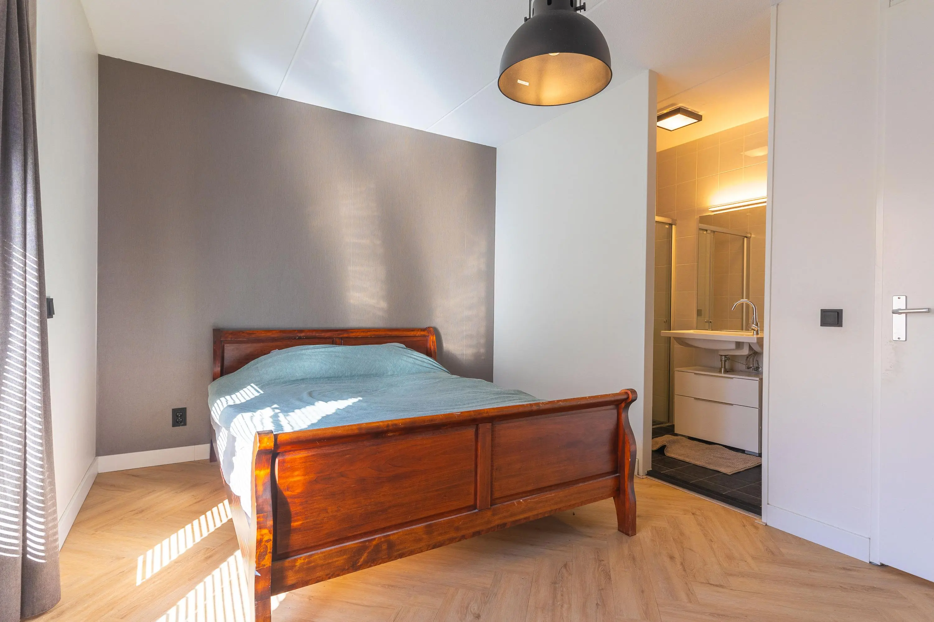 Aan de andere zijde van de hal bevindt zich de zeer ruime slaapkamer met openslaande deuren naar buiten. De kamer beschikt over een grote vaste inbouwkast met mogelijkheid om een televisie netjes weg te werken. Aangrenzend vind je de volledig betegelde, verzorgde badkamer met inloopdouche en modern badkamermeubel.