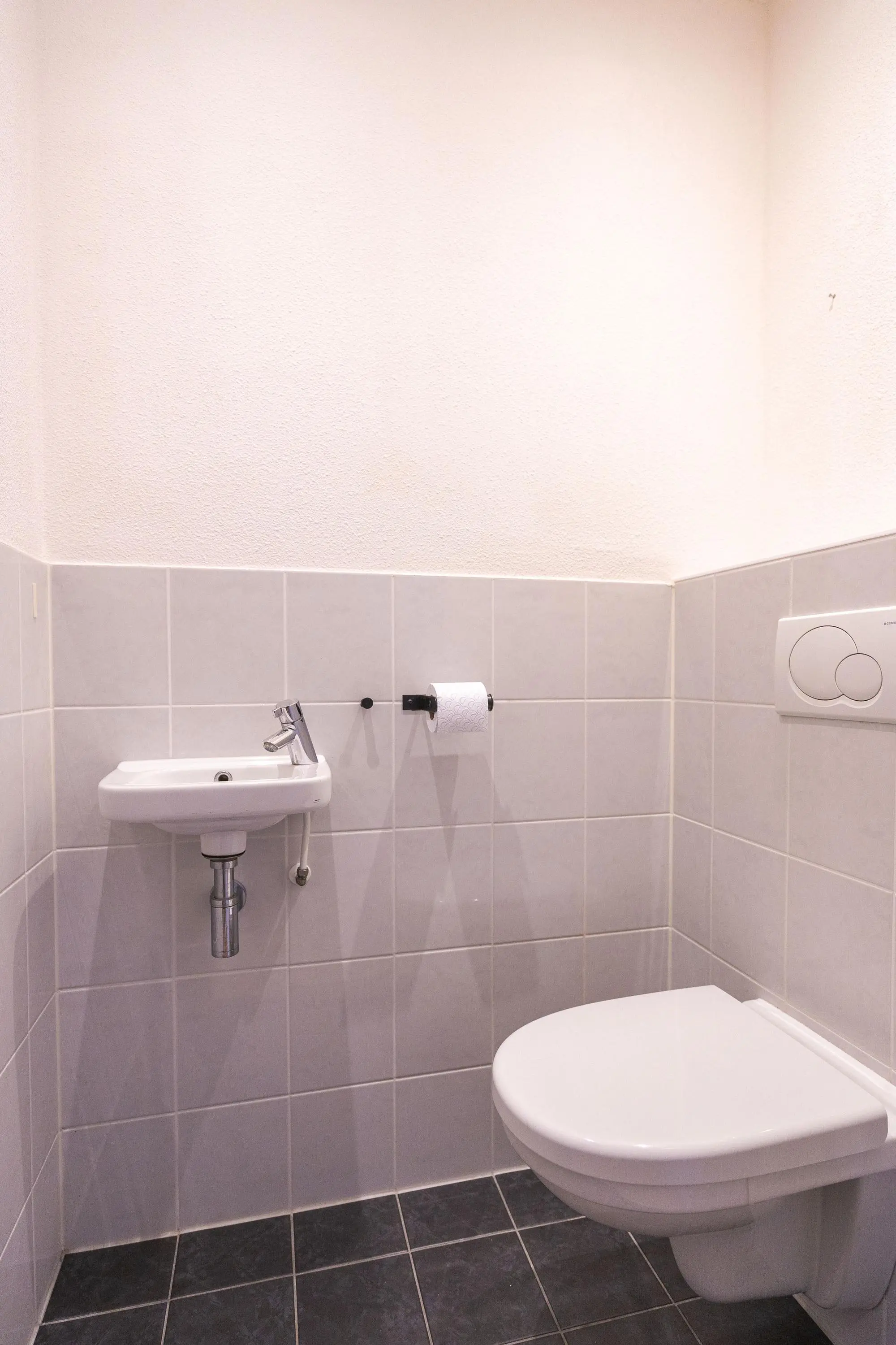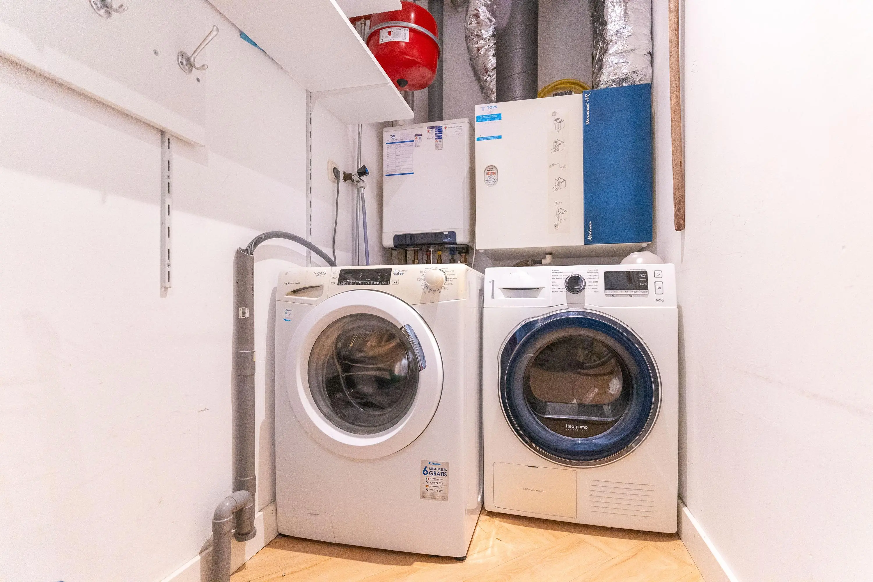 In de hal bevinden zich het toilet, een royale ruimte voor de wasmachine- en drogeropstelling, evenals de cv-installatie en warmte-terugwininstallatie.