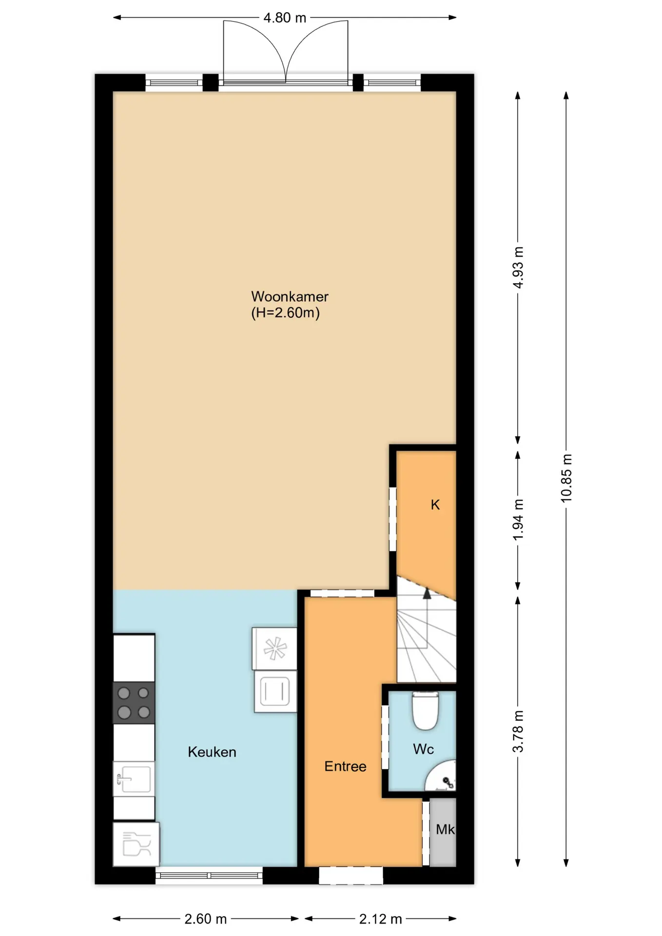Via de entree kom je in de hal met modern toilet en de trapopgang naar de eerste verdieping. Aan de voorzijde van de woning bevindt zich de moderne keuken, voorzien van diverse inbouwapparatuur. De openslaande deuren naar de voortuin zorgen hier voor veel licht en maken dit een heerlijke plek om de dag rustig te beginnen met een kop koffie.