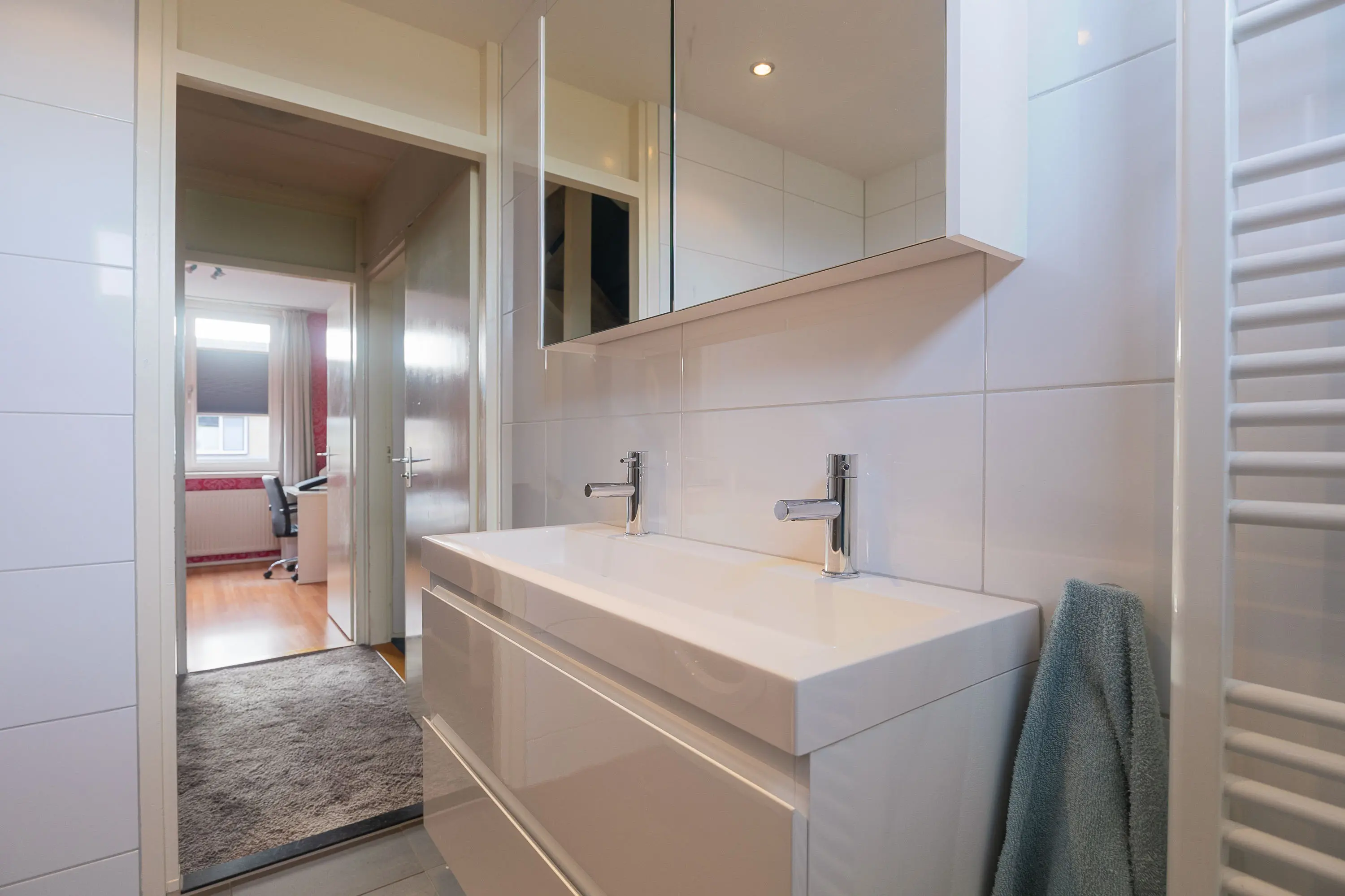 Op de eerste verdieping bevinden zich drie goed bemeten slaapkamers waarvan 1 met toegang naar het balkon aan de voorzijde. De nette badkamer met inloopdouche, wastafelmeubel en tweede toilet is compleet.