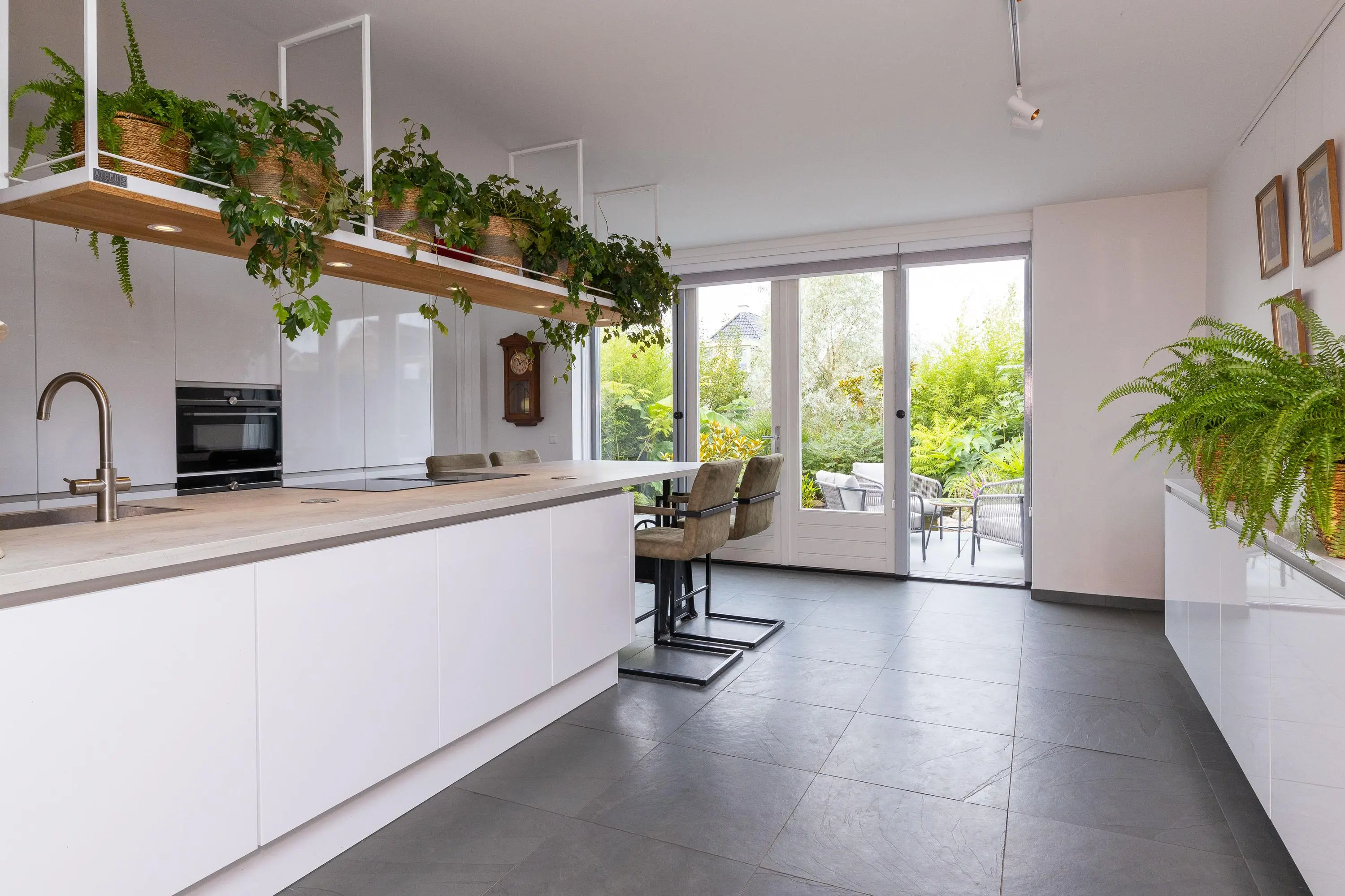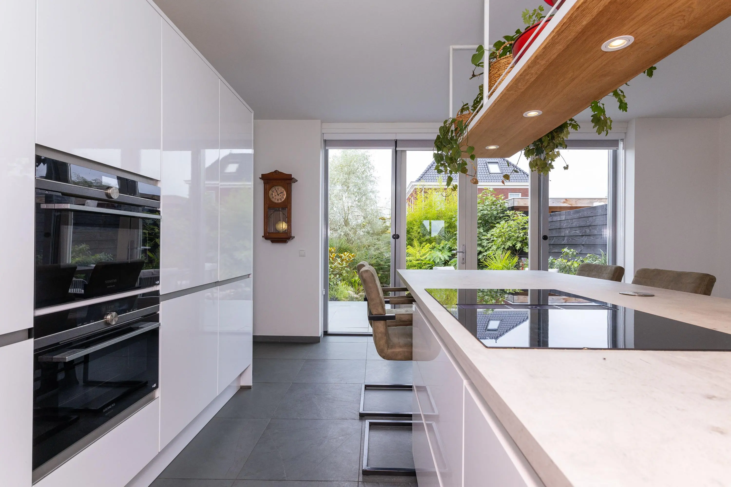 De open keuken met een groot kookeiland vormt het hart van het huis – perfect om uitgebreid te koken en te genieten met familie en vrienden, de luxe keuken is uitgevoerd met hoogwaardige inbouw apparatuur en Siemens WIFI home connect app. Via de openslaande deuren bereik je de zeer fraai aangelegde tuin en zorgt voor een naadloze verbinding met de tuin.