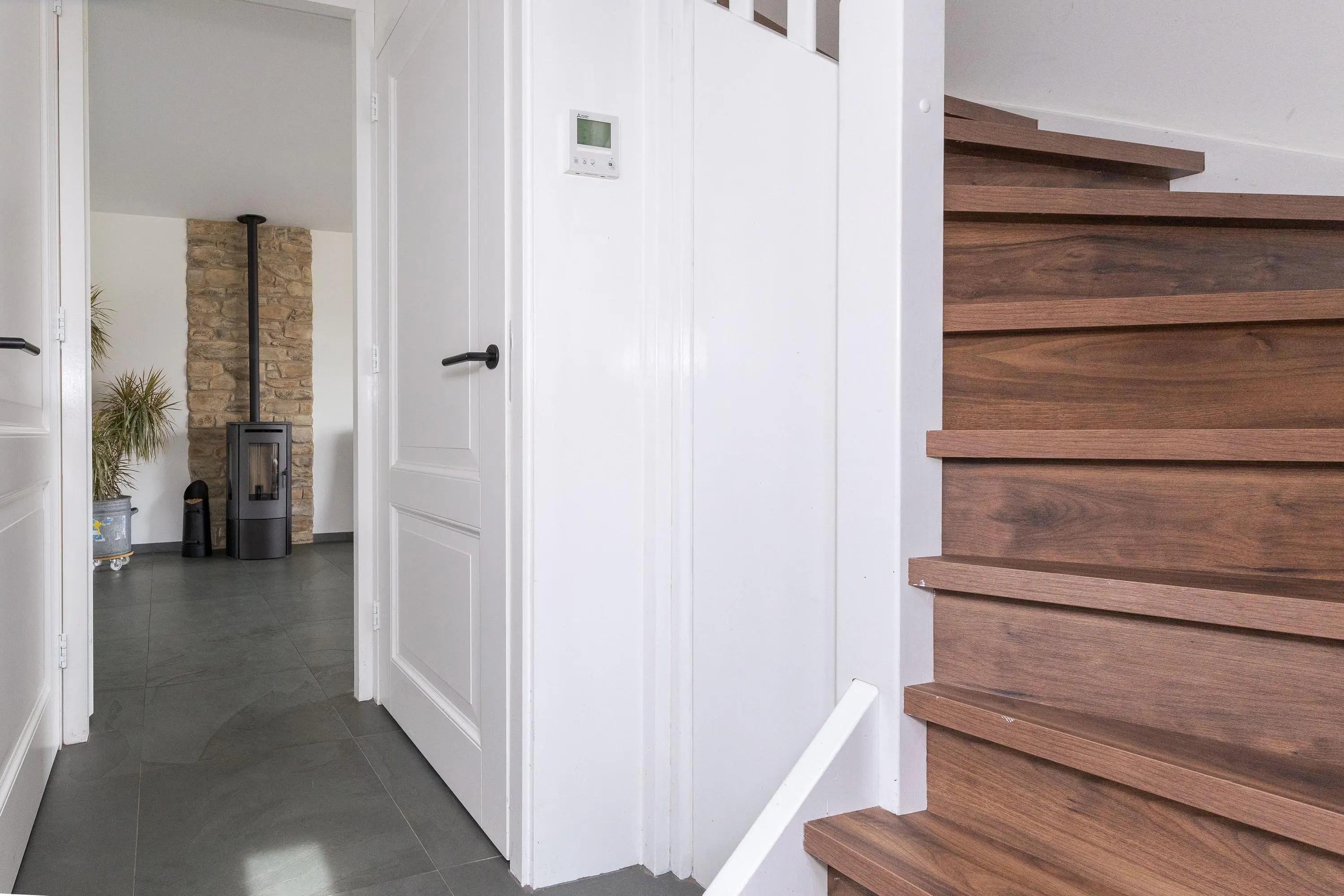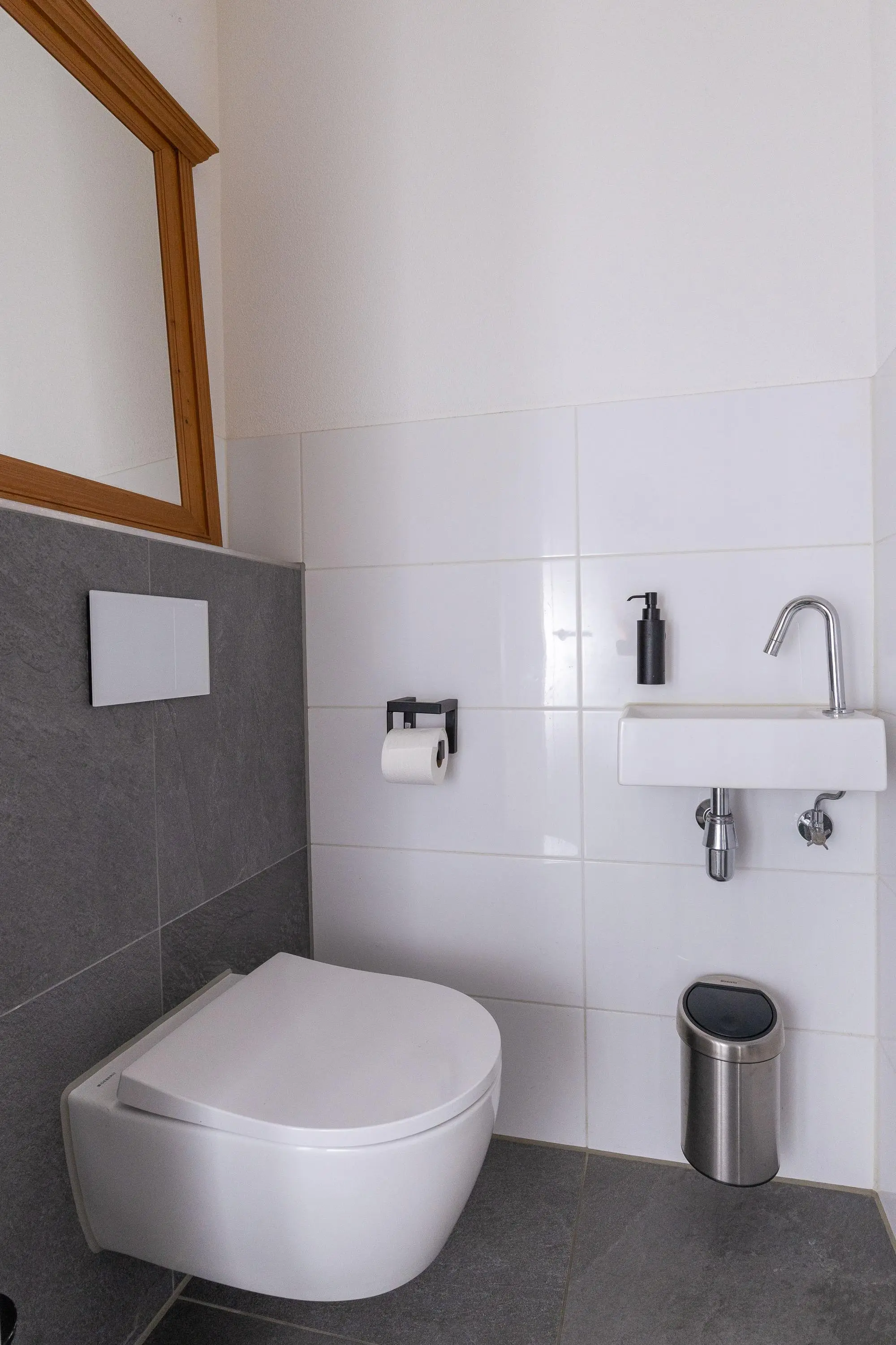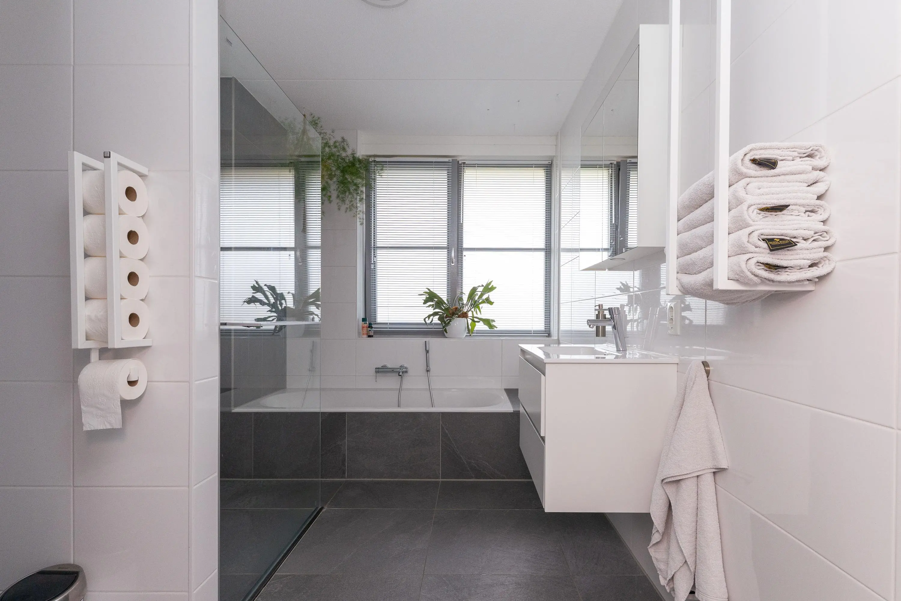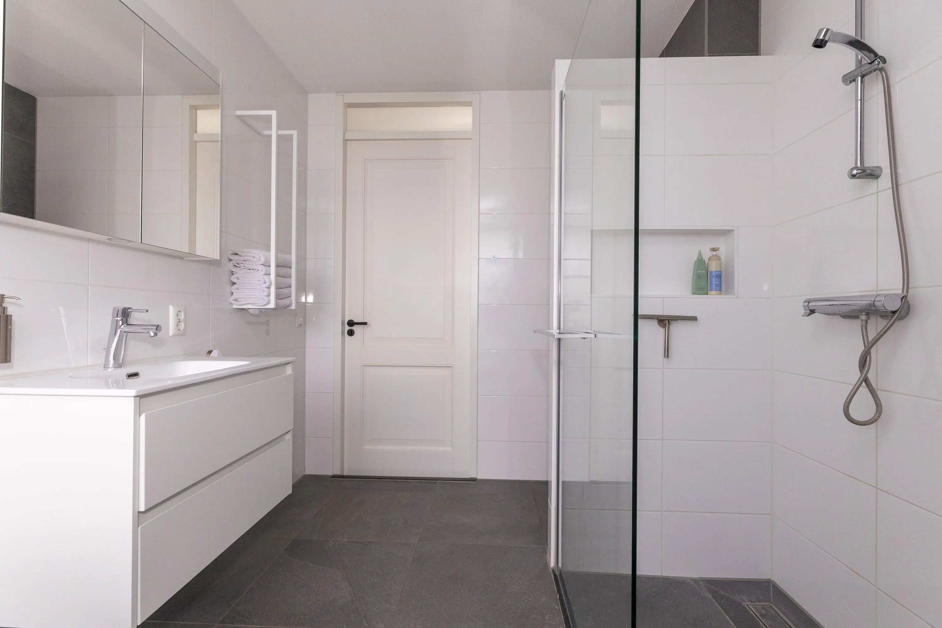 De luxe en fraai afgewerkte badkamer is een echte wellness-oase met een inloopdouche, een ligbad, een stijlvol badkamermeubel en een modern toilet. Voor extra comfort is de gehele verdieping voorzien van vloerverwarming, wat zorgt voor een aangename warmte, zelfs op koude dagen.
