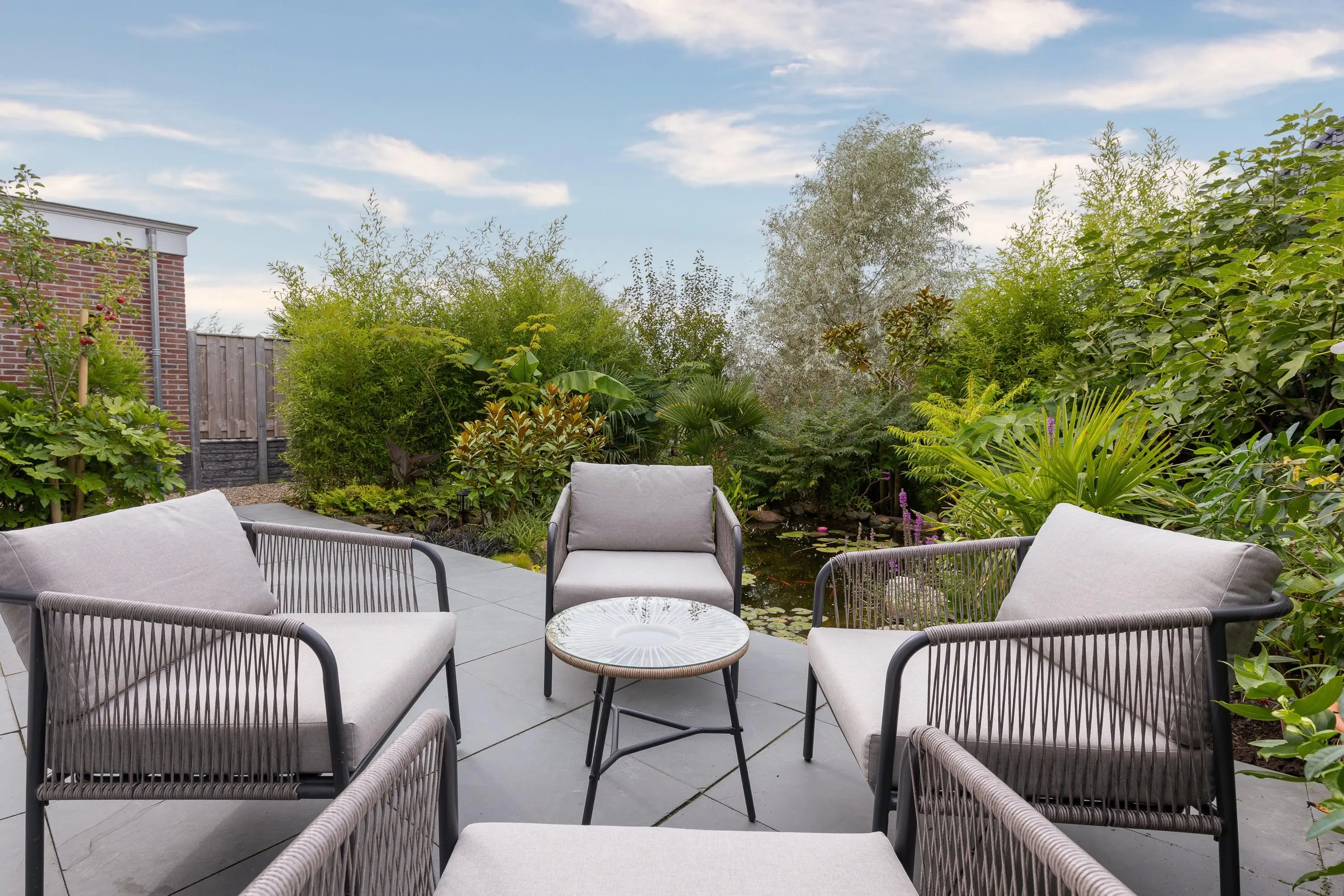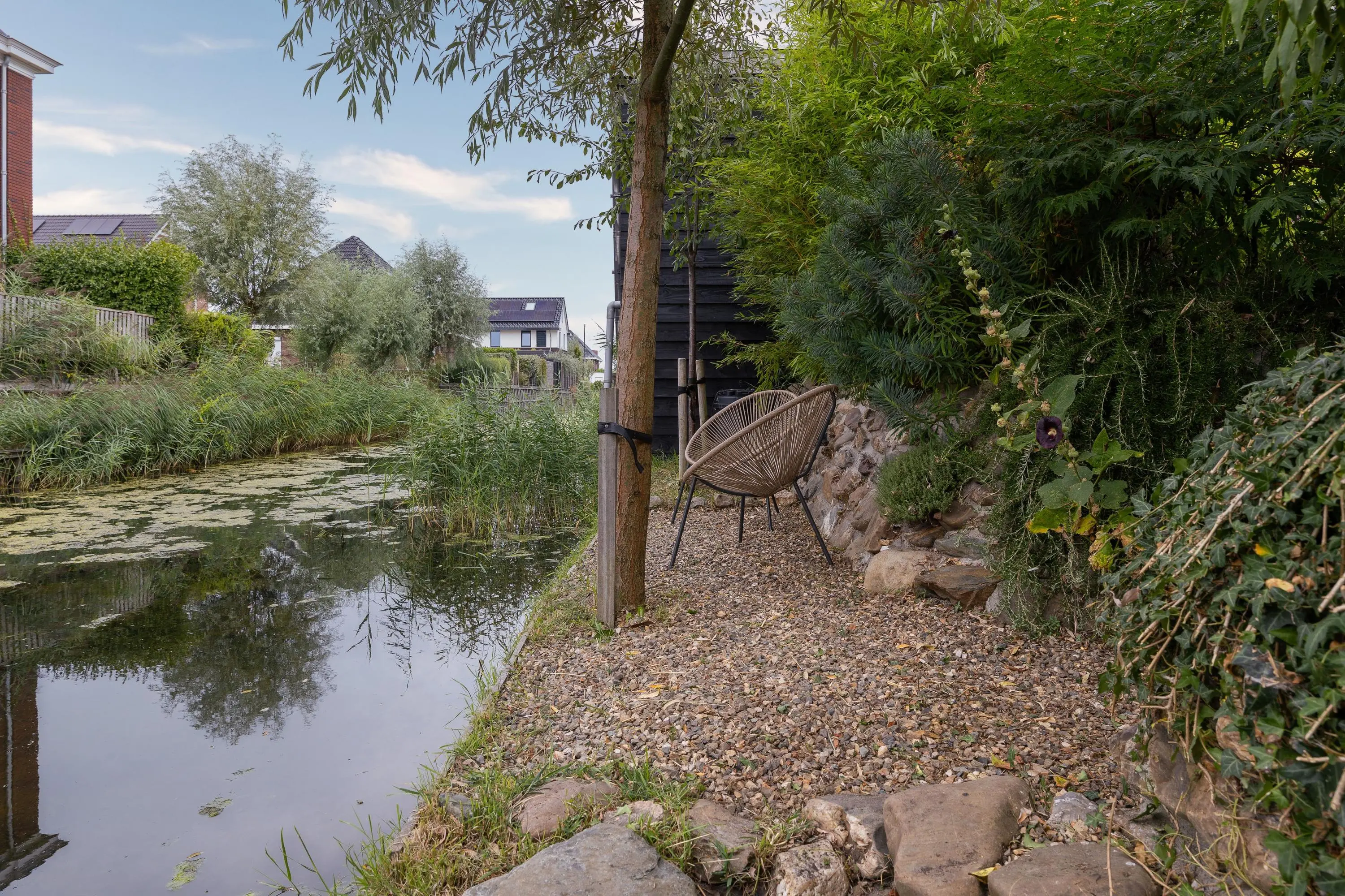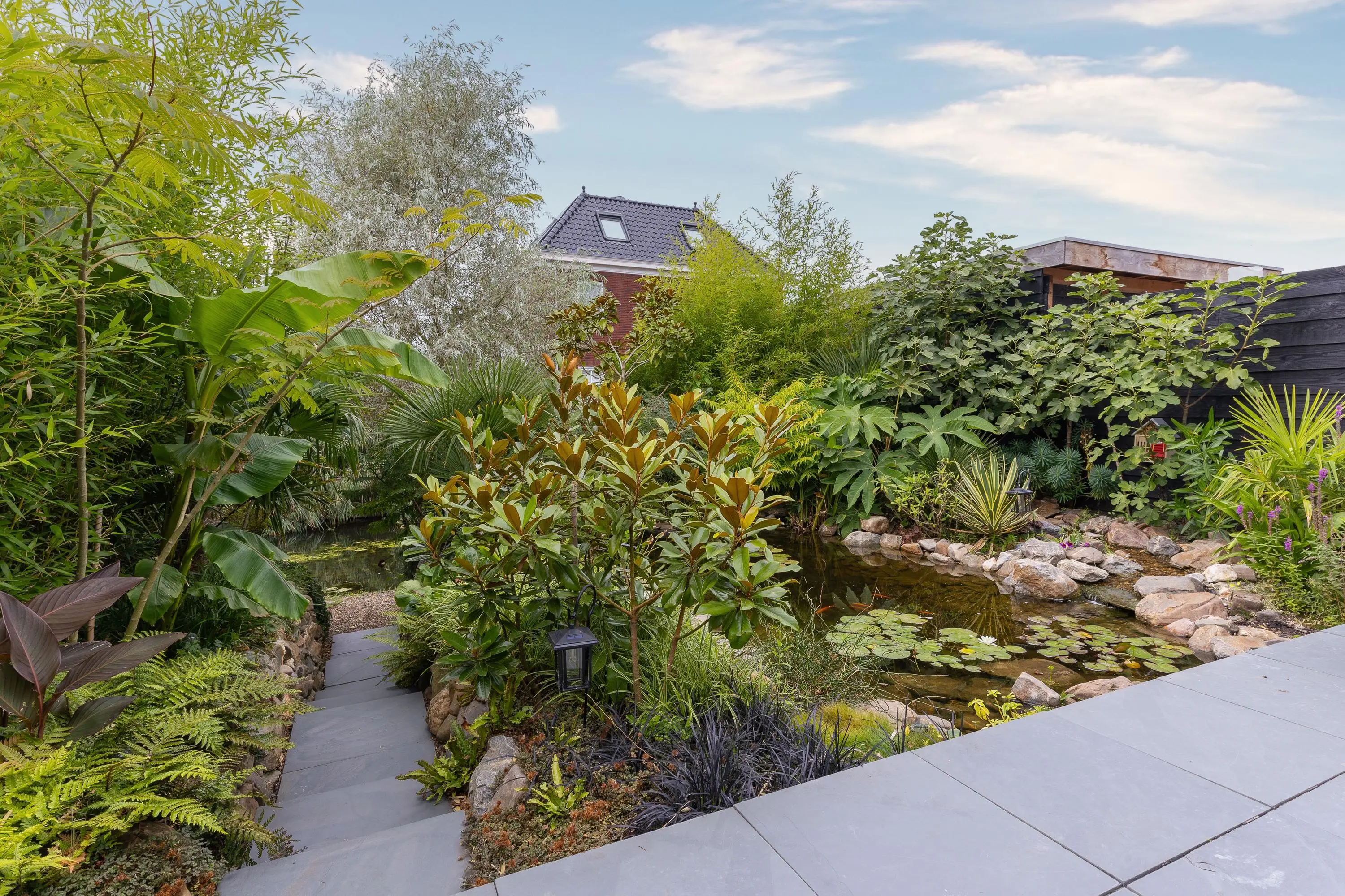 De fraai aangelegde tuin is een echte blikvanger met een rustgevende vijver en smaakvolle beplanting die een mediterrane sfeer oproept – alsof je in het buitenland bent. Gelegen aan het water en op het westen georiënteerd, geniet je hier elke avond van de schitterende ondergaande zon. Een perfecte plek om te ontspannen, te borrelen met vrienden of gewoon te genieten van de natuur en het water.