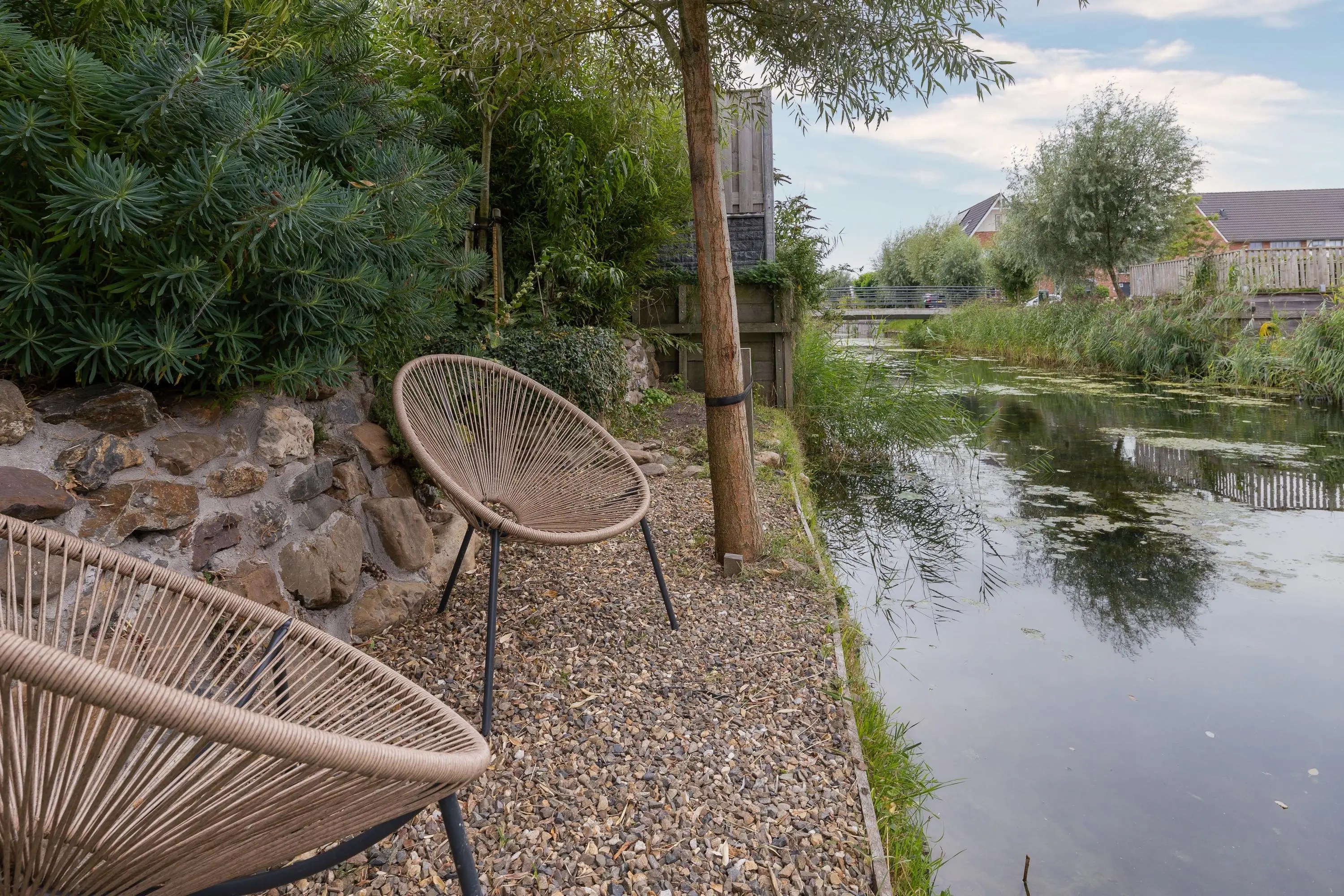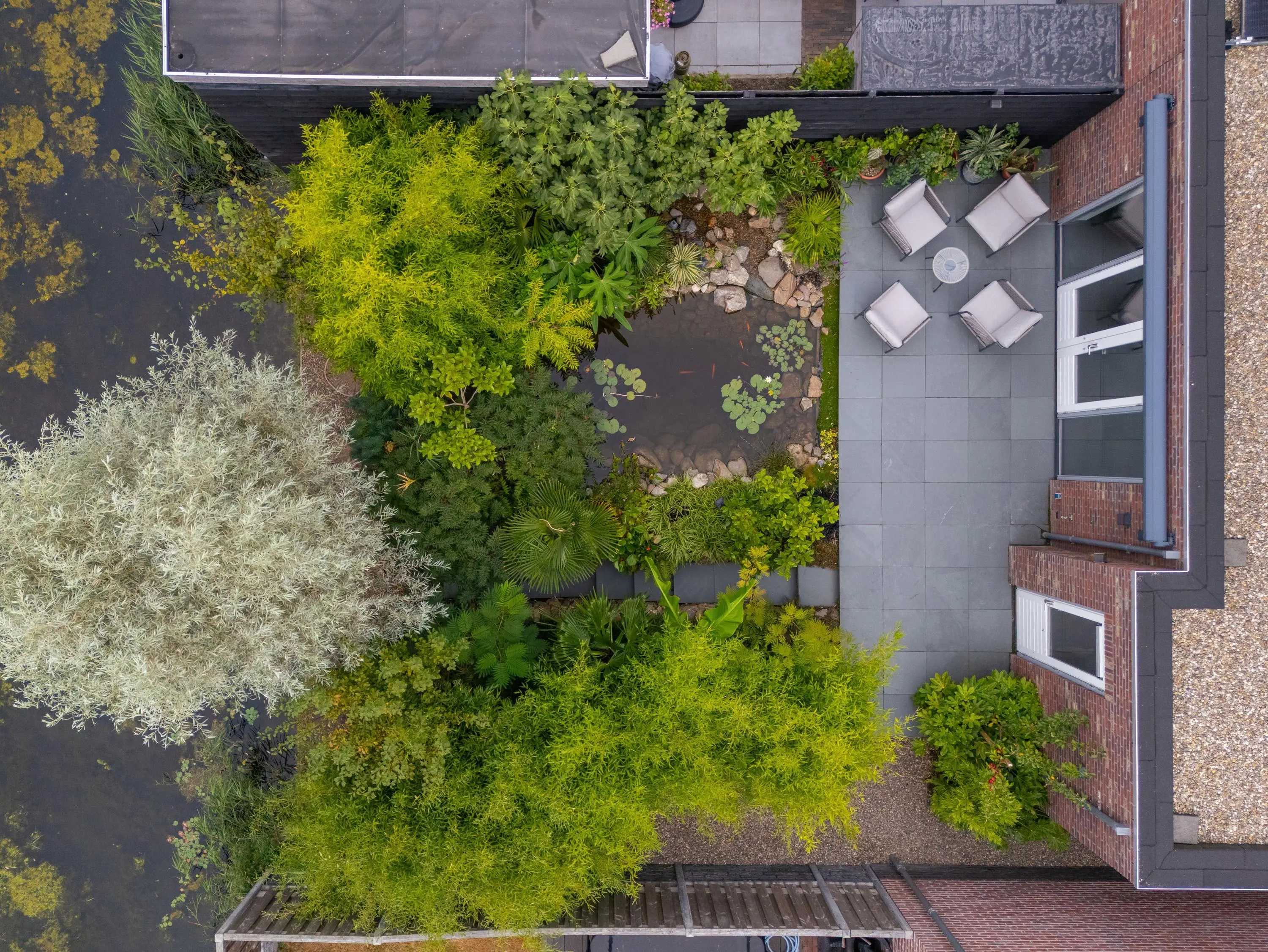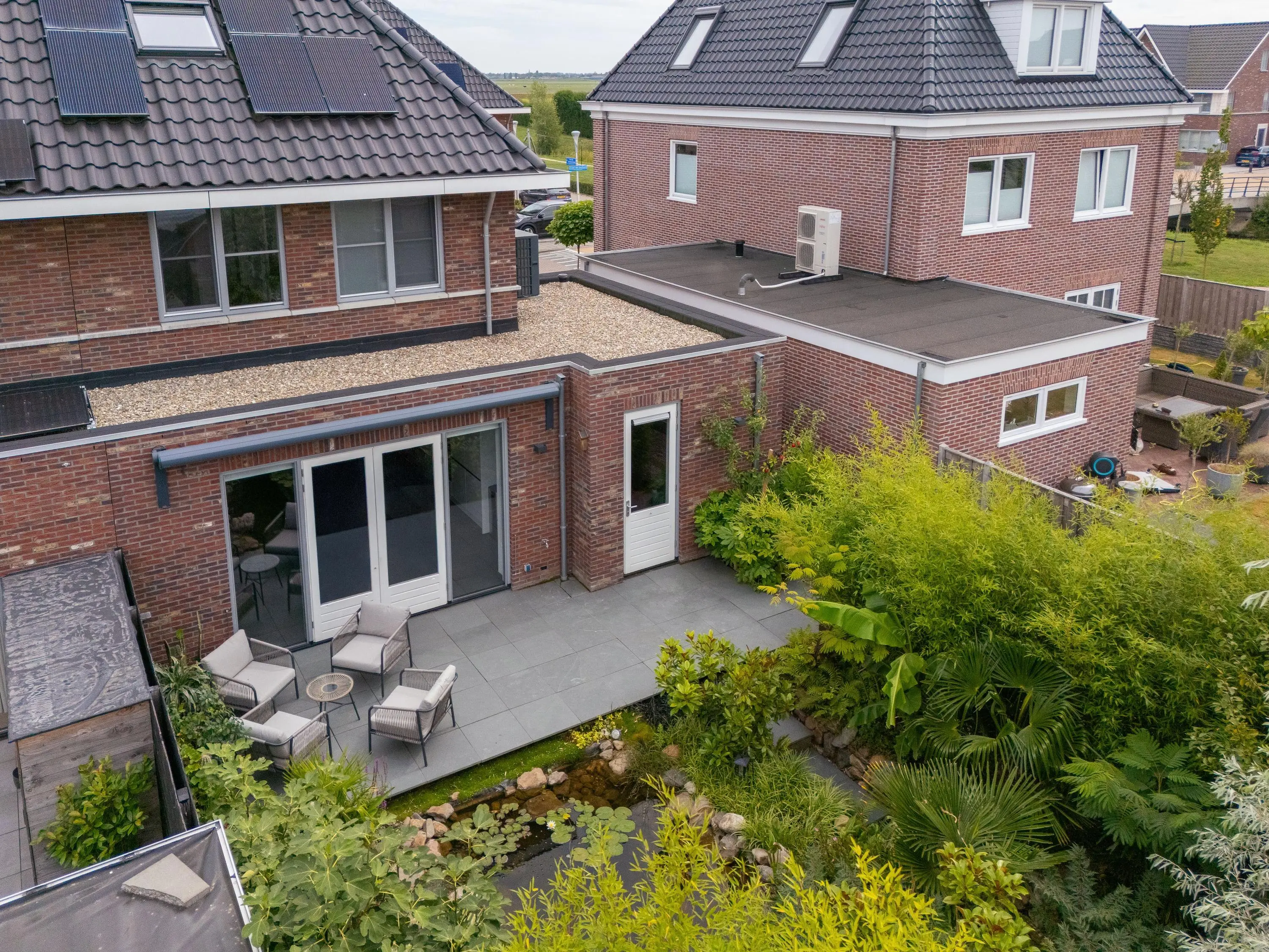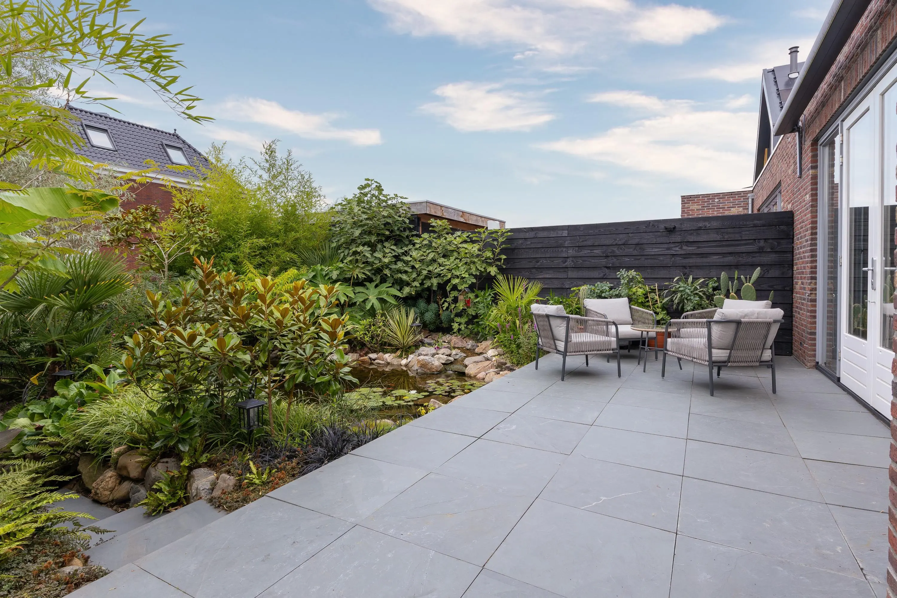 De fraai aangelegde tuin is een echte blikvanger met een rustgevende vijver en smaakvolle beplanting die een mediterrane sfeer oproept – alsof je in het buitenland bent. Gelegen aan het water en op het westen georiënteerd, geniet je hier elke avond van de schitterende ondergaande zon. Een perfecte plek om te ontspannen, te borrelen met vrienden of gewoon te genieten van de natuur en het water.
