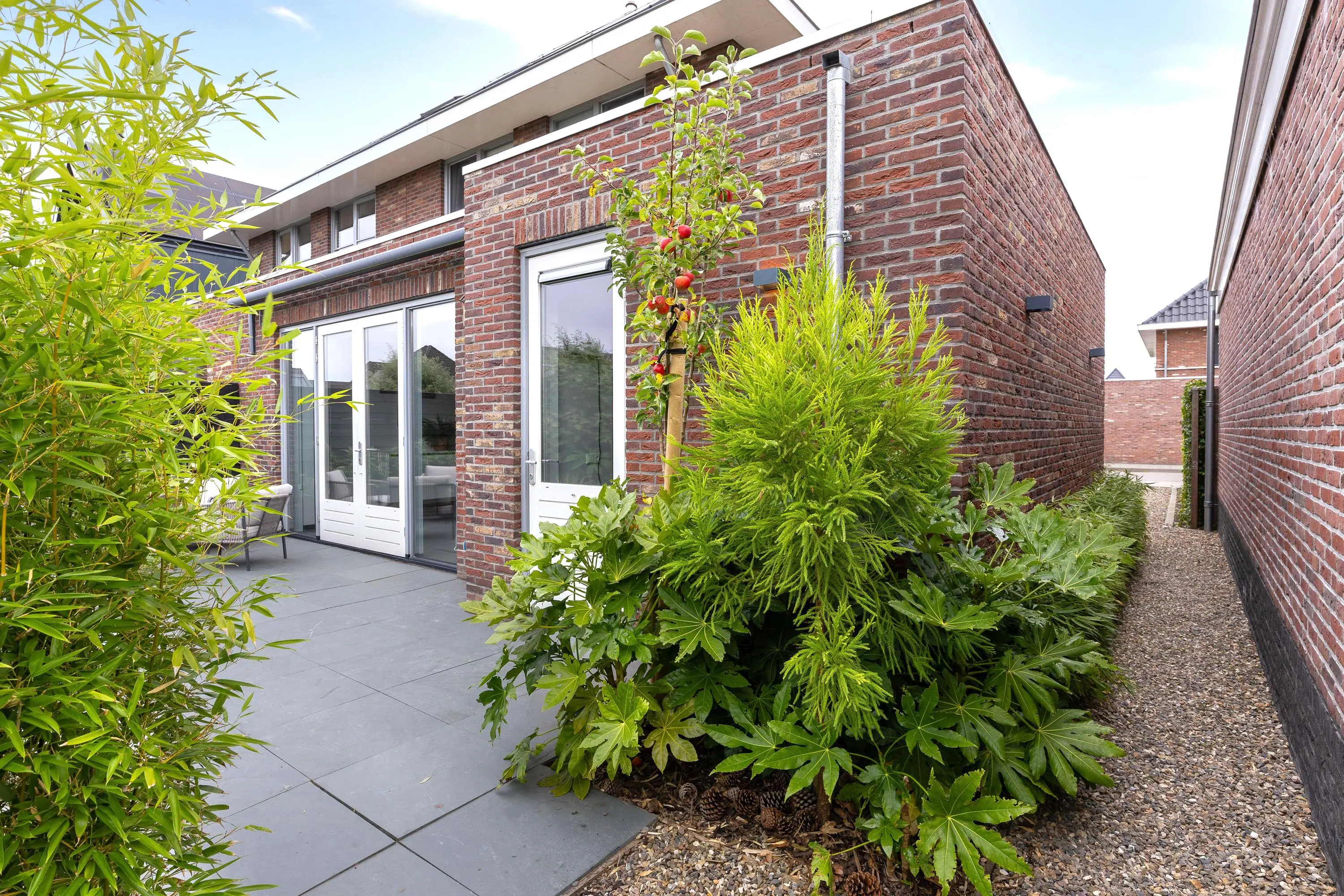 Via de openslaande deuren loop je zo de tuin in, waardoor binnen en buiten naadloos in elkaar overlopen.