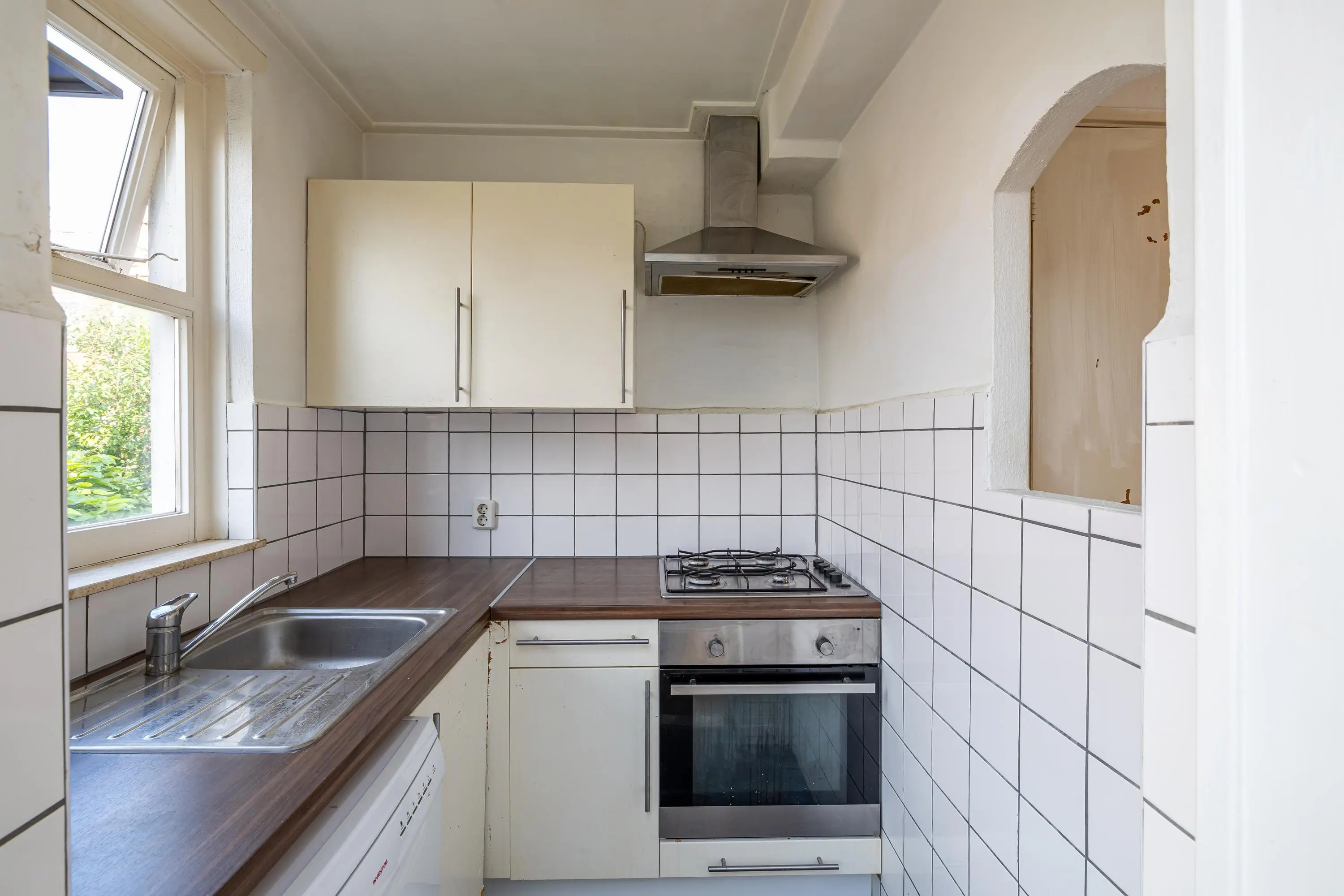 Entree/hal, royale en lichte woon-eetkamer, circa. 30m², met veel leefruimte dankzij het doorgetrokken balkon. Vanuit de woonkamer is er een open doorgang naar de keuken, voorzien van 4-pits gaskookplaat, afzuigkap en oven.