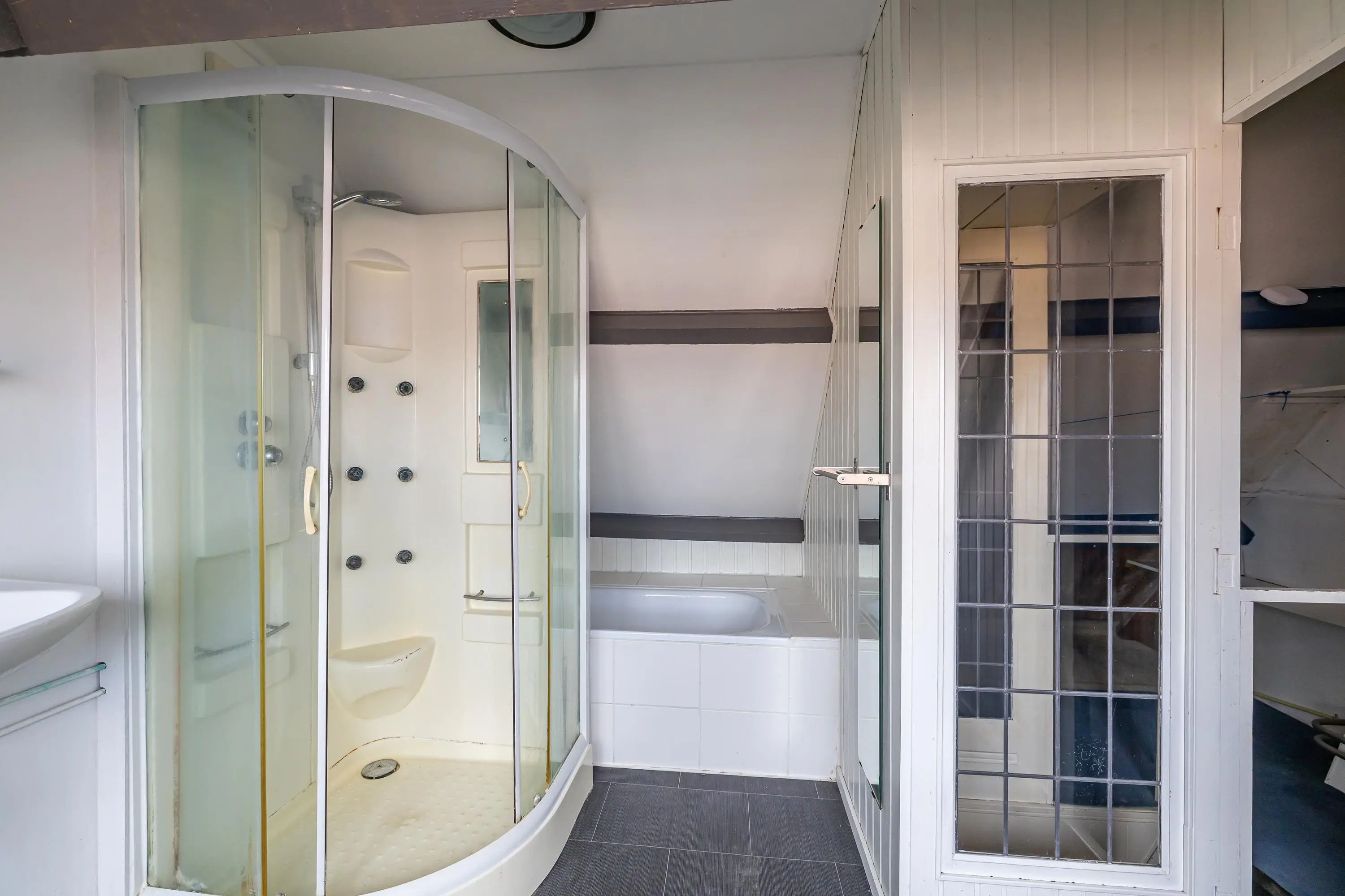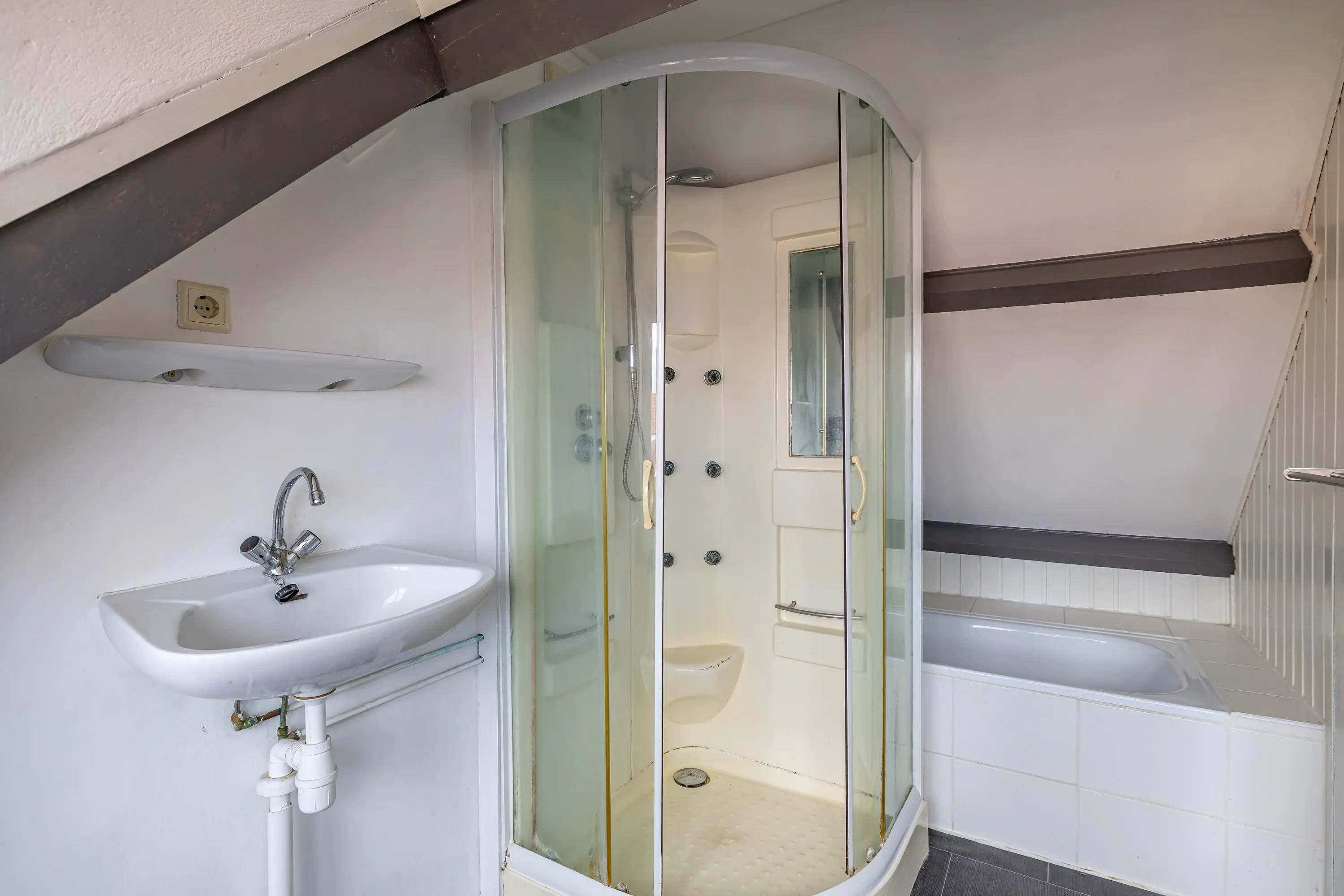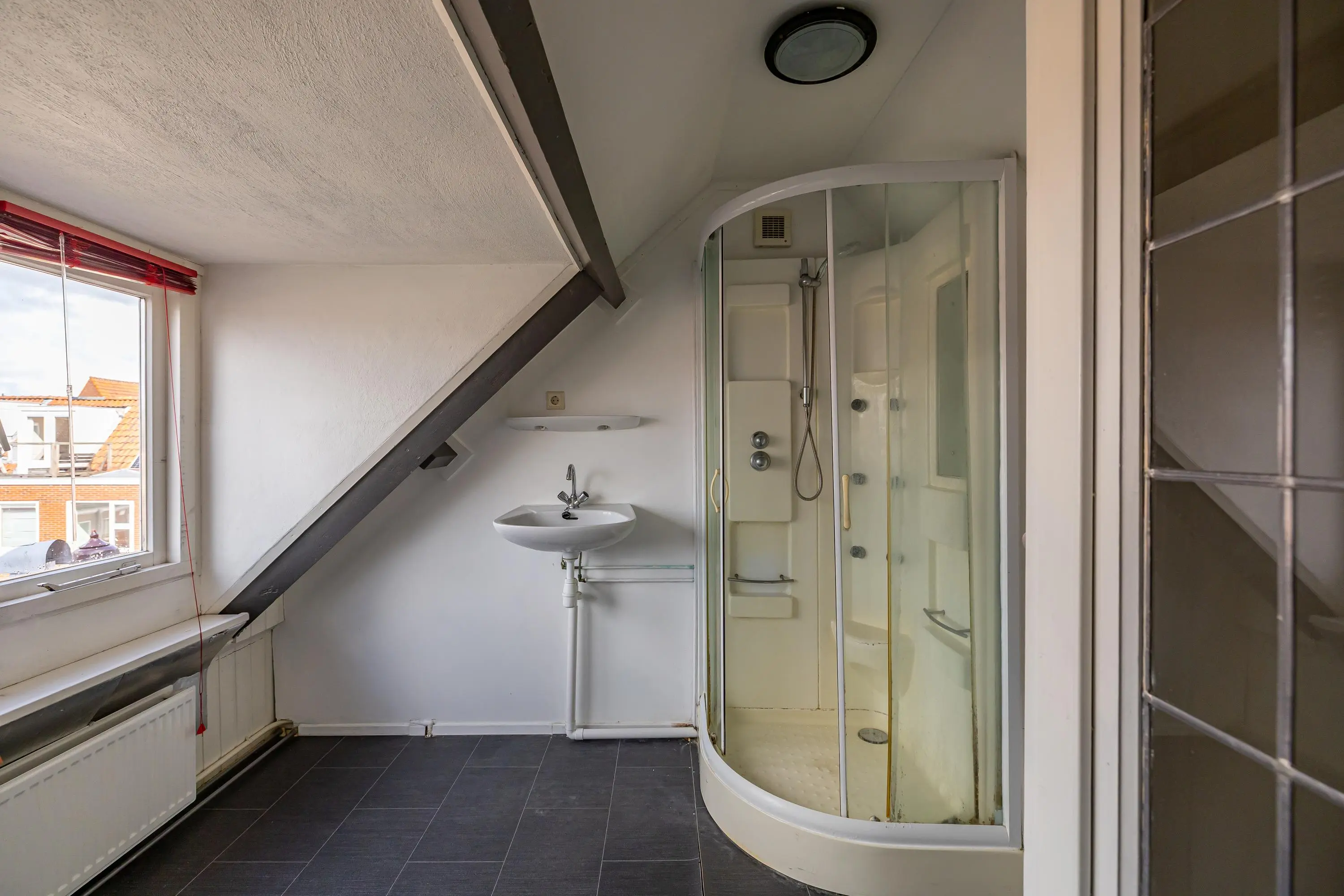Royale zolderverdieping met veel lichtinval door een dakkapel en volop bergruimte. Hier bevindt zich de badkamer met ligbad, aparte douche en wastafel.