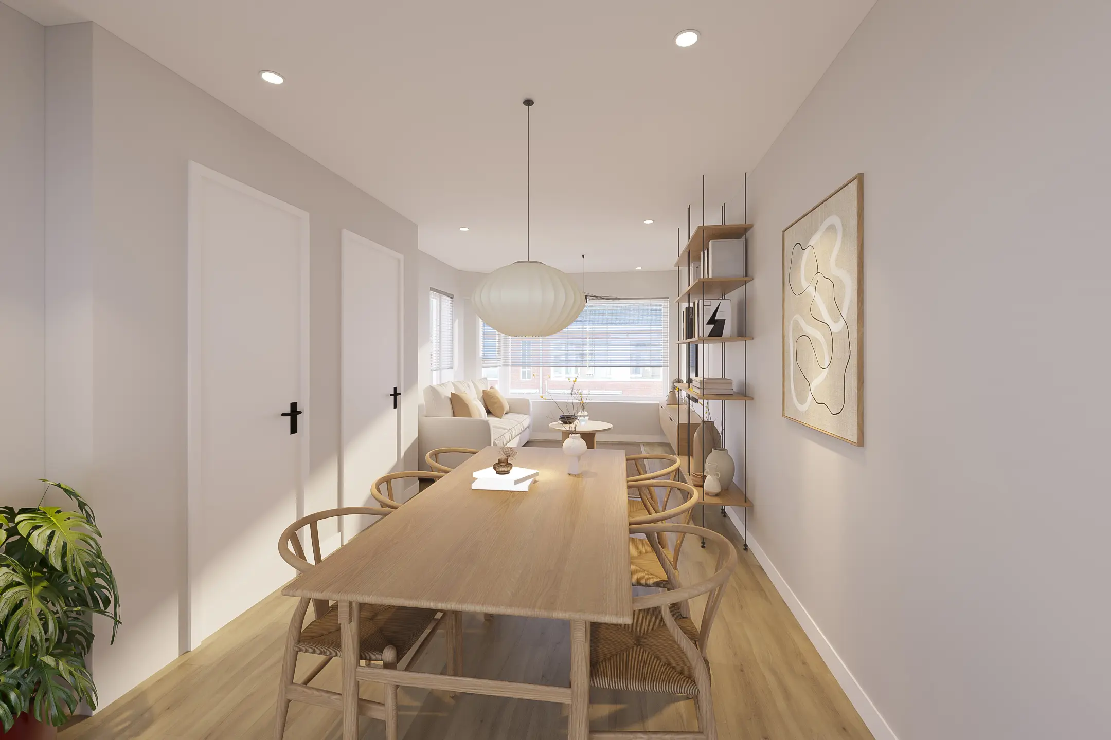 Dankzij het doorgetrokken balkon beschikt de woning over een royale en lichte living. De authentieke jaren ’30-details zijn nog volop aanwezig, waaronder de schuifdeuren en suite.