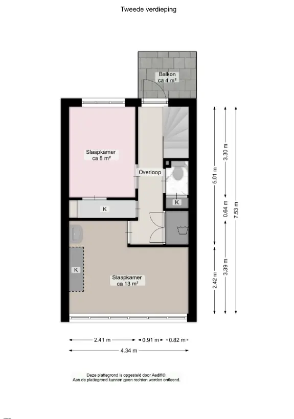 Overloop met toegang tot een zonnig balkon van circa 4m² gelegen op het westen. De slaapkamer aan de voorzijde van circa 13m² heeft sfeervolle raampjes en een vaste kast met wastafel; De achterste slaapkamer van circa 8m² beschikt over een vaste kast. Op de overloop bevind zich een vaste kast met wasmachineaansluiting en een toilet.