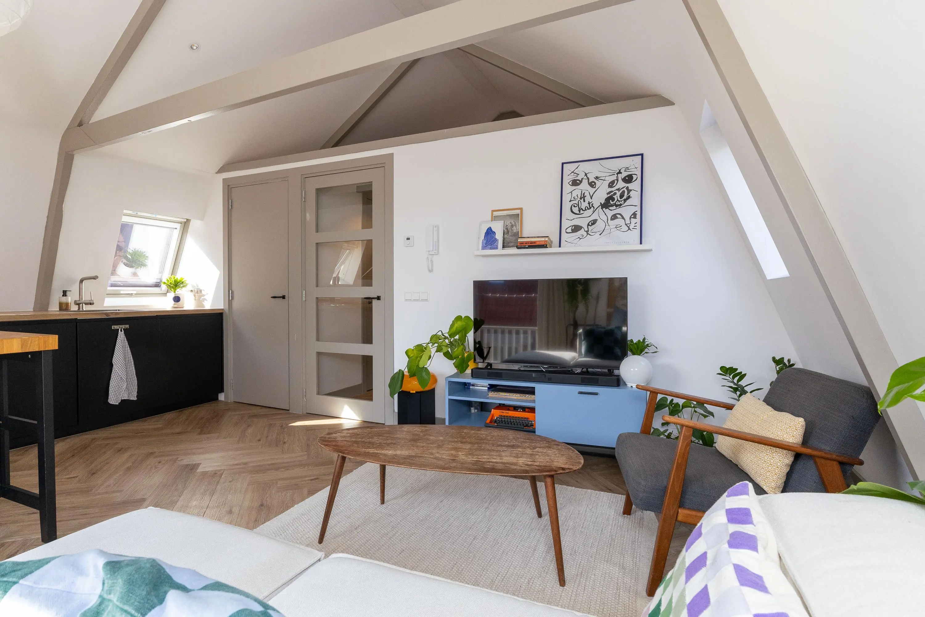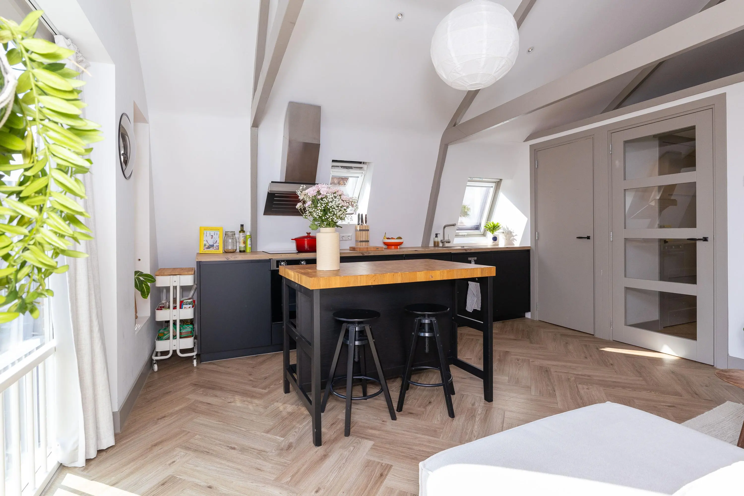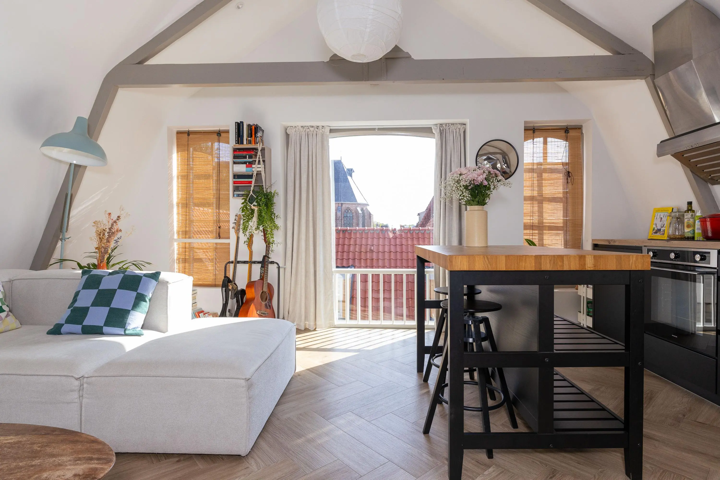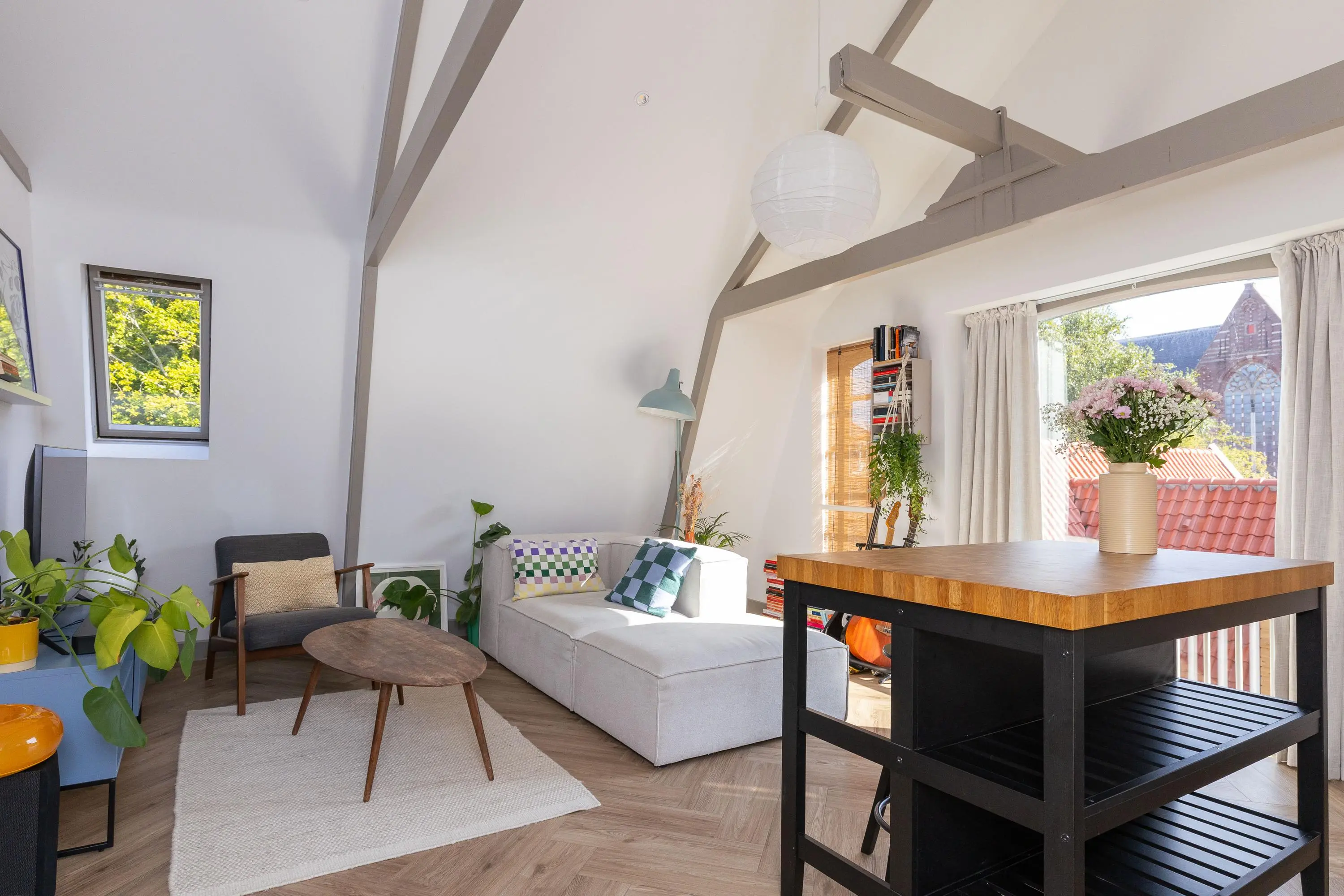 • Sfeervolle woonkamer met veel licht en moderne keuken (koelkast, vaatwasser, inductiekookplaat, oven en afzuigkap).