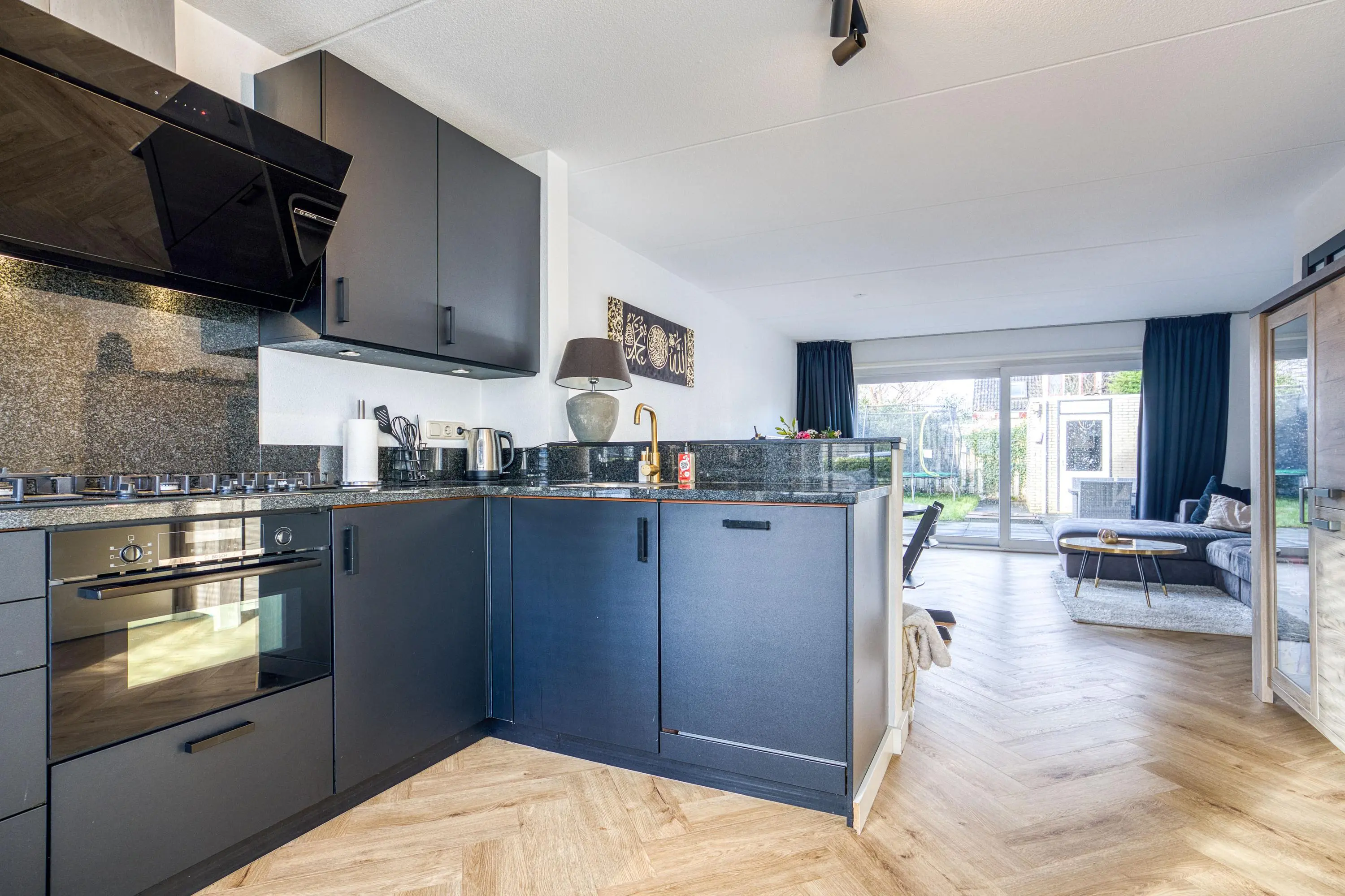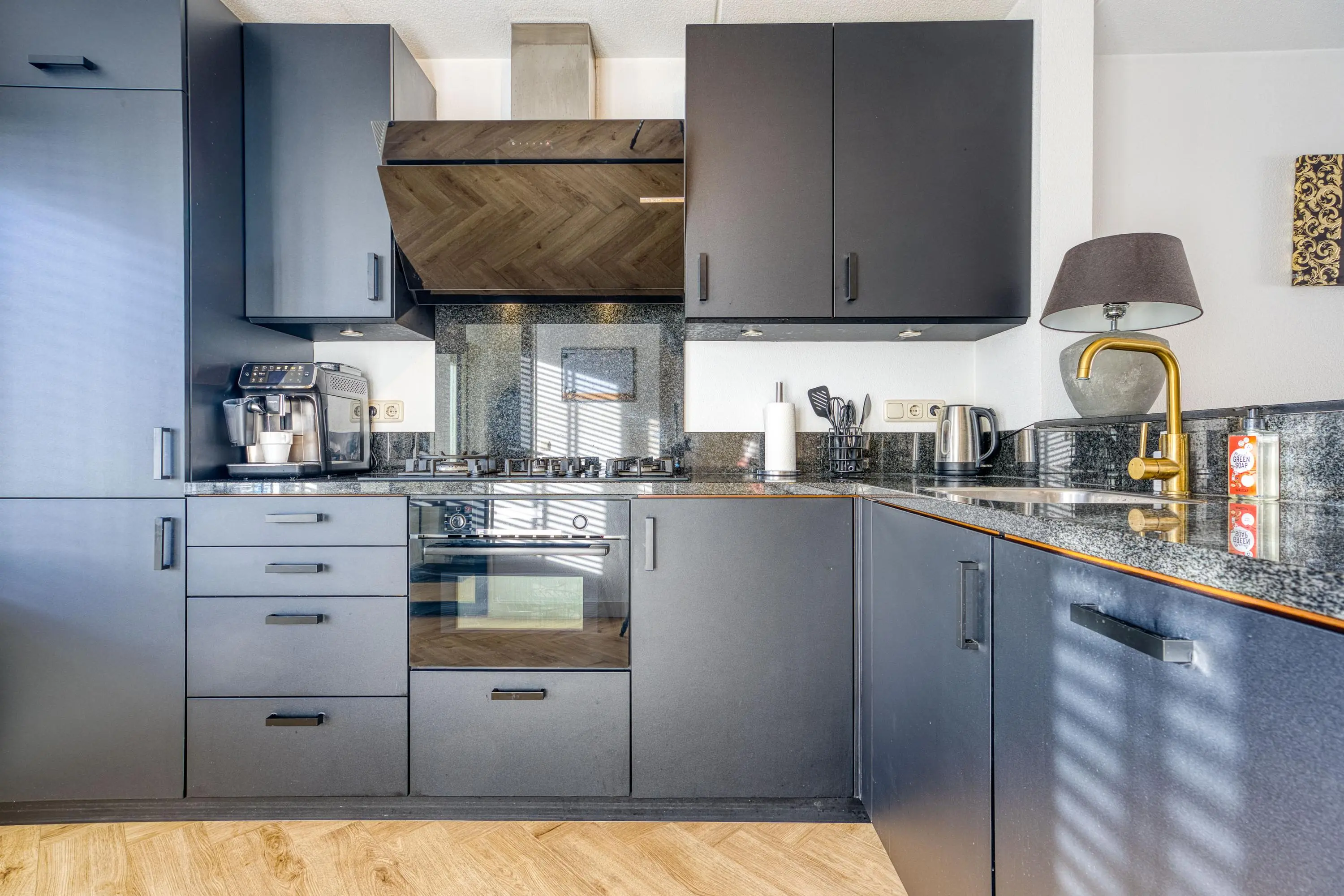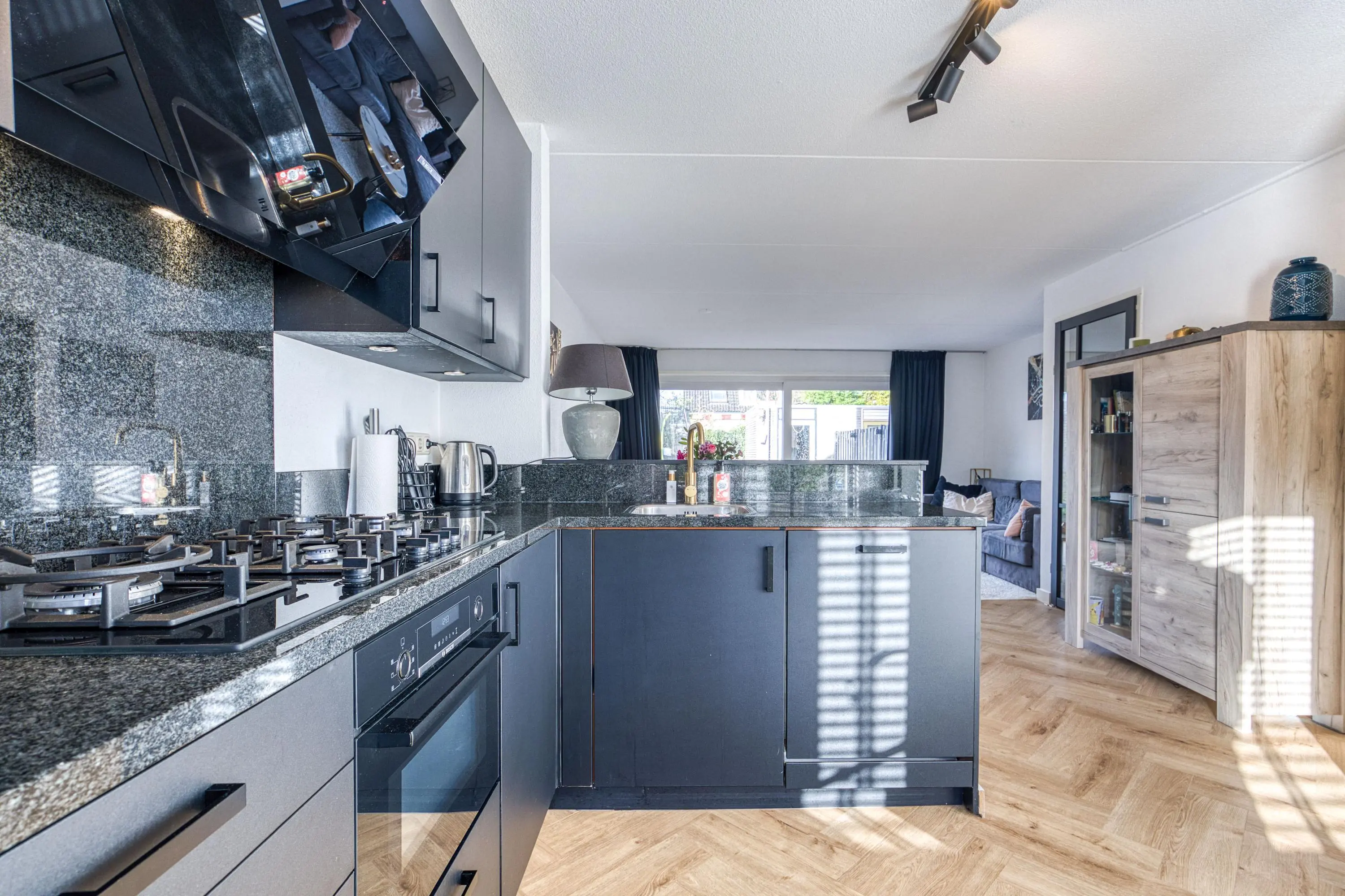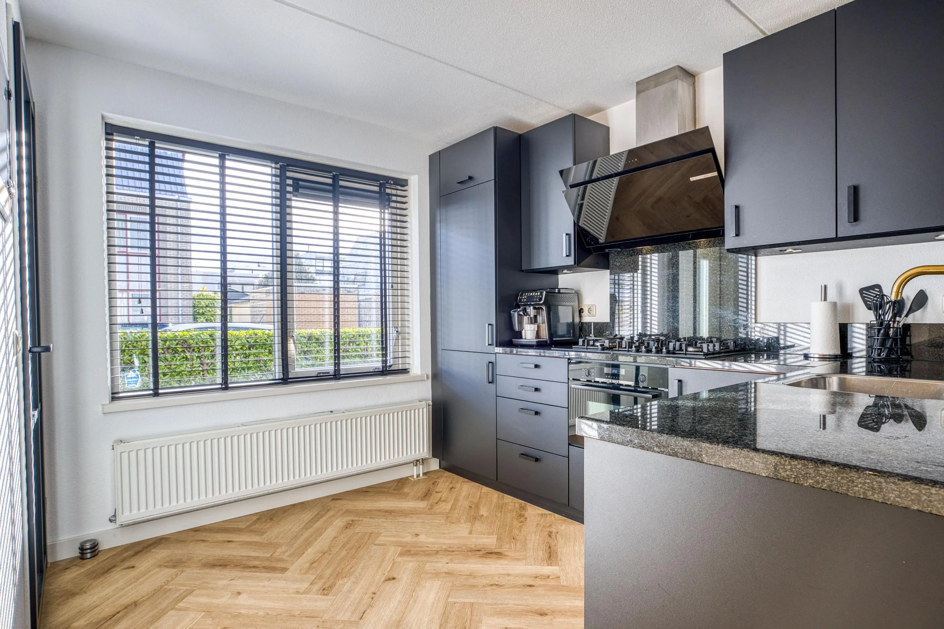 Aan de voorzijde van de woning bevindt zich de moderne keuken, uitgevoerd in een tijdloze stijl en voorzien van diverse inbouwapparatuur. Een praktische en comfortabele ruimte waar koken en wonen mooi samenkomen.