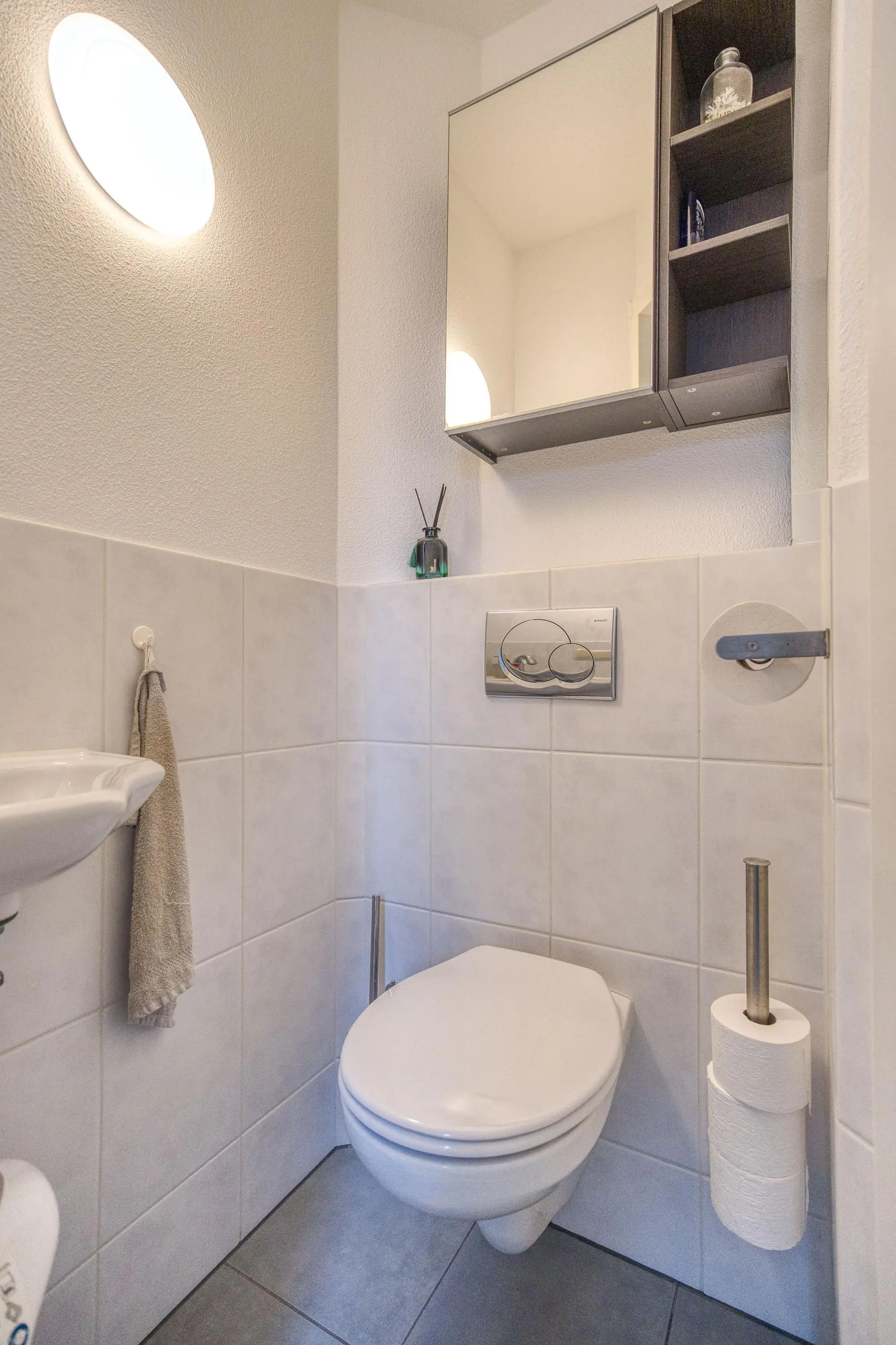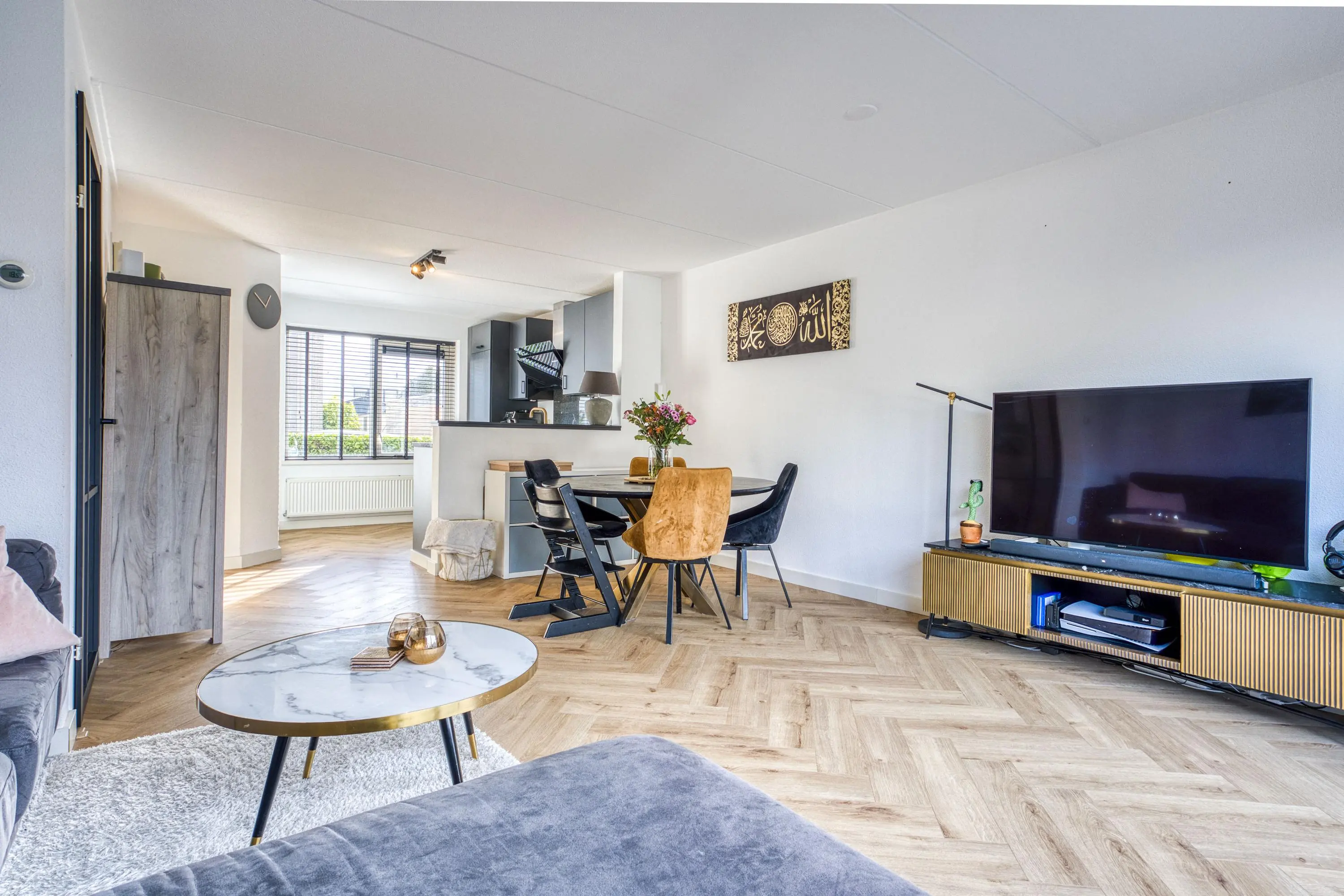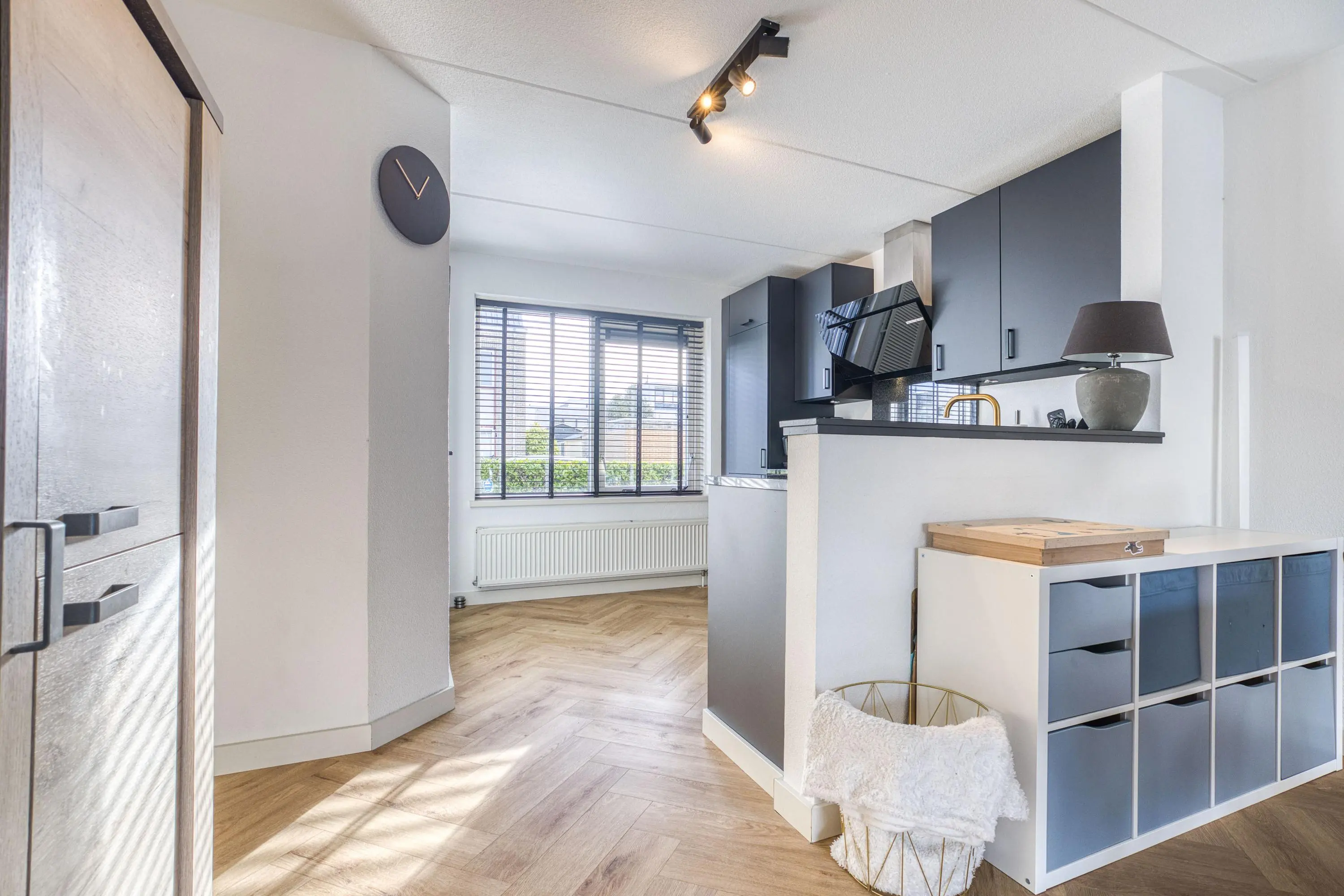 Via de entree kom je in de hal met toiletruimte en toegang tot de woonkamer. De woonkamer is licht en strak afgewerkt en voorzien van een moderne PVC visgraatvloer, wat zorgt voor een warme en eigentijdse uitstraling. Dankzij de grote raampartijen is er veel natuurlijke lichtinval en een prettig contact met de tuin.