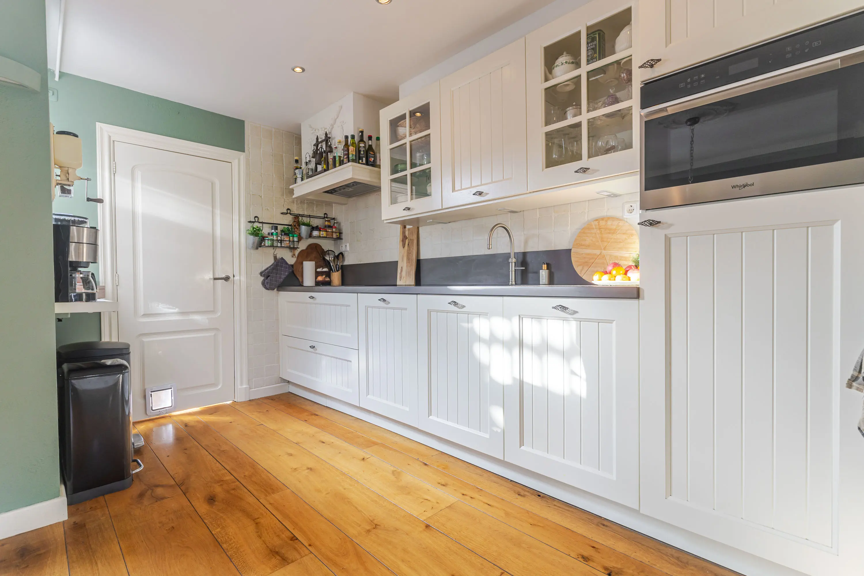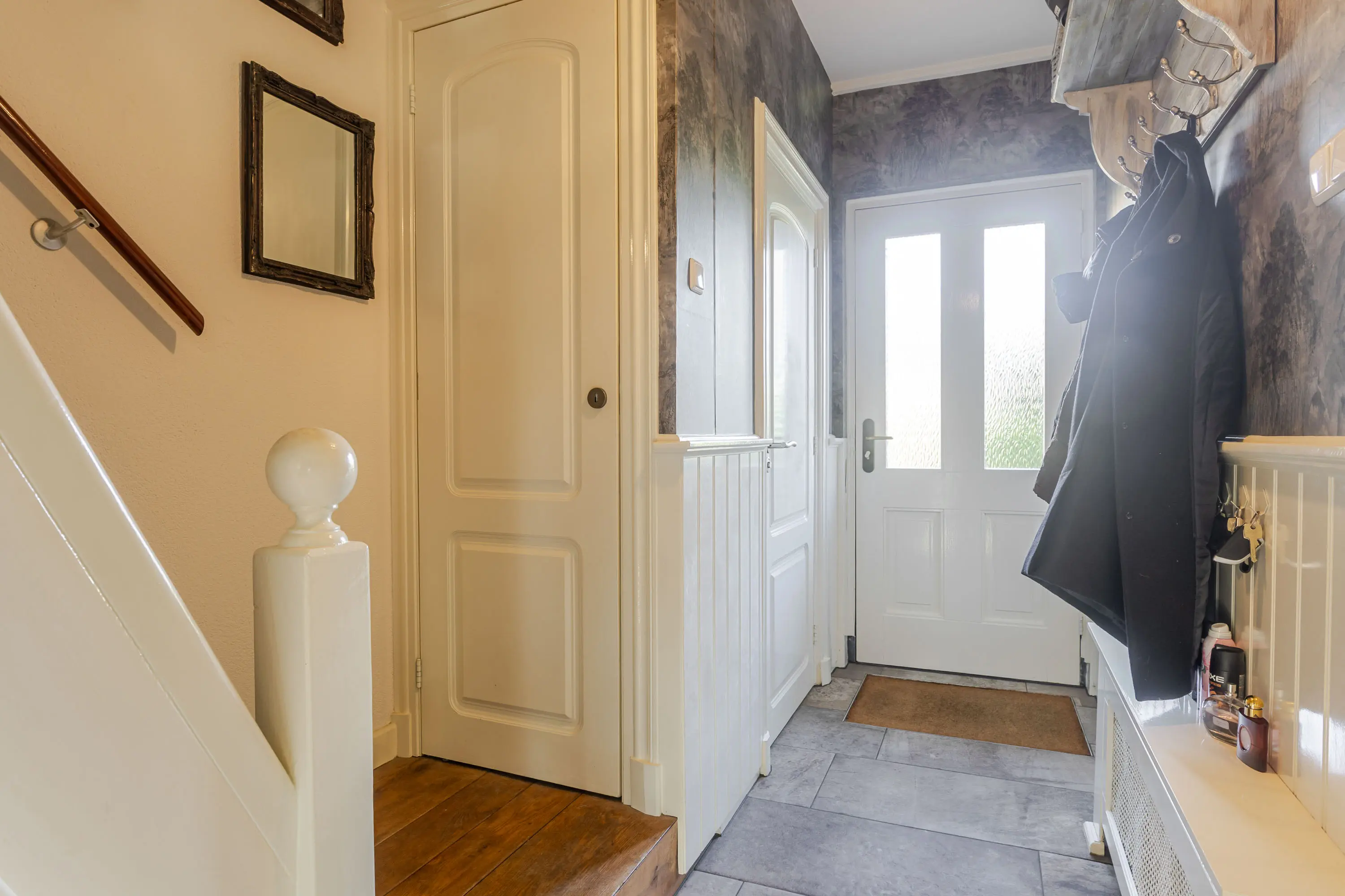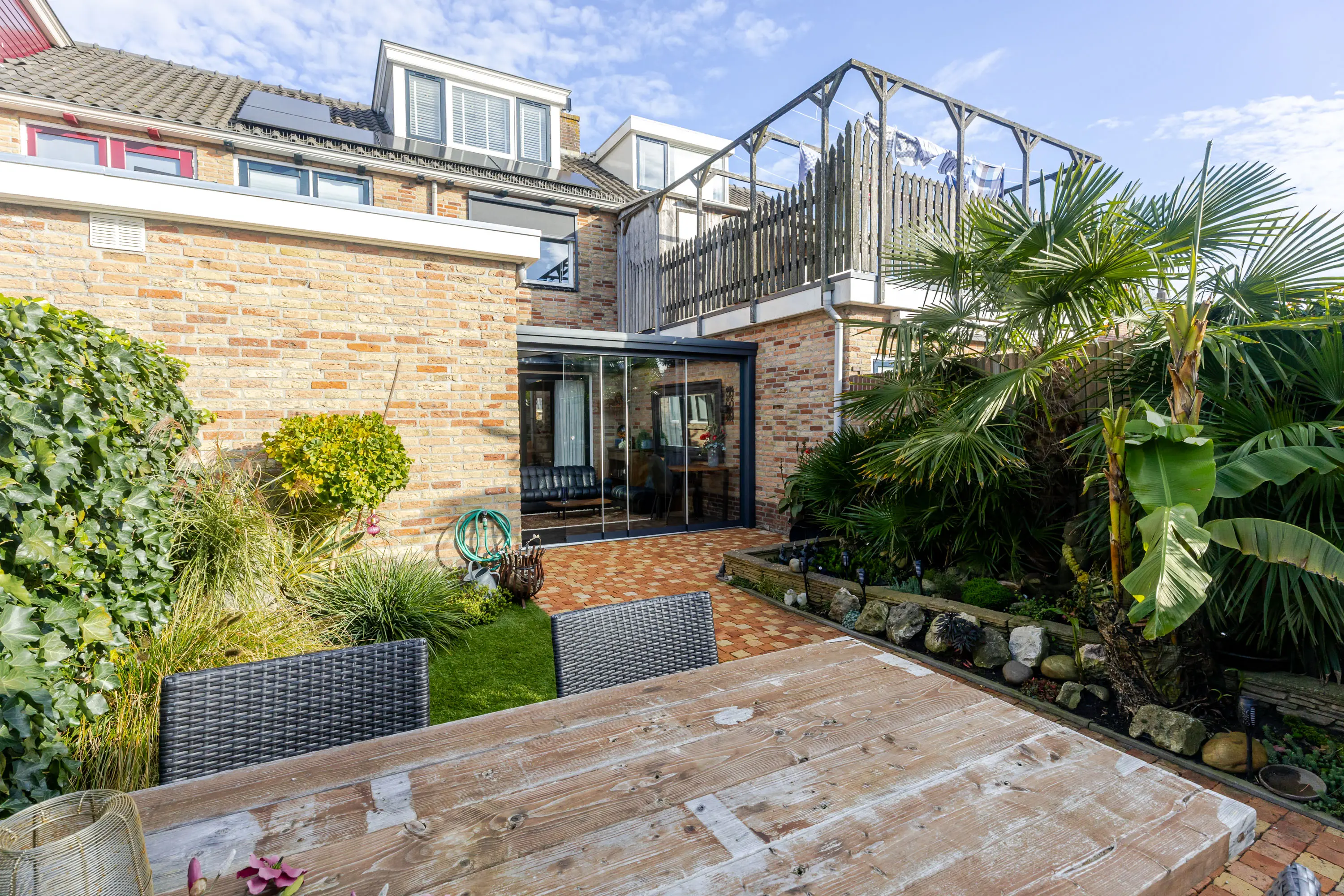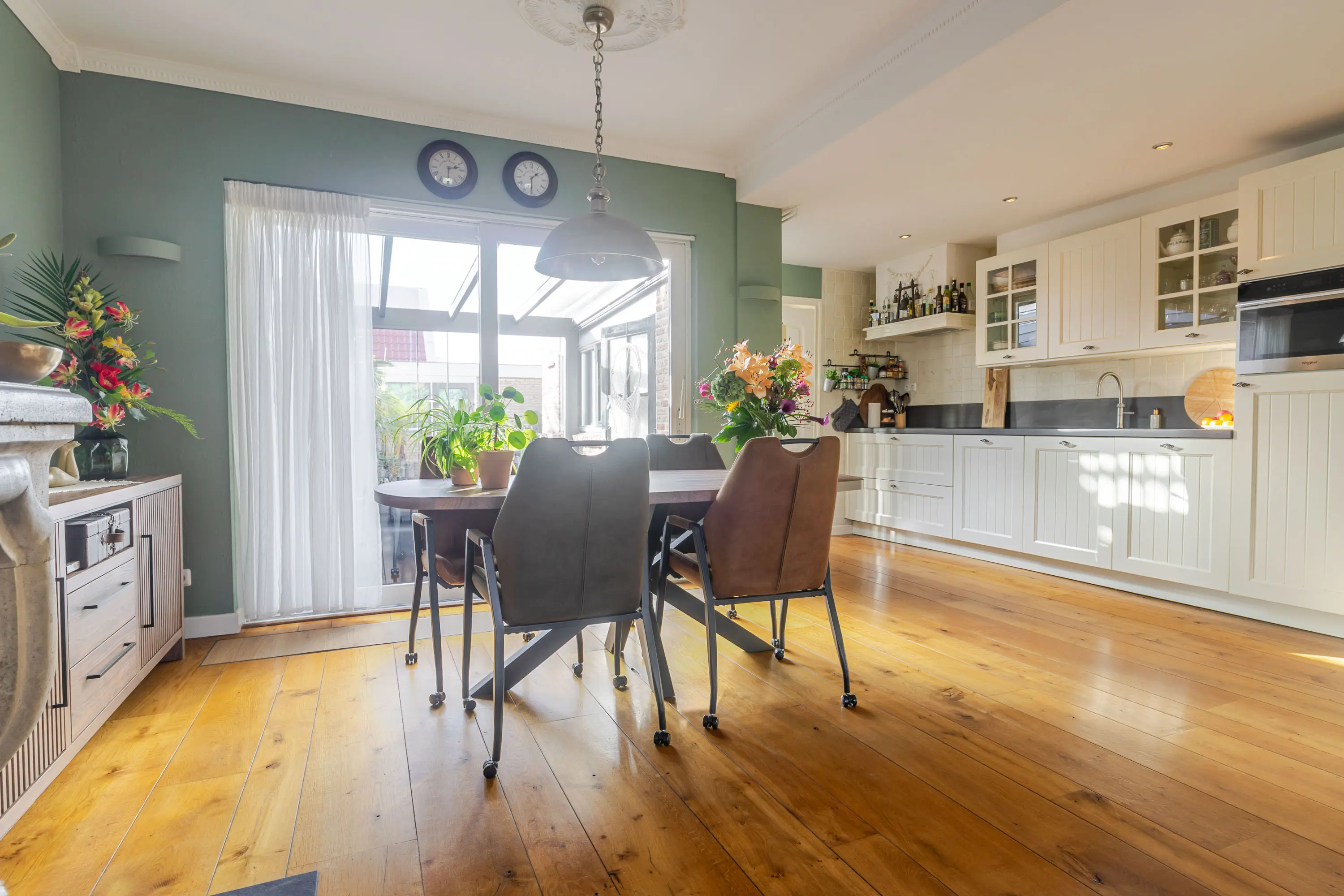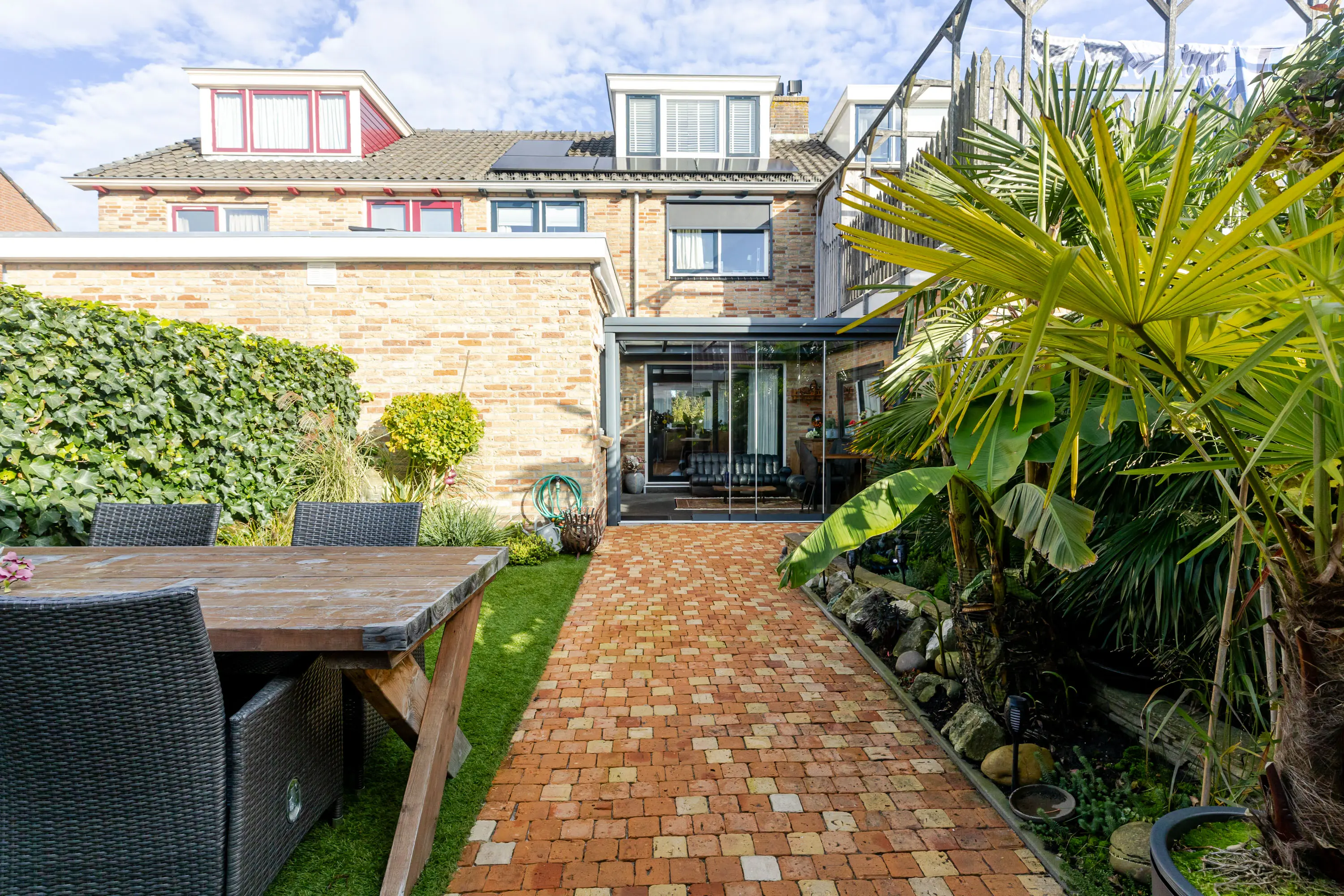Entree, hal, net toilet met hangscloset, meterkast, trapopgang, ruime woonkamer met sfeervolle erker, ruimte voor een grote eettafel, open keuken in een rechte opstelling met koelkast, vaatwasser, inductie kookplaat, combi oven, afzuigkap en een Quooker. Aansluitend de aangebouwde bijkeuken met aansluiting voor de wasmachine en een vaste kast. Via de woonkamer met schuifpui of de bijkeuken is de serre te bereiken. De achtertuin is netjes aangelegd en via de steeg aan de achterzijde te bereiken. Als laatste de ruime vrijstaande berging/schuur.