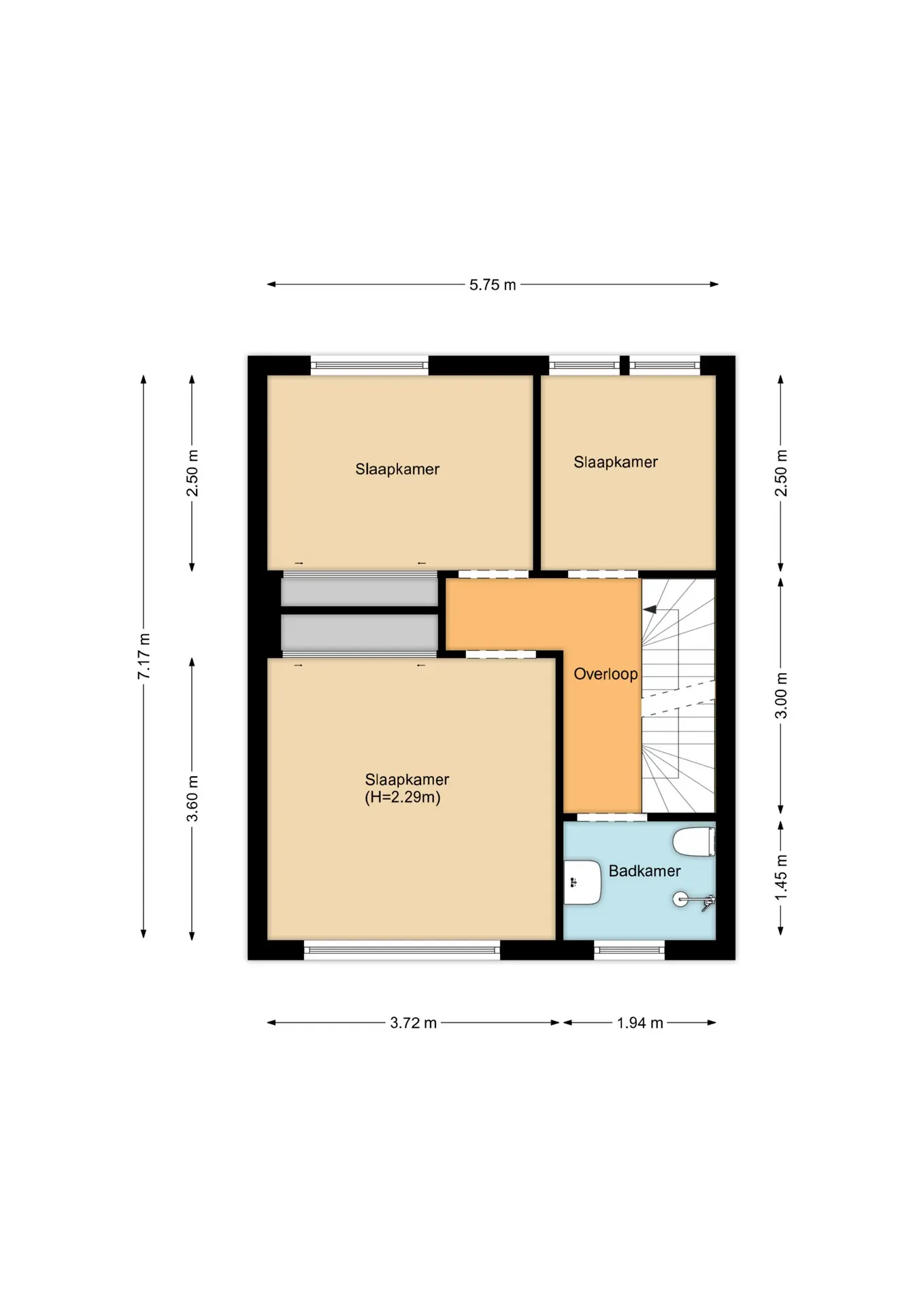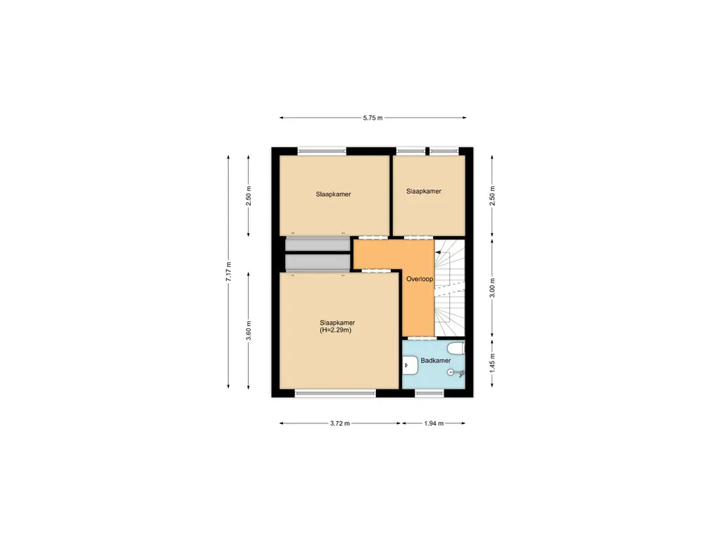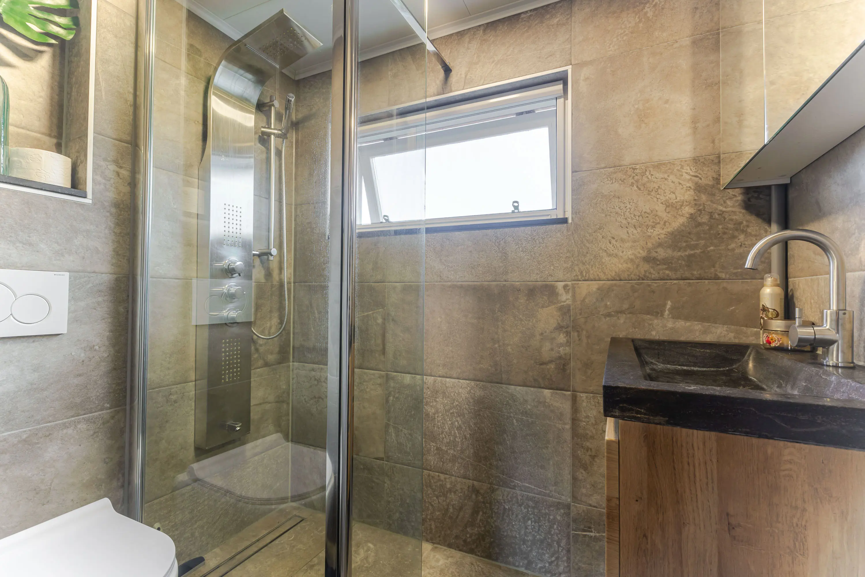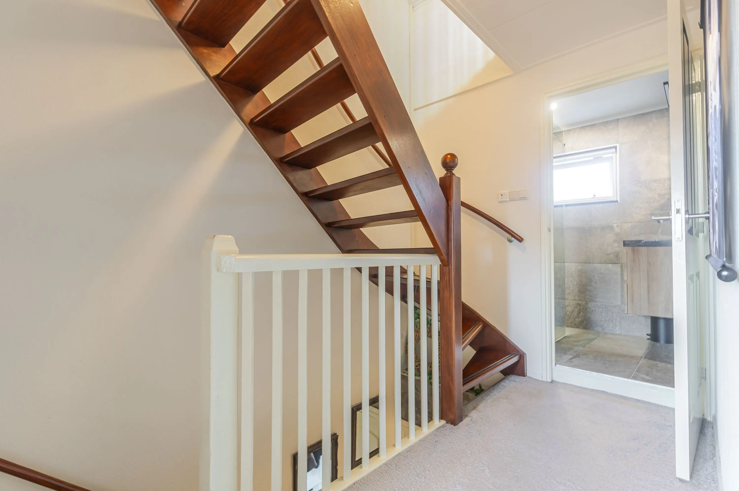 Overloop, 2-tal slaapkamers aan de achterzijde en een slaapkamer aan de voorzijde waarvan een tweetal slaapkamers zijn voorzien van vaste kasten. De luxe badkamer is netjes betegeld en hier treft u een douche, toilet en een wastafel. De gehele 1e verdieping is voorzien van rechte wanden.