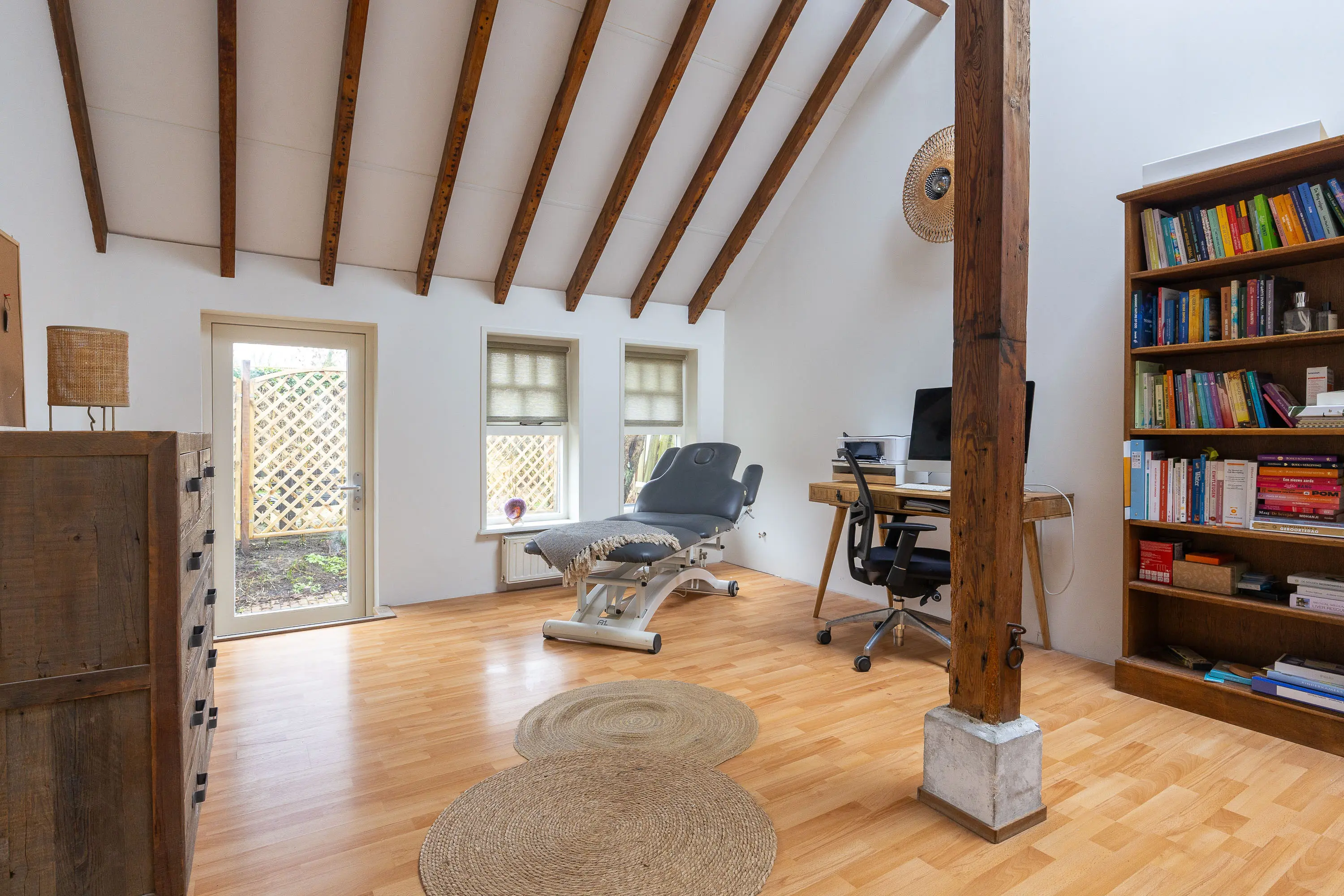 Aan de achterzijde van de woning bereikt u via een aparte hal de badkamer, het toilet en een royale slaapkamer. Deze ruimte is tevens uitstekend geschikt als praktijk aan huis, salon of kantoorruimte. Hiermee behoort levensloopbestendig wonen absoluut tot de mogelijkheden.