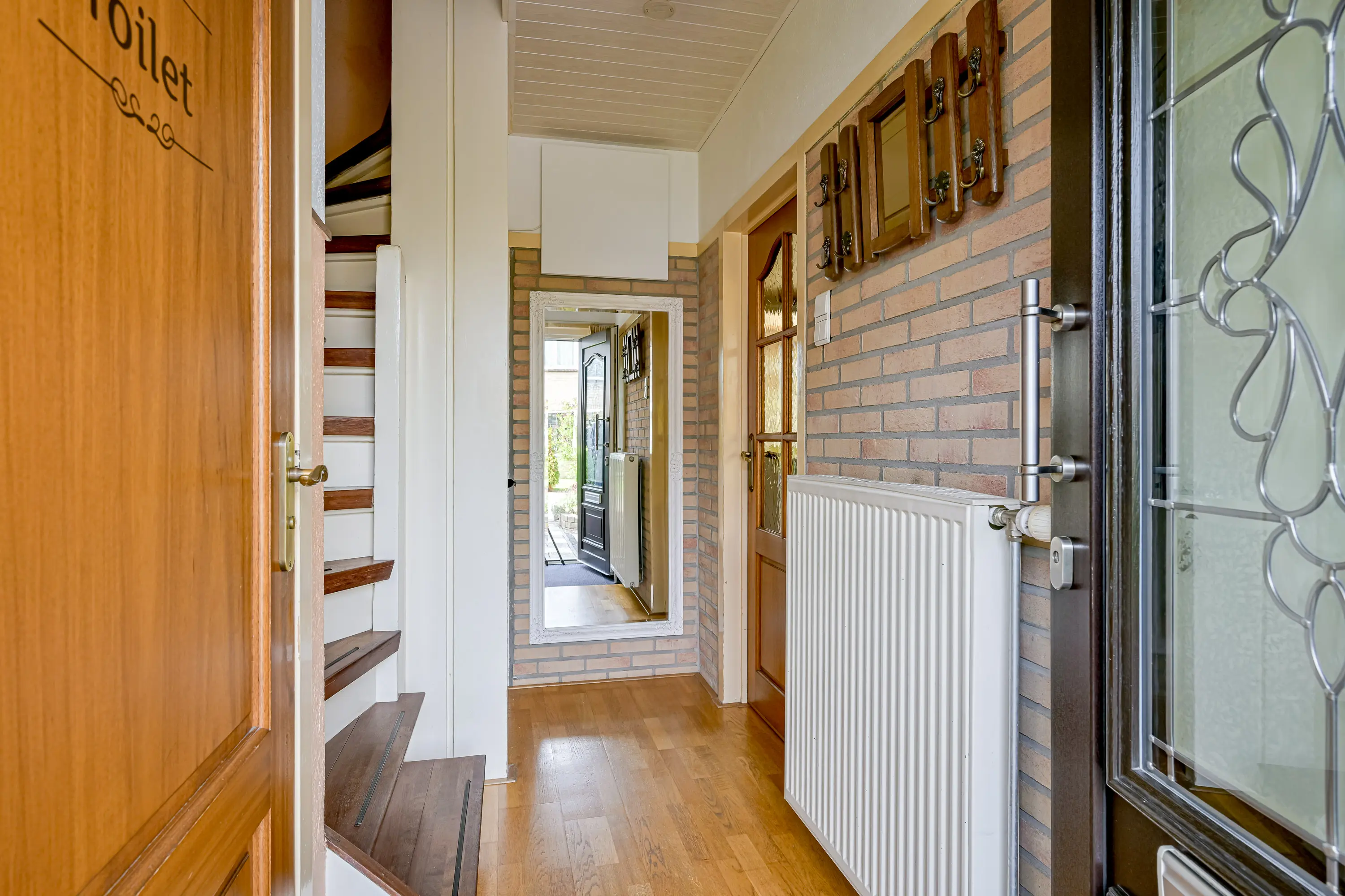 Eerste verdieping: Via de trap bereikt u de 1e etage. Hier vindt u drie ruime slaapkamers welke voorzien zijn van kunststof kozijnen met functionele horren om insecten buiten te houden. De badkamer is keurig onderhouden en voorzien van een wastafel met meubel en een douche.