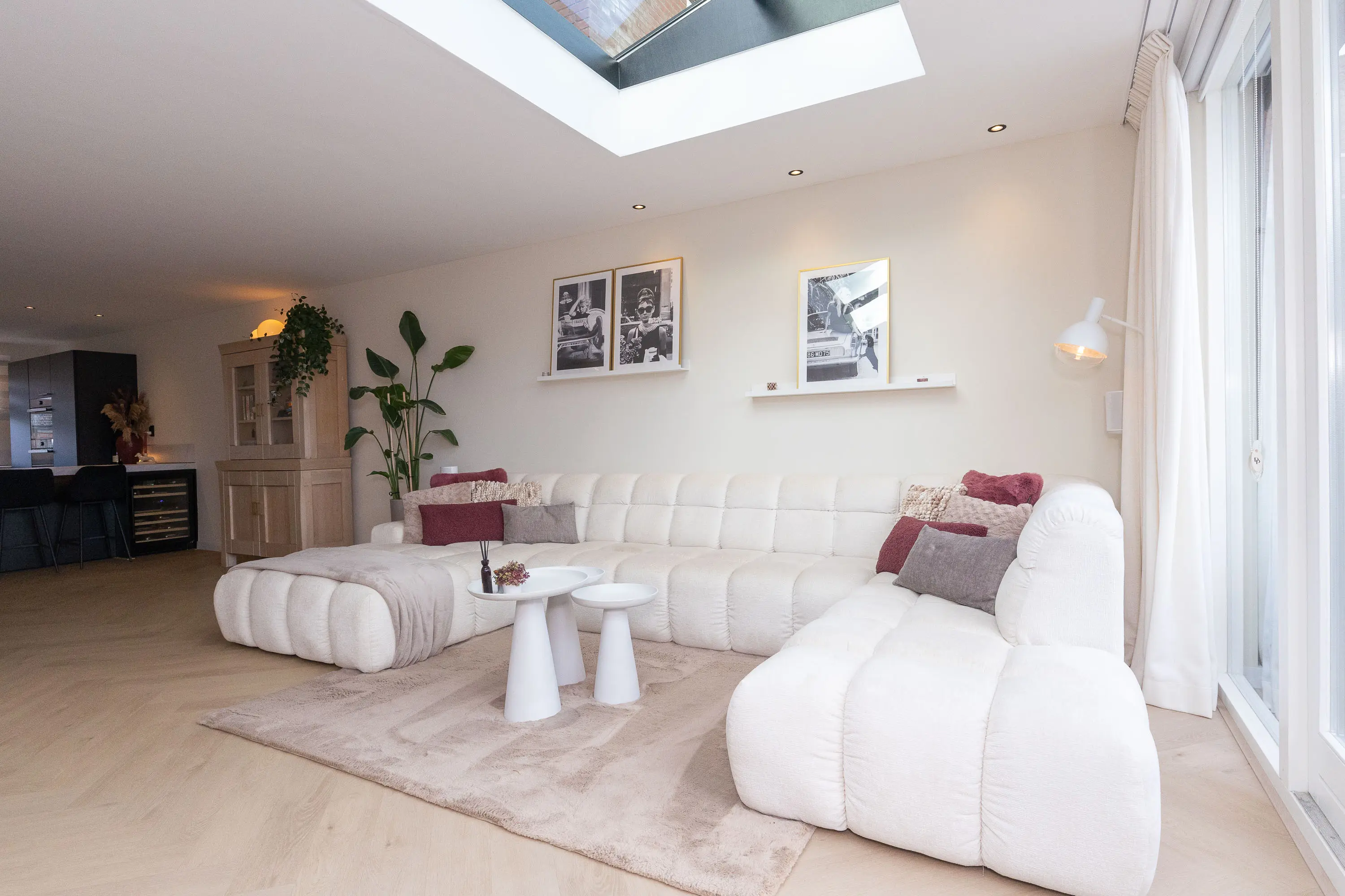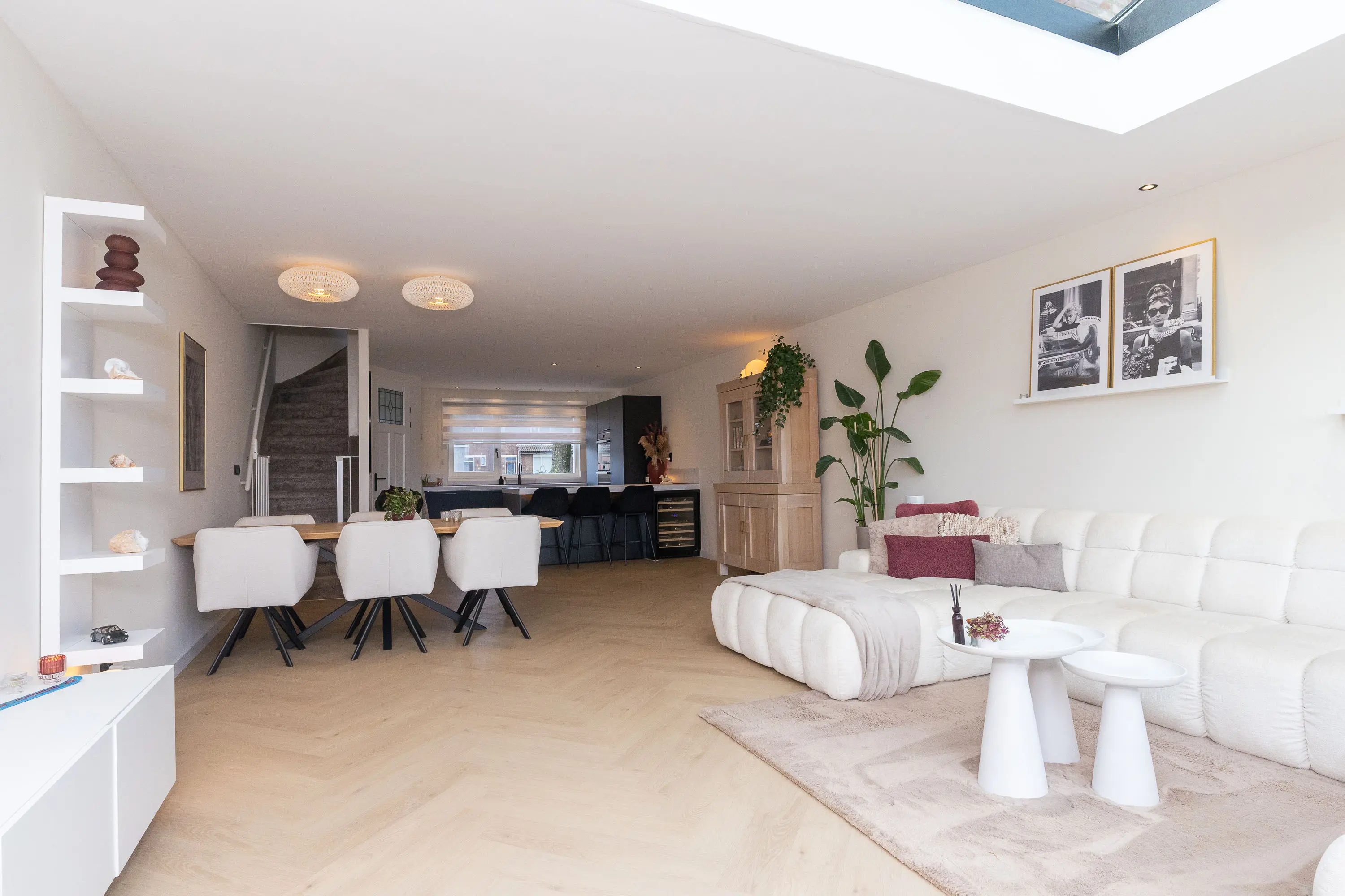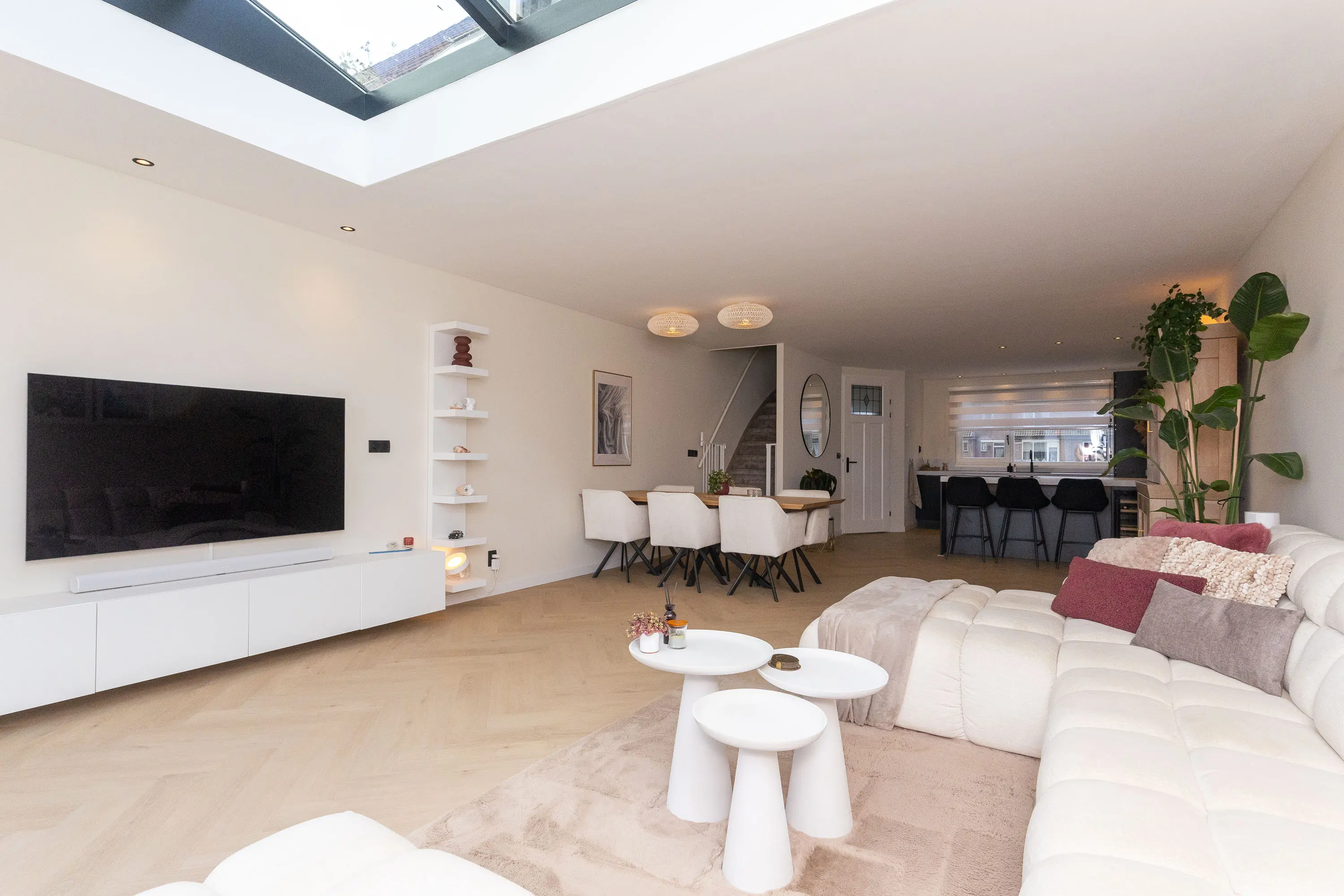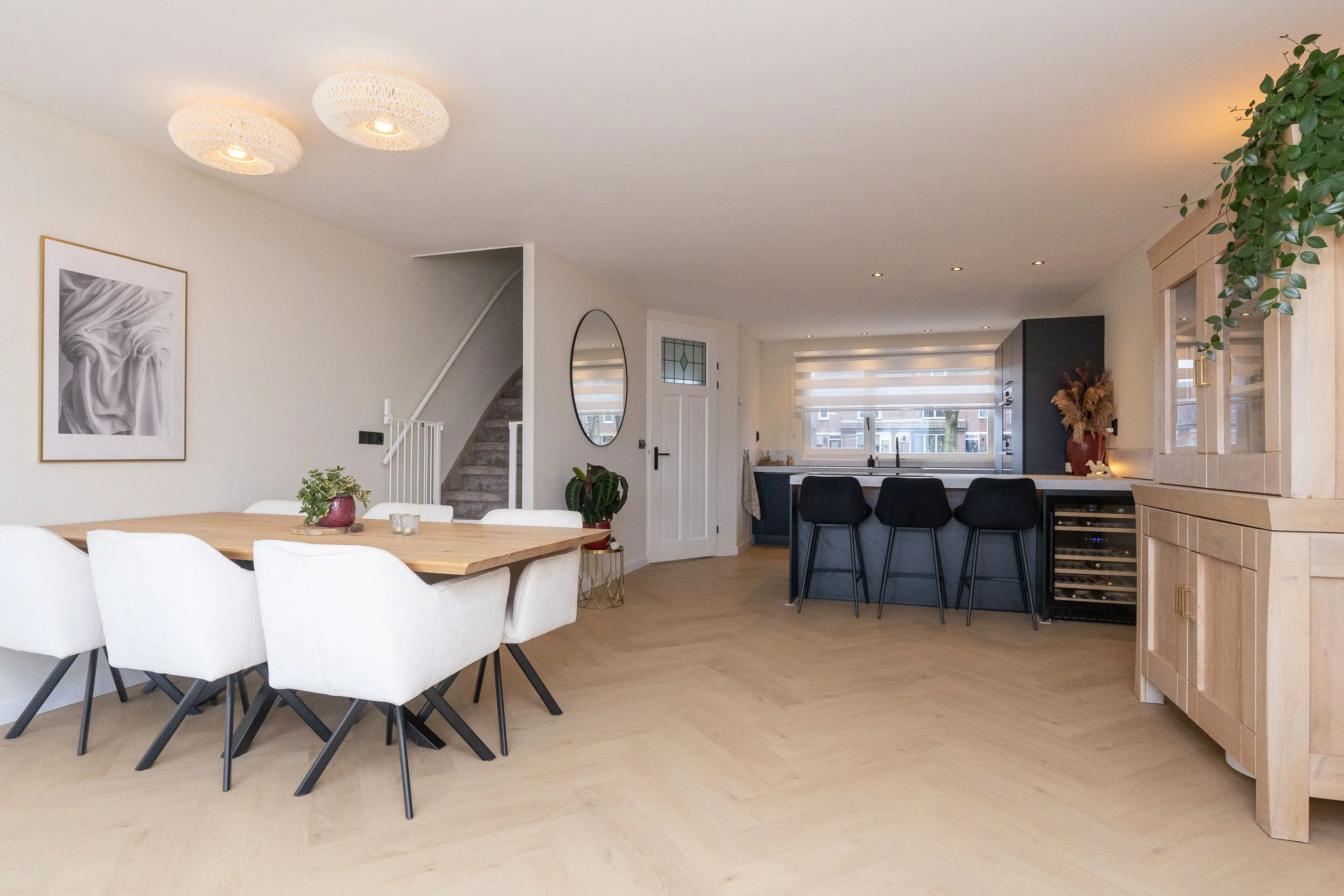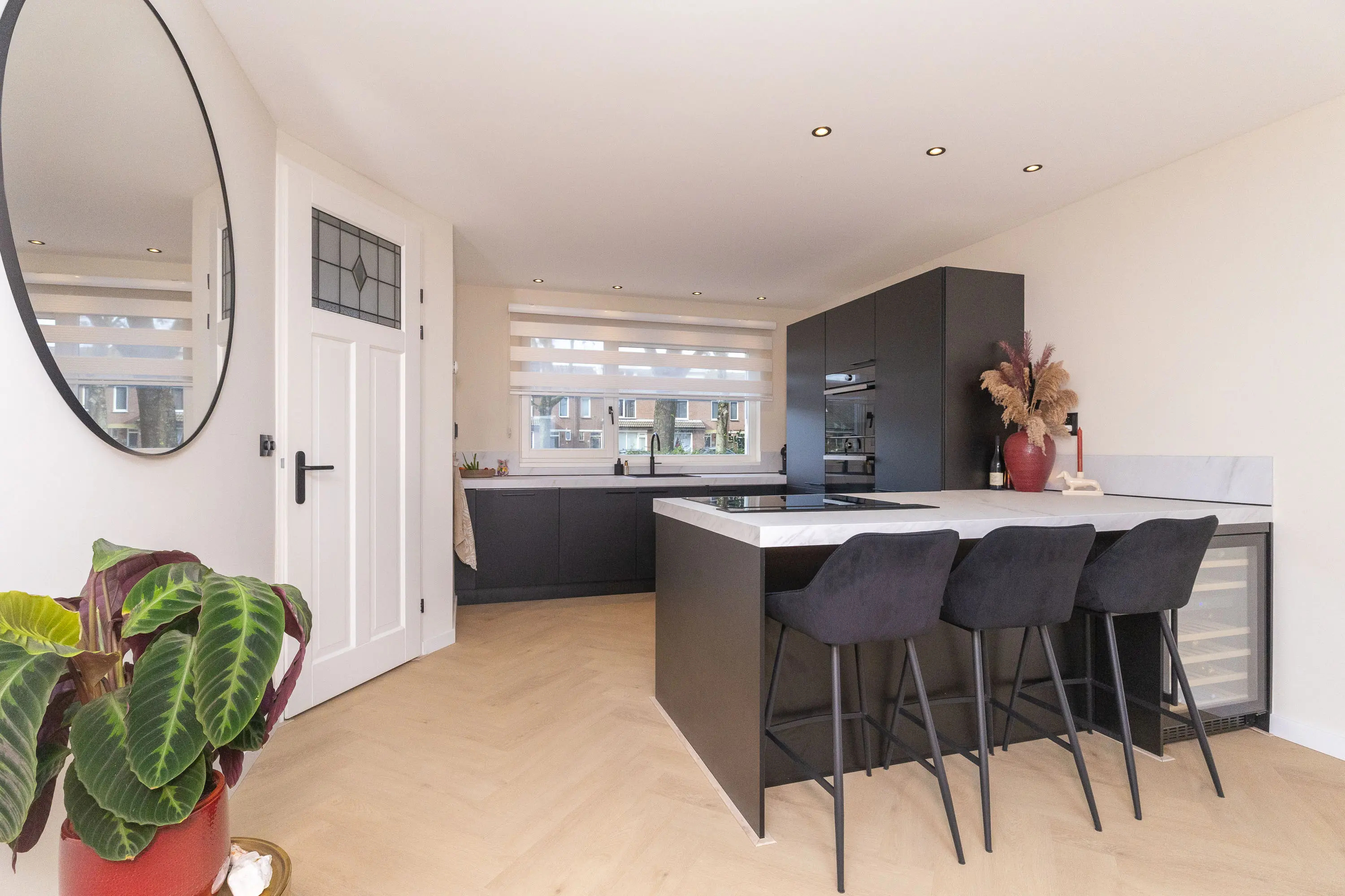De woning beschikt over een voortuin met sierhekwerk. Binnenkomend tref je een verzorgde entree en een modern toilet onder de trap. De ruime woonkamer is aanzienlijk vergroot door de uitbouw en voorzien van een prachtige lichtstraat, waardoor er een zee aan daglicht binnenvalt. De fraaie visgraatvloer met vloerverwarming zorgt voor comfort en stijl. De woonkamer grenst aan de zonnige tuin en beschikt over openslaande deuren naar buiten. De moderne keuken (2021) is een echte eyecatcher! Deze is uitgerust met een schiereiland met bargedeelte, wijnklimaatkast, twee ovens, koelkast, vriezer, inductiekookplaat en een Quooker-kraan. Daarnaast is er volop kastruimte, waardoor de keuken niet alleen stijlvol maar ook praktisch is.
