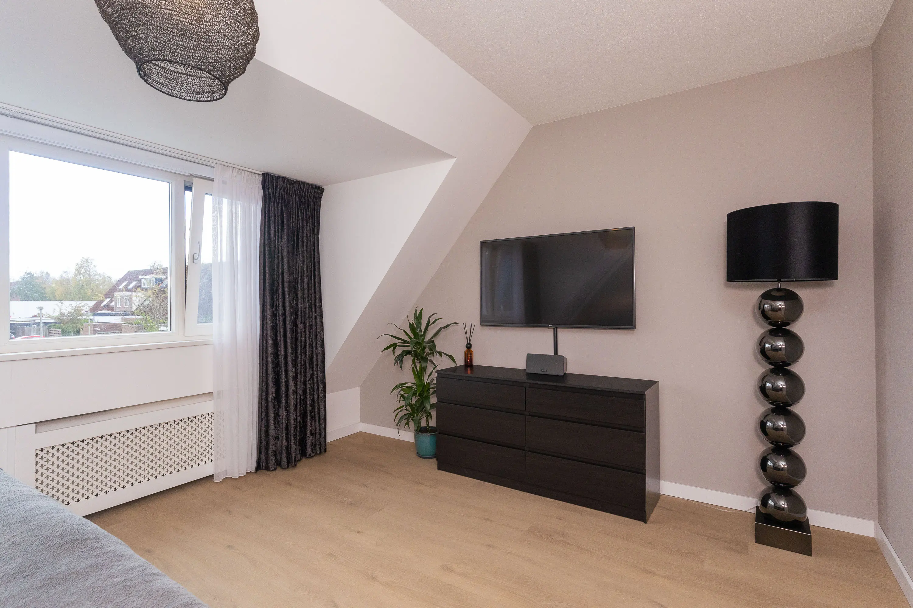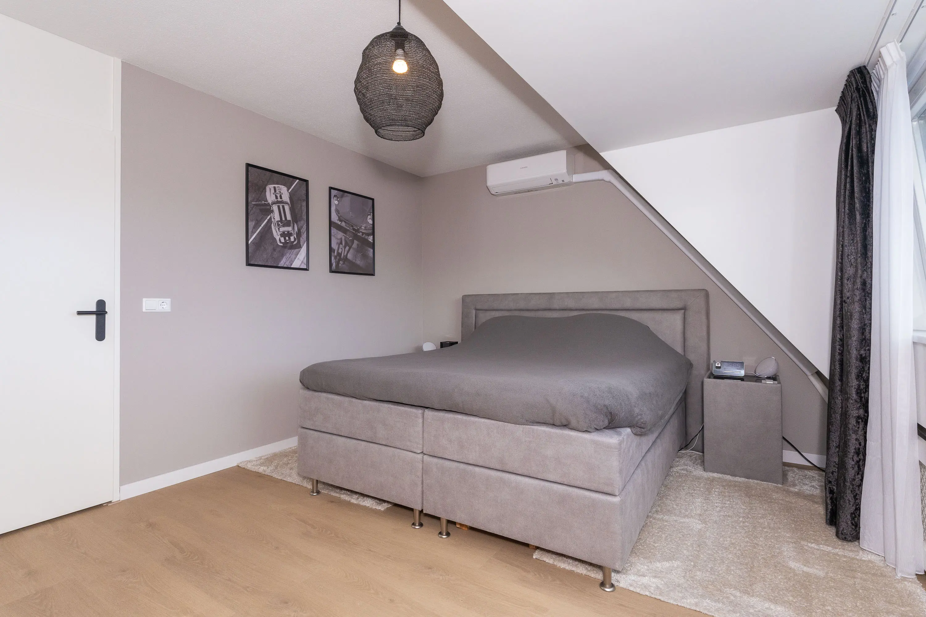 Op de eerste verdieping bevindt zich een riante slaapkamer aan de achterzijde, mede dankzij de dakkapel aan de achterzijde en voorzien van airconditioning. Een tweede nette (slaap)kamer bevindt zich aan de voorzijde van de woning. De moderne badkamer, eveneens vernieuwd in 2021, is voorzien van vloerverwarming, een dubbele regendouche, dubbele wastafel, tweede toilet en sfeervolle nisjes. De afwerking is strak en eigentijds.