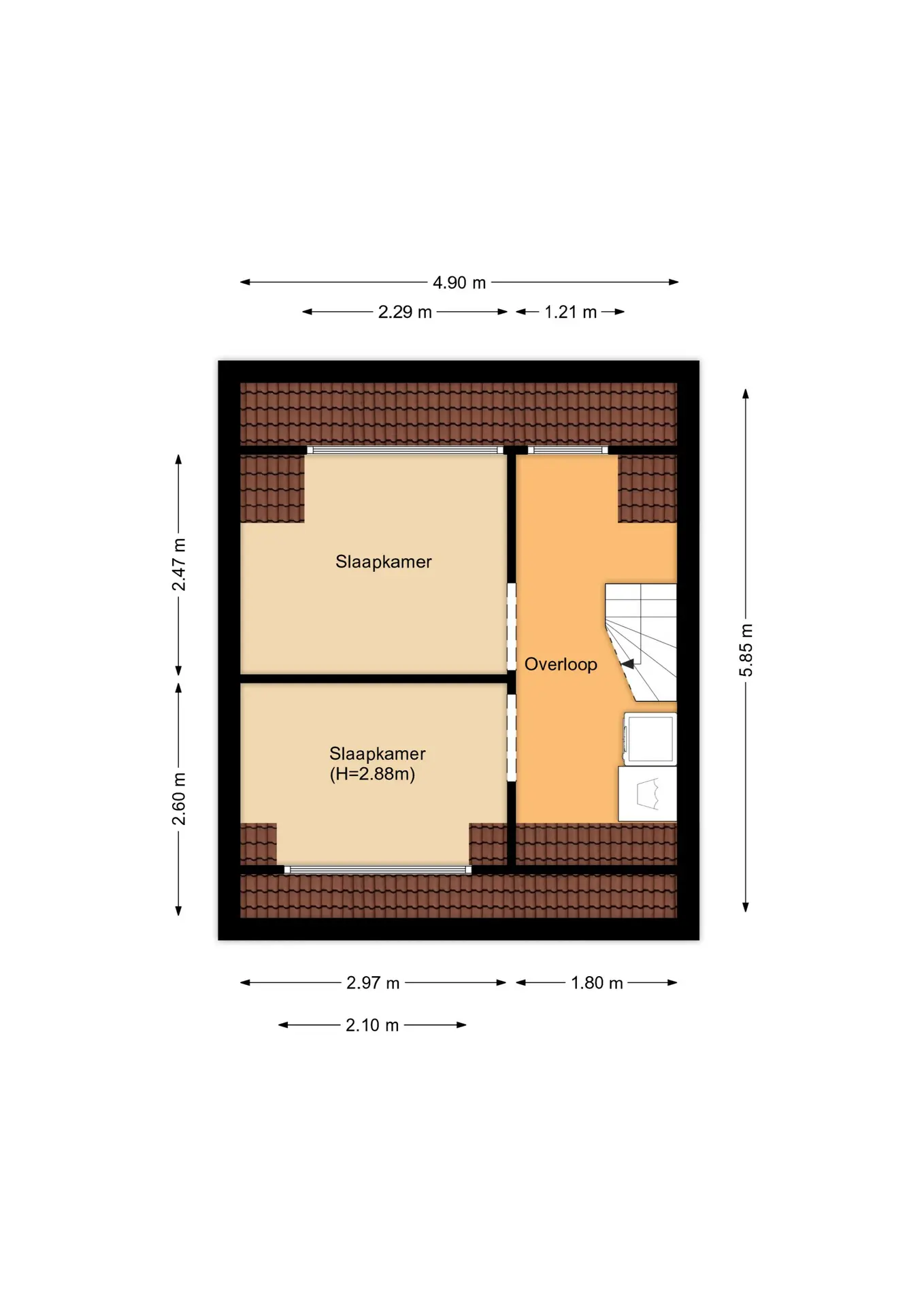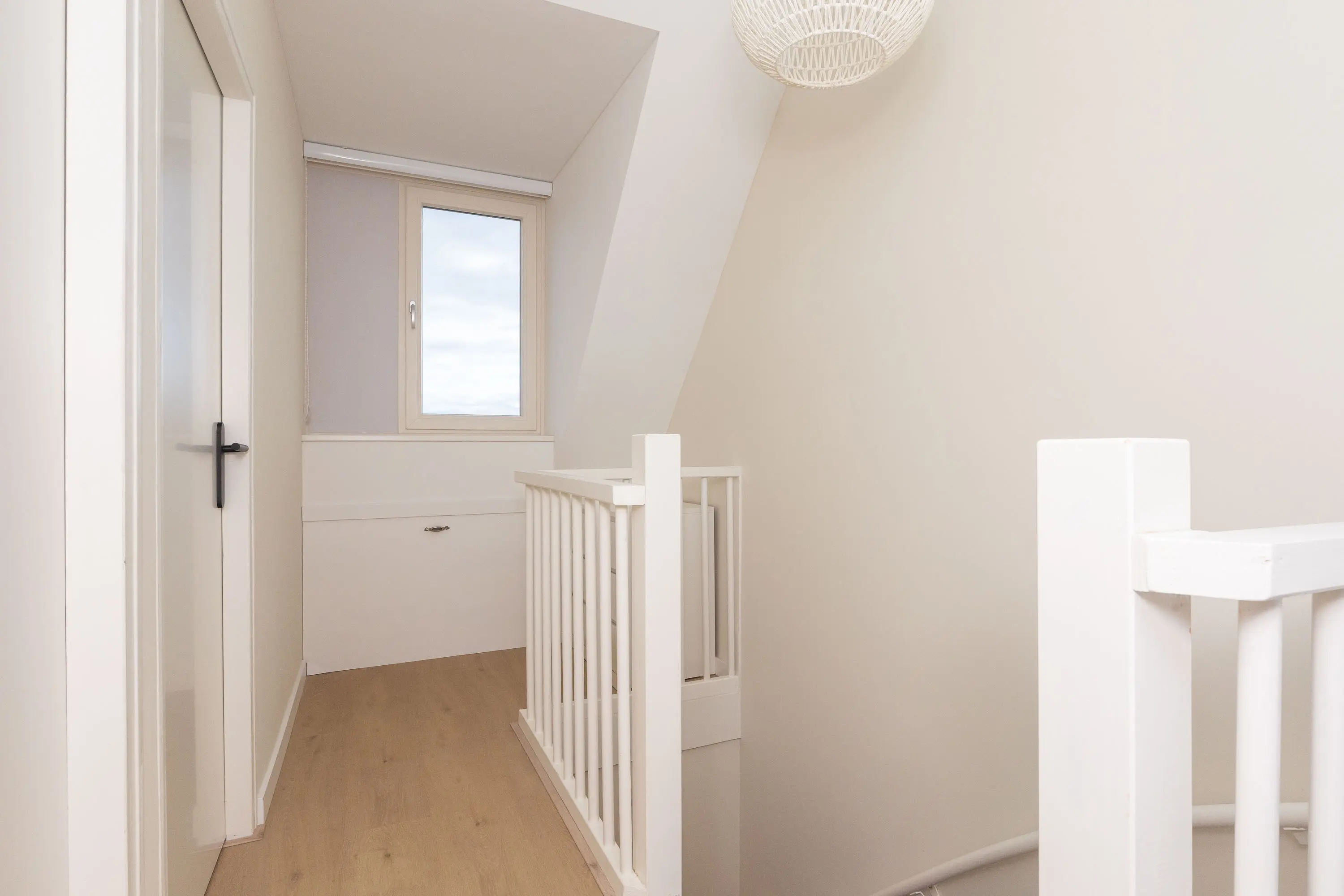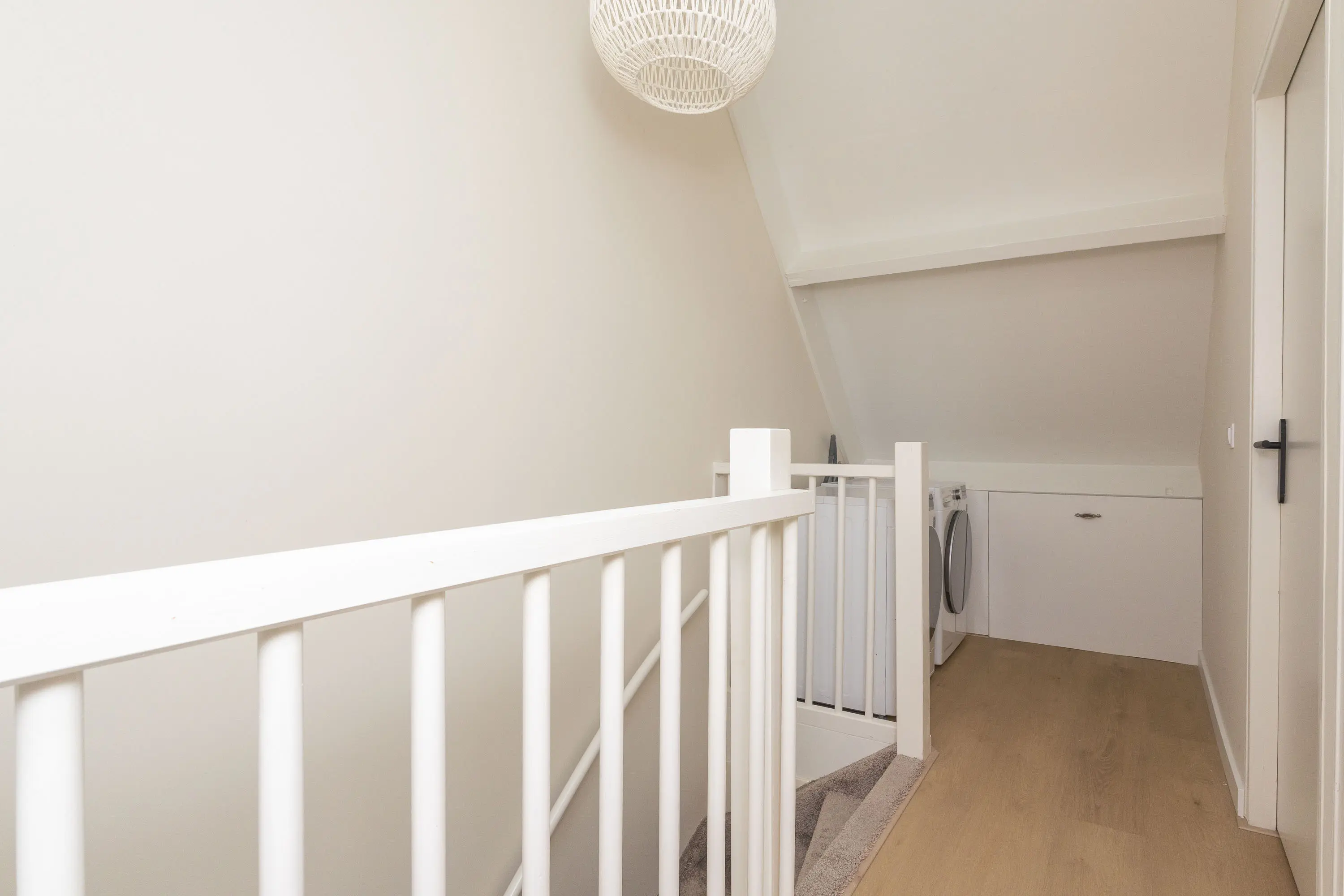 De vaste trap leidt naar de tweede verdieping met een overloop, aansluitingen voor wasmachine en droger, en twee fraaie kamers, beide met een dakkapel. Deze verdieping biedt volop mogelijkheden als extra slaapkamers, werkkamers of hobbyruimtes.