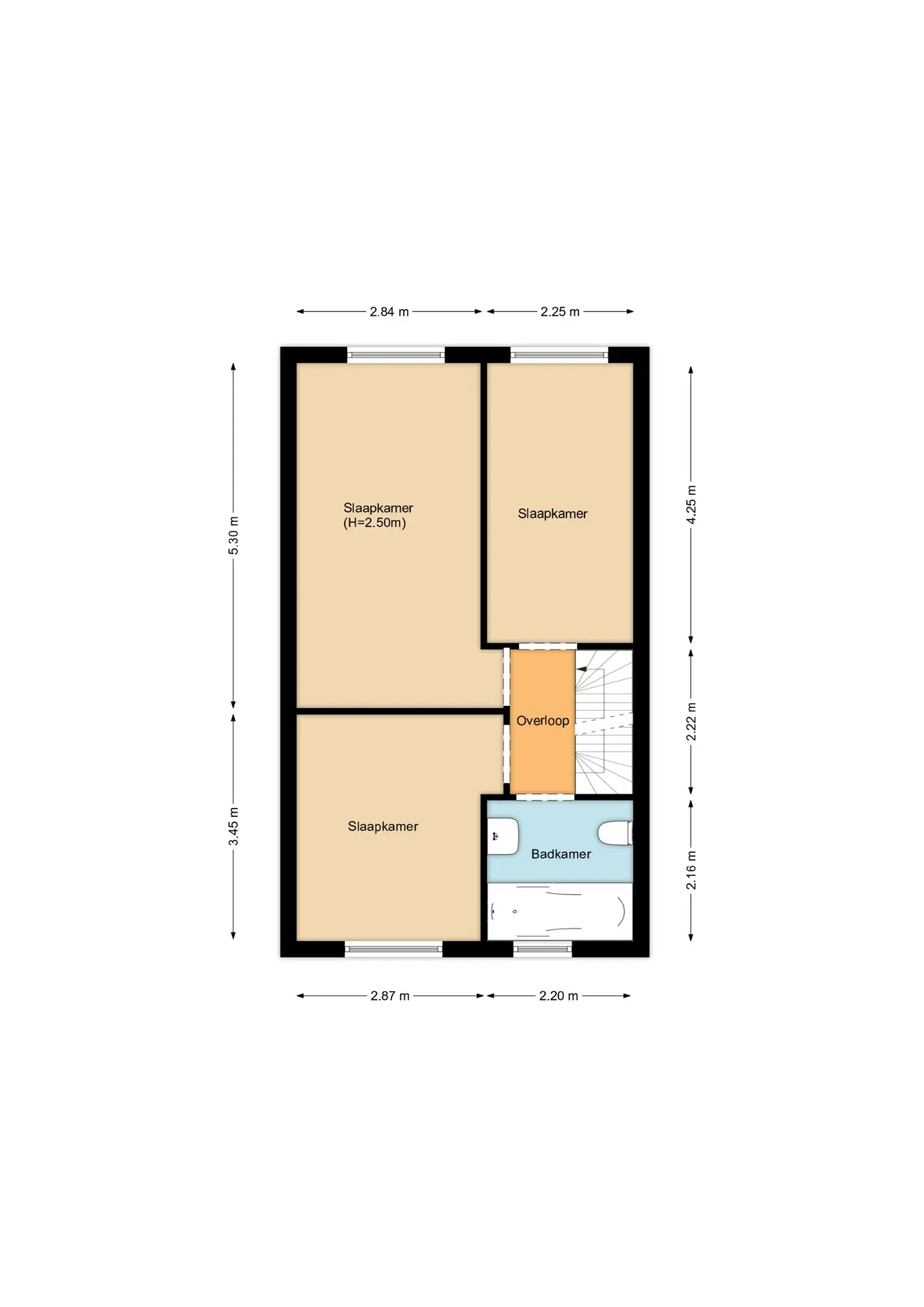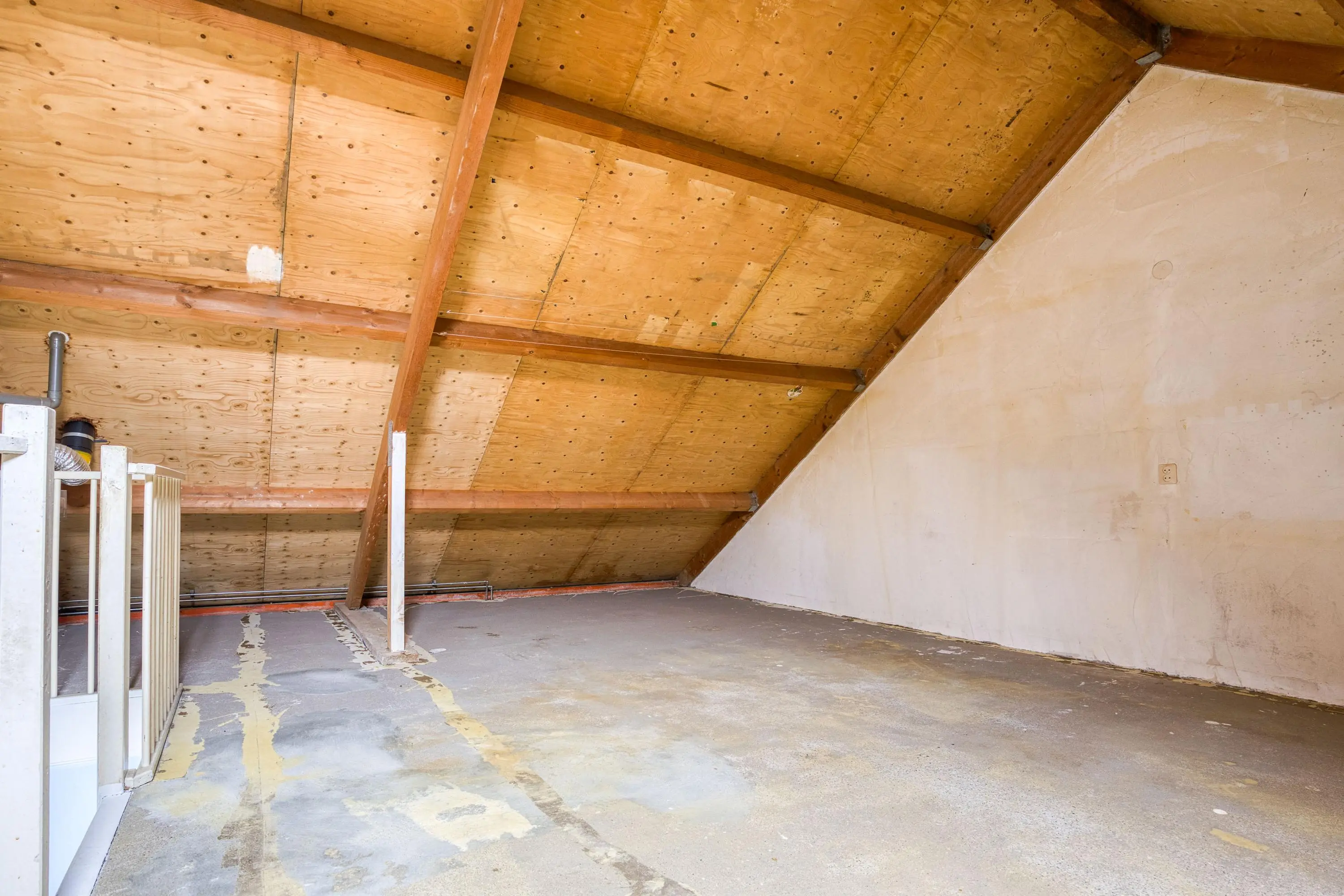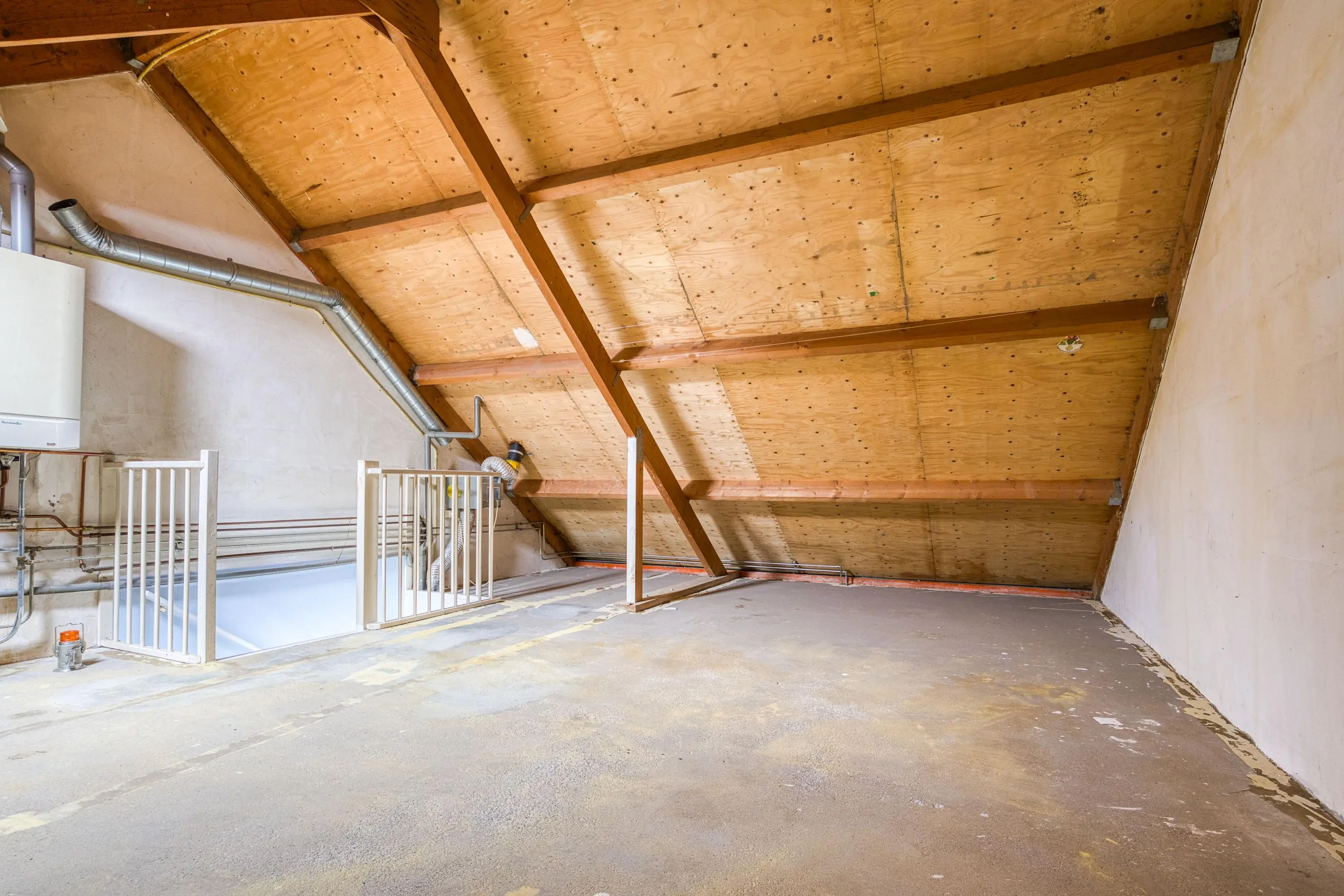 De zolder is meegenomen in het totaal aan vierkante meters woonoppervlakte, maar door de beperkte afmeting van het dakraam wordt deze ruimte formeel niet als woonoppervlakte gerekend.
