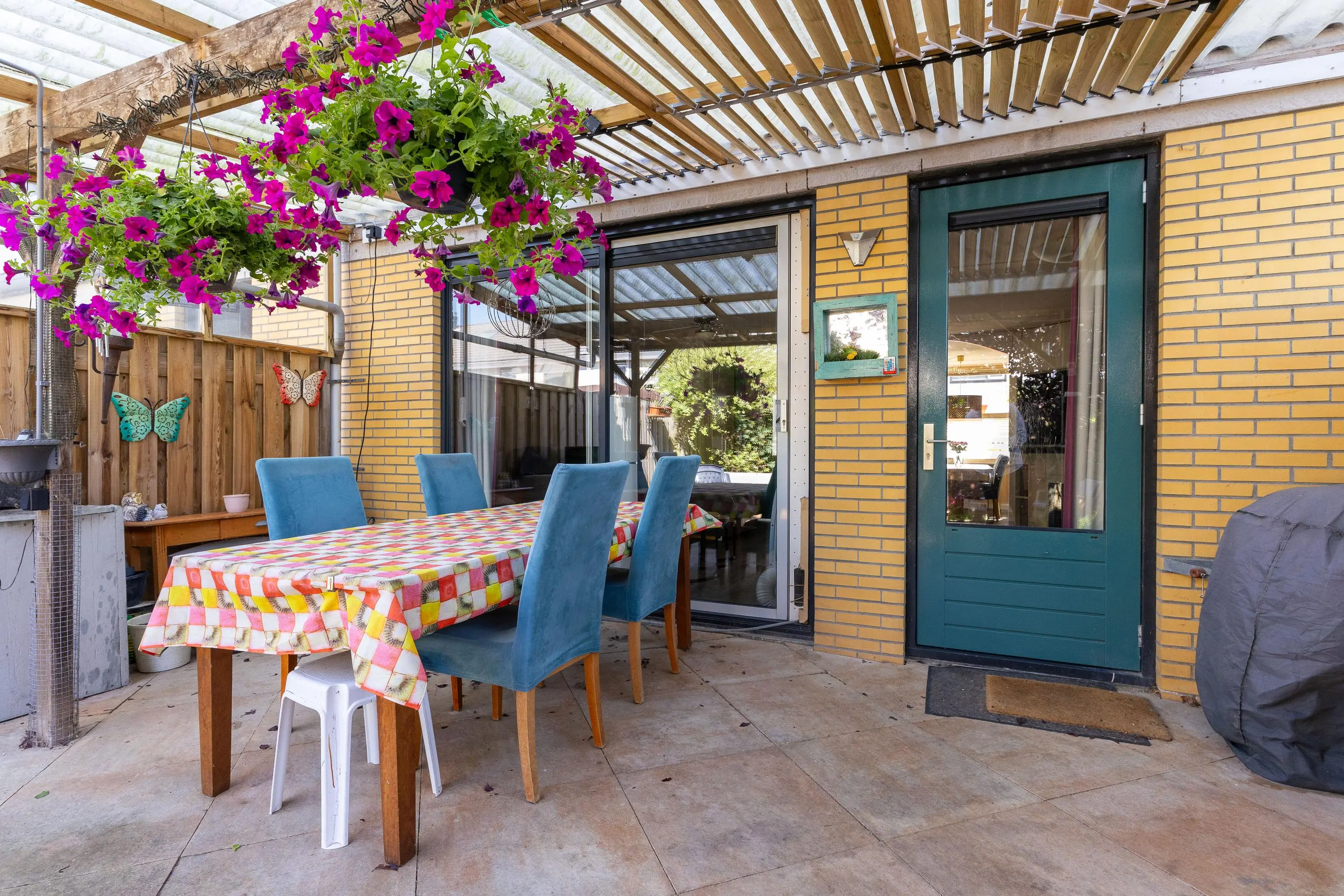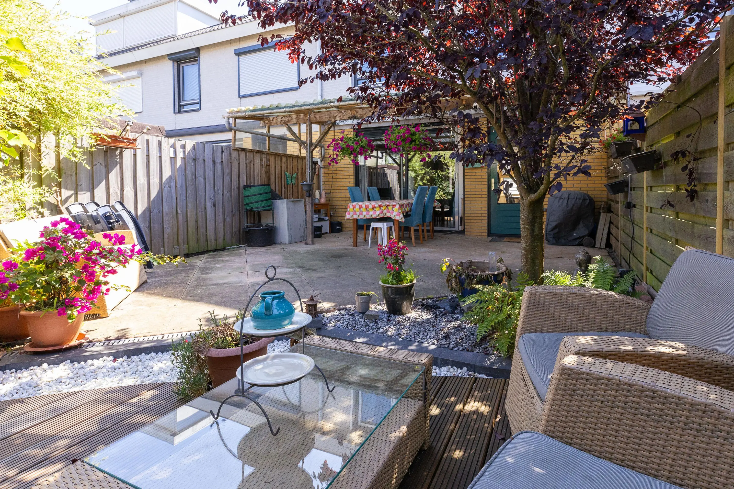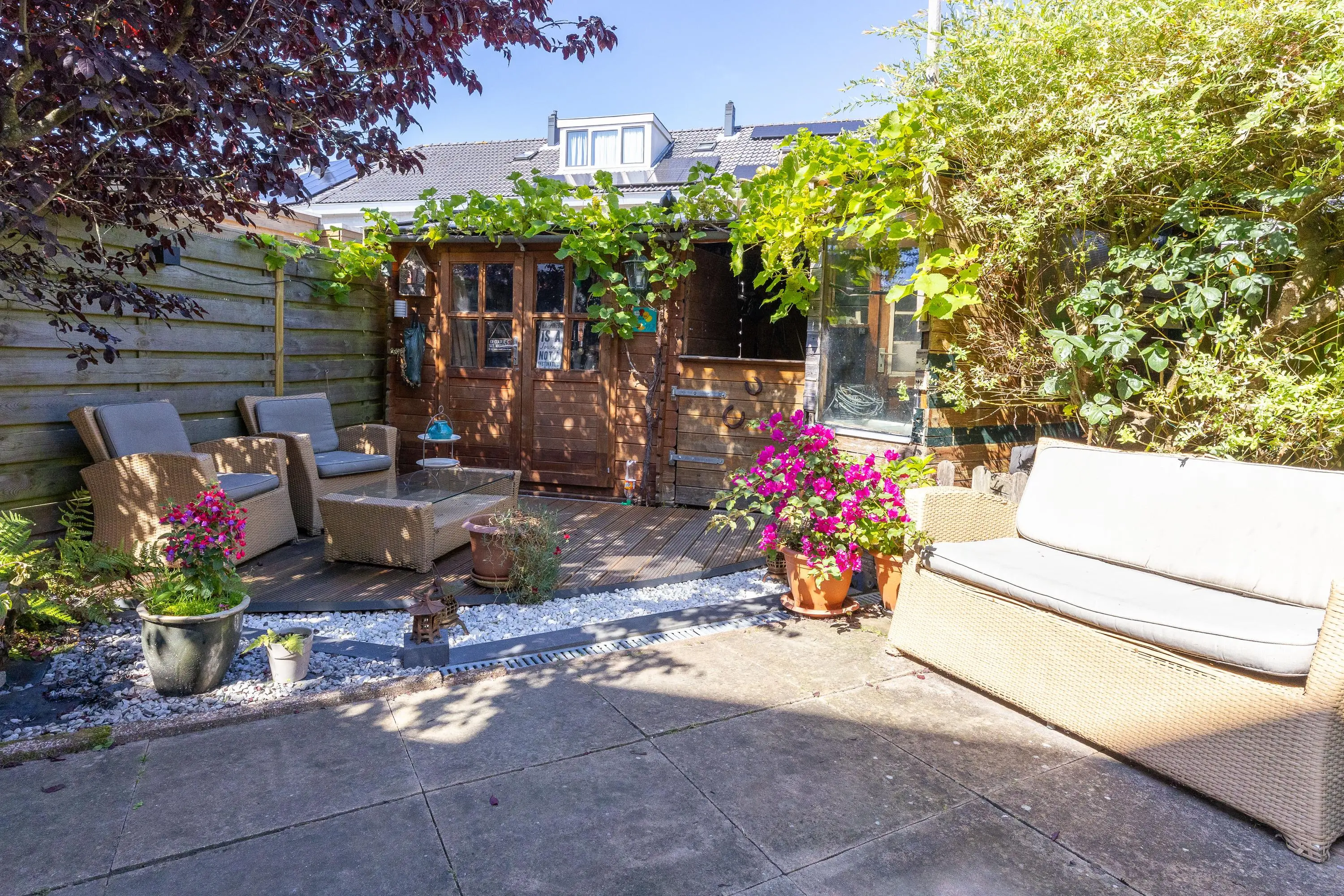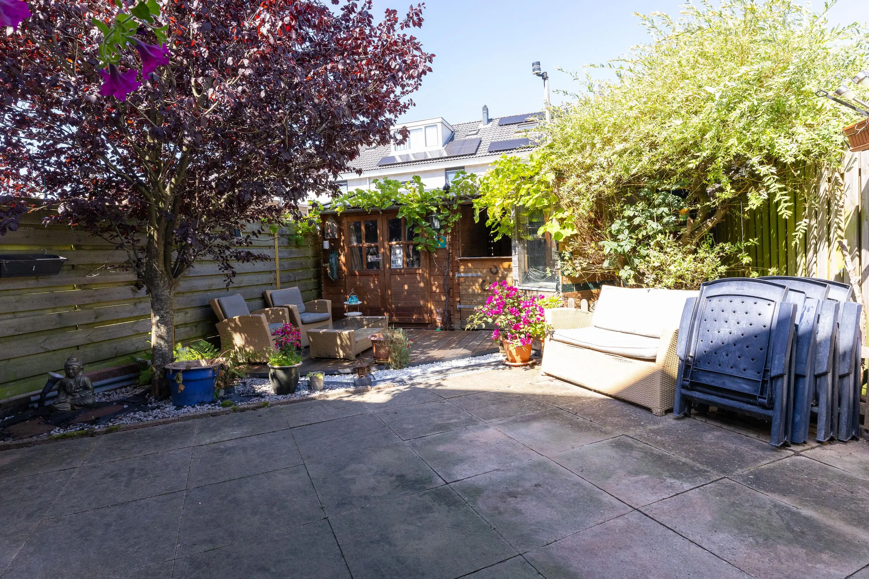 De voortuin is strak betegeld en de achtertuin biedt alles voor buiten genieten. De overkapping aan de woning maakt het mogelijk om beschut buiten te zitten. Achterin vindt u een houten berging en een tweede berging met toegang tot de achtergelegen steeg, ideaal voor fietsen, scooters of tuinspullen.