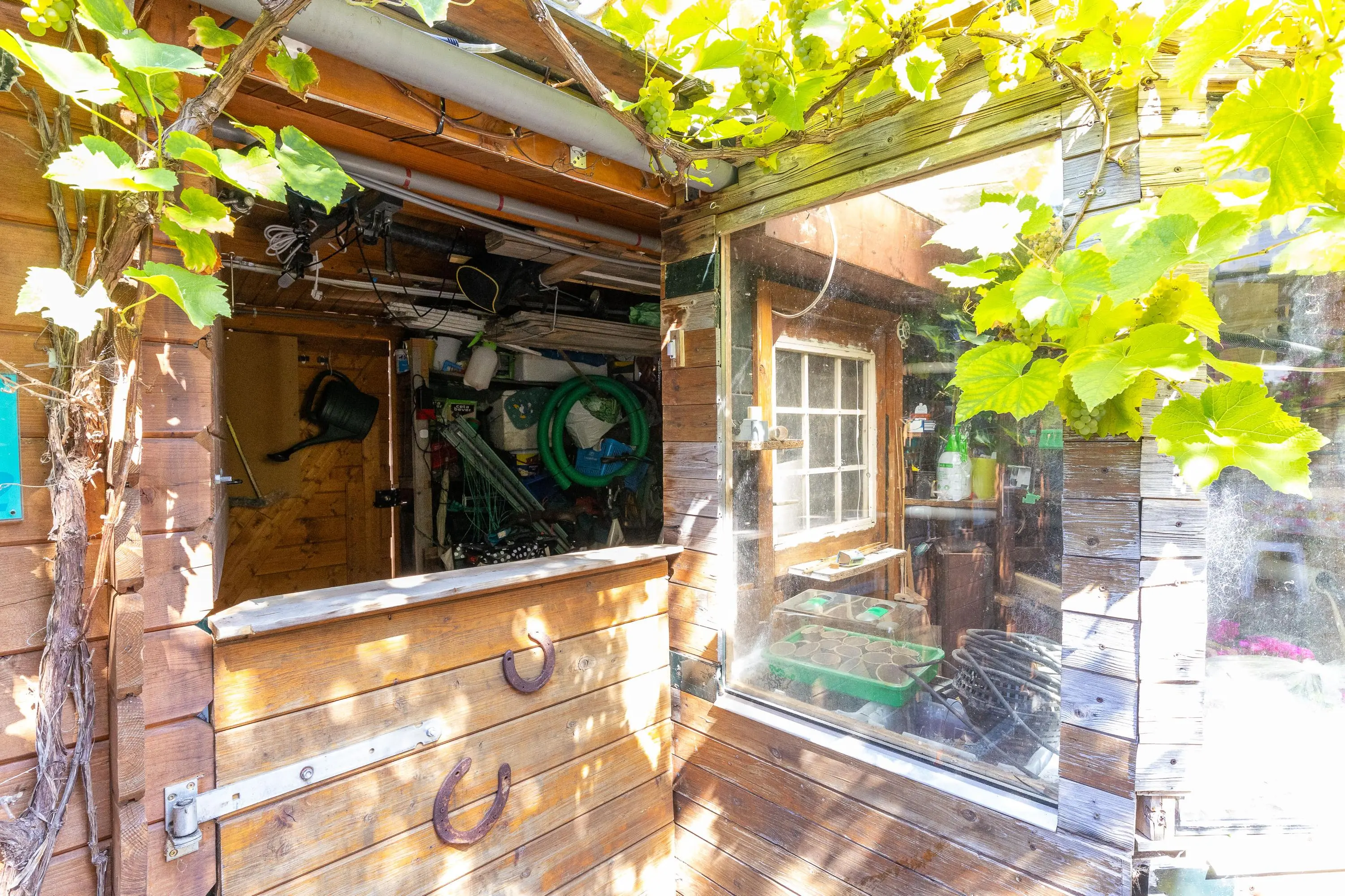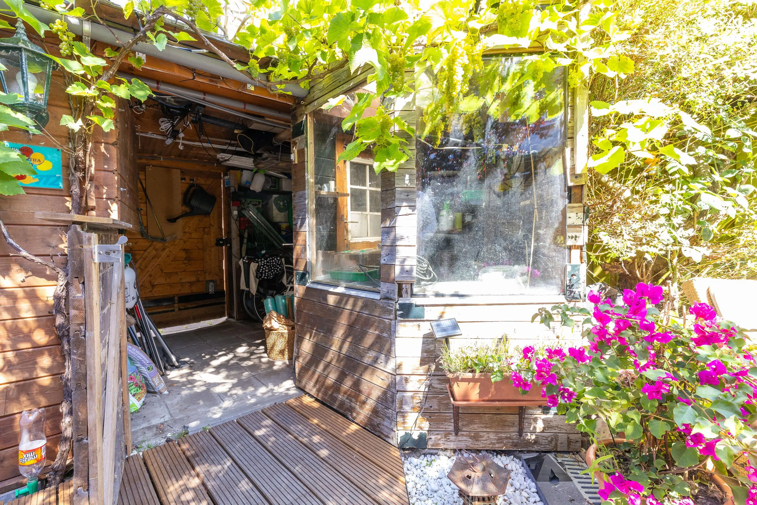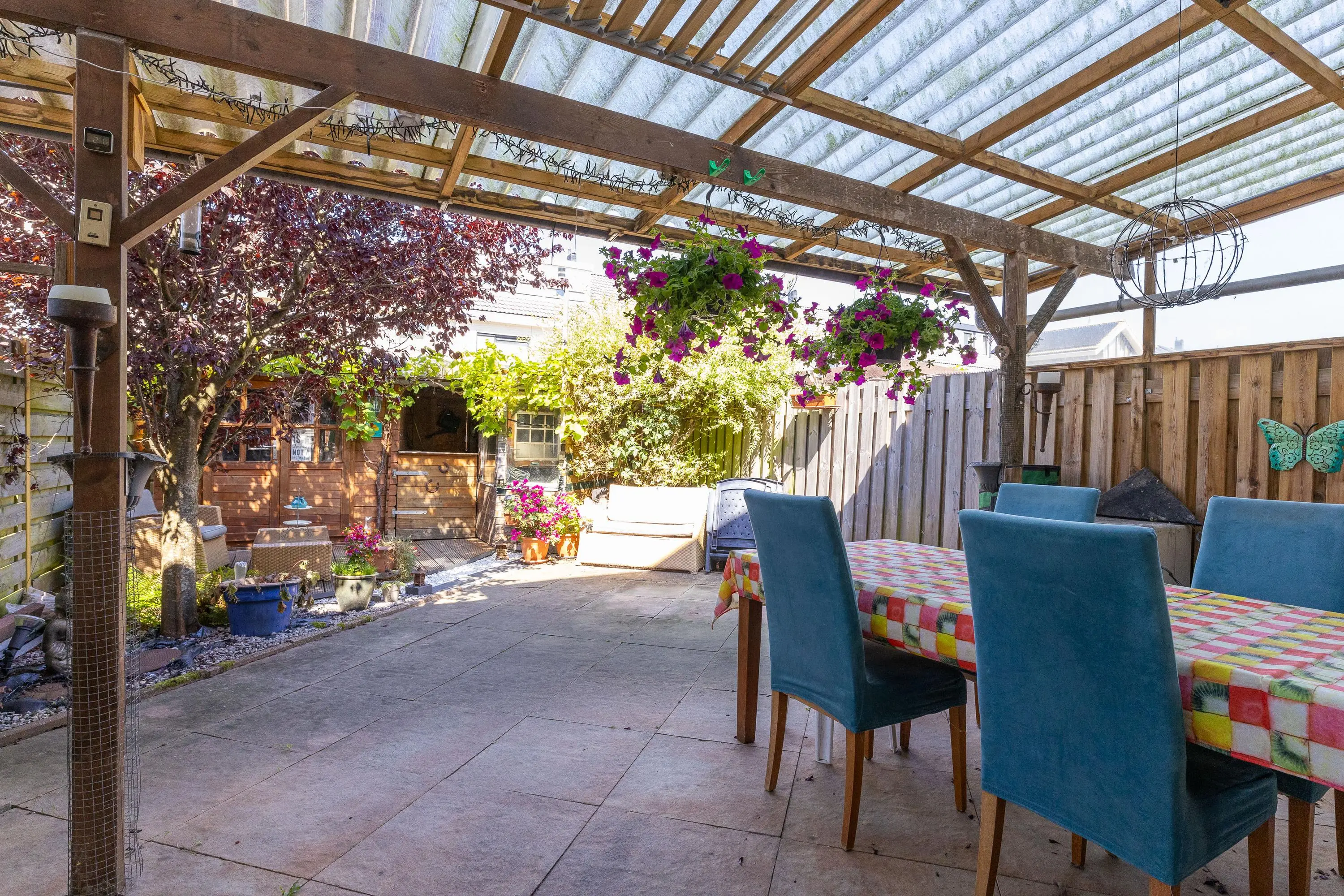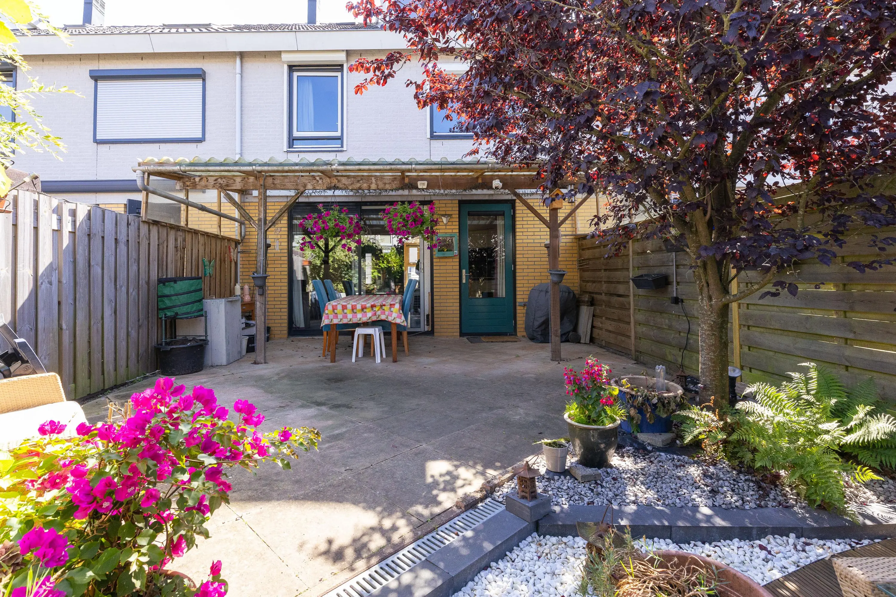 De voortuin is strak betegeld en de achtertuin biedt alles voor buiten genieten. De overkapping aan de woning maakt het mogelijk om beschut buiten te zitten. Achterin vindt u een houten berging en een tweede berging met toegang tot de achtergelegen steeg, ideaal voor fietsen, scooters of tuinspullen.