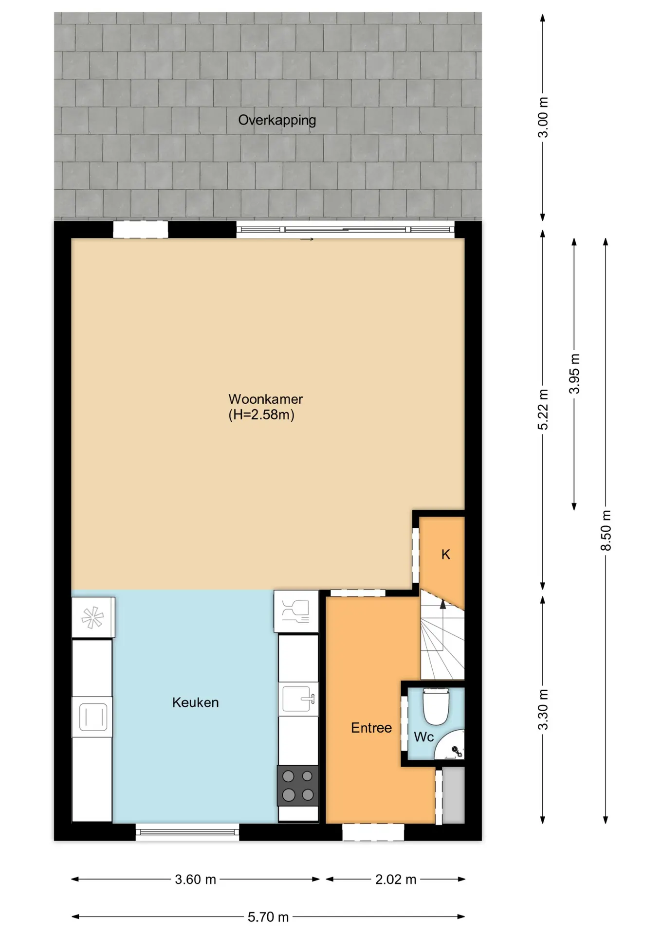 U komt binnen middels de voortuin in de hal met meterkast, toilet en trapopgang naar boven. Vanuit hier bereikt u de ruime woonkamer met vloerverwarming over de gehele verdieping. De eyecatcher is het op maat gemaakte multimediameubel met geïntegreerde elektrische haard en televisie, een sfeervolle plek waar luxe en gezelligheid samenkomen. Grote ramen en een aluminium schuifpui zorgen voor volop daglicht en een directe verbinding met de achtertuin.