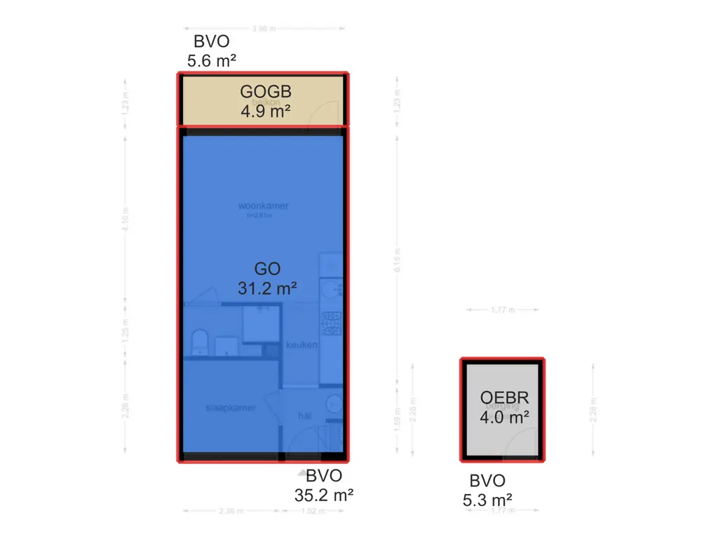 Vanuit de hal bereikt u de slaapkamer. Deze heeft een prima afmeting en is groot genoeg voor een tweepersoonsbed met kast. De badkamer bereikt u via de woonkamer en heeft alles wat u nodig heeft. Denk hierbij een wastafel met meubel, douche en toilet.