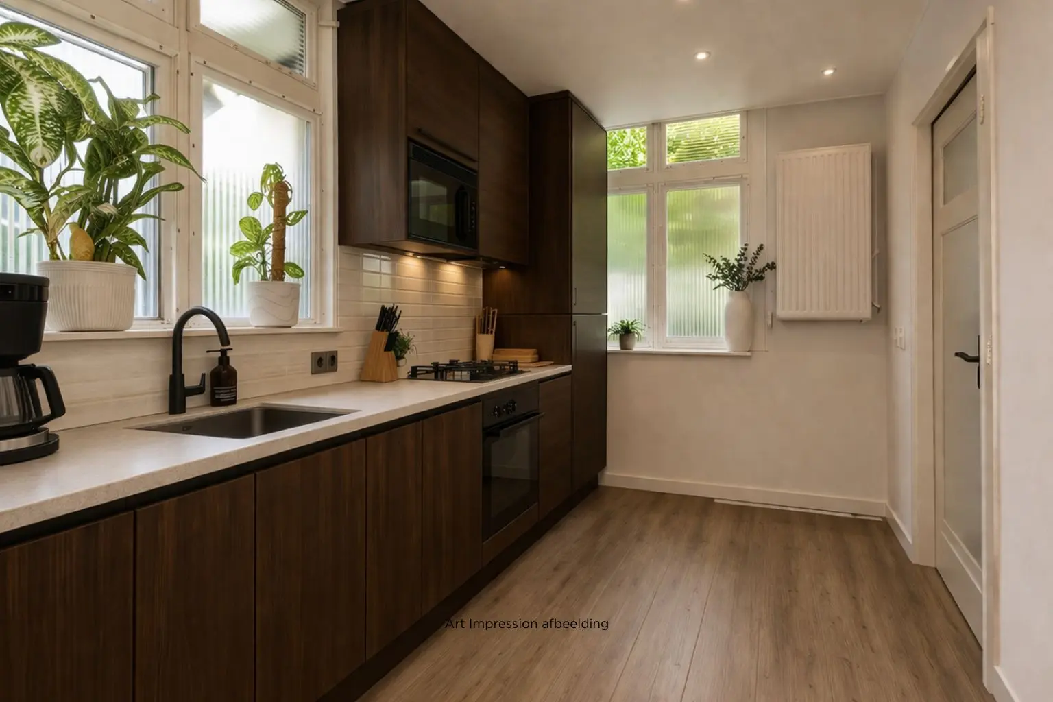Op de begane grond vind je een royale woonkamer met veel lichtinval en voldoende ruimte voor een gezellige zithoek en eethoek. De keuken biedt volop mogelijkheden om naar eigen wens te moderniseren en vormt samen met de bijkeuken een praktische indeling. Verder bevindt zich op deze verdieping de badkamer, handig en comfortabel op de begane grond gesitueerd.