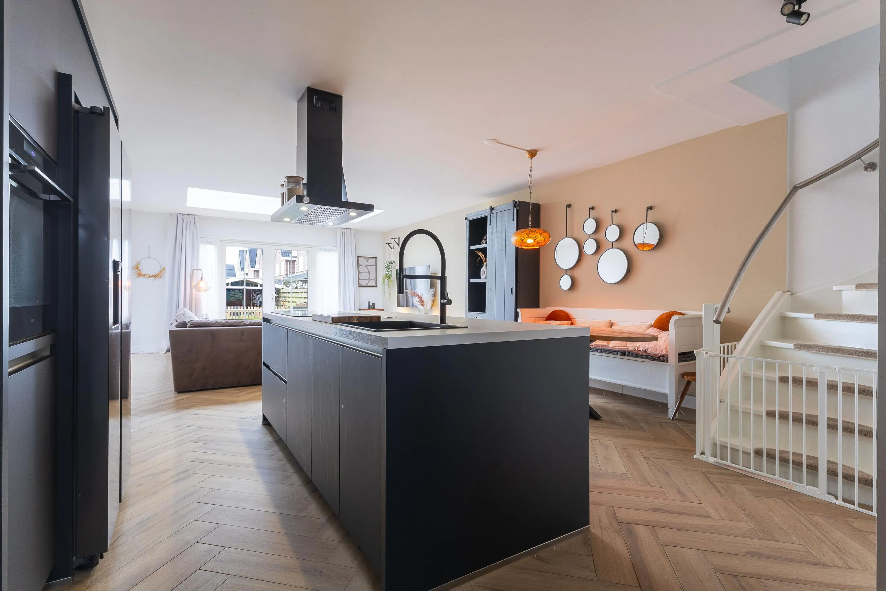De openslaande deuren creëren een mooie connectie met de tuin en zorgen voor een heerlijk ruimtelijk gevoel.