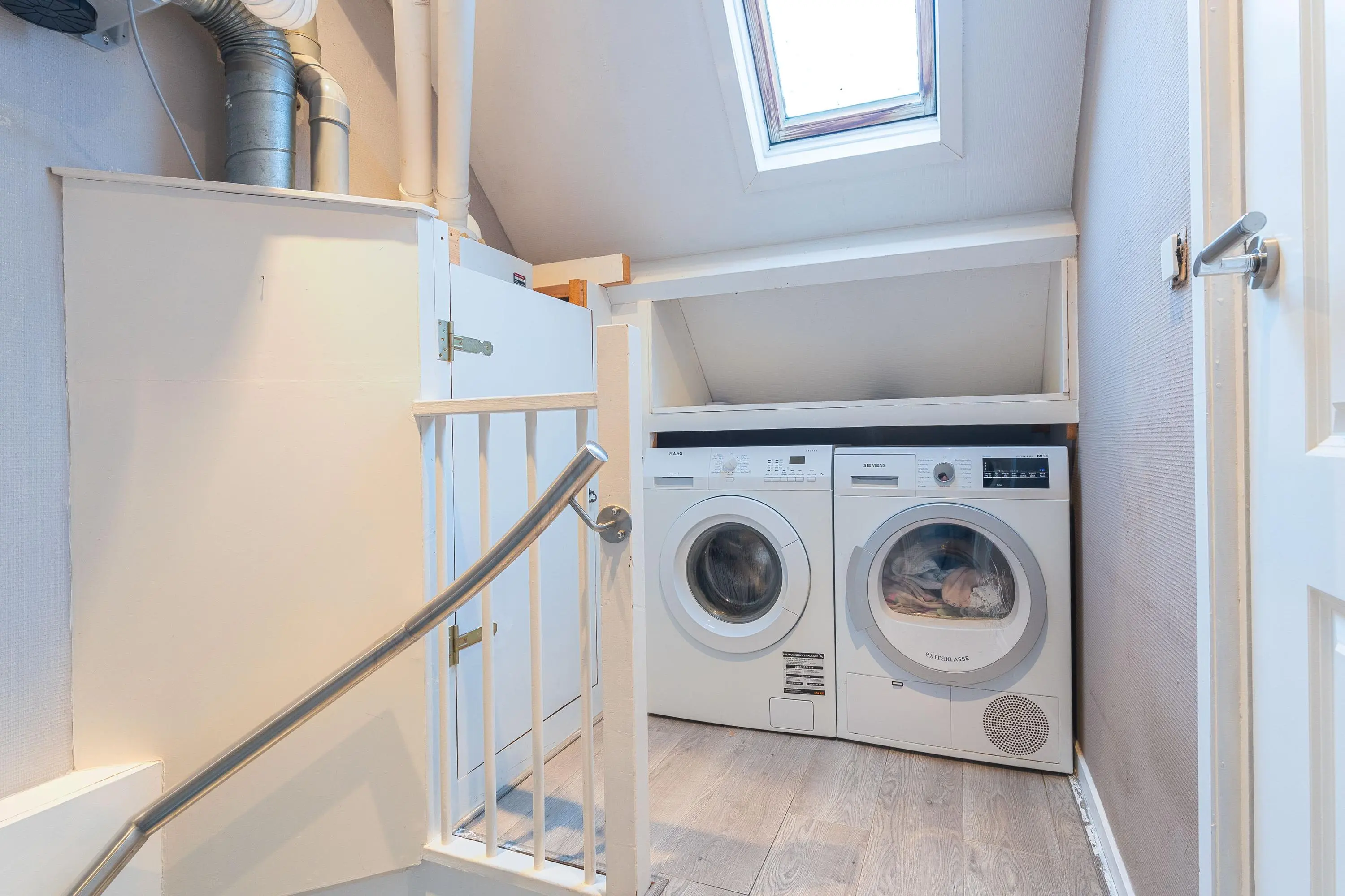 Een technische ruimte met aansluiting voor wasmachine en droger en de cv-installatie