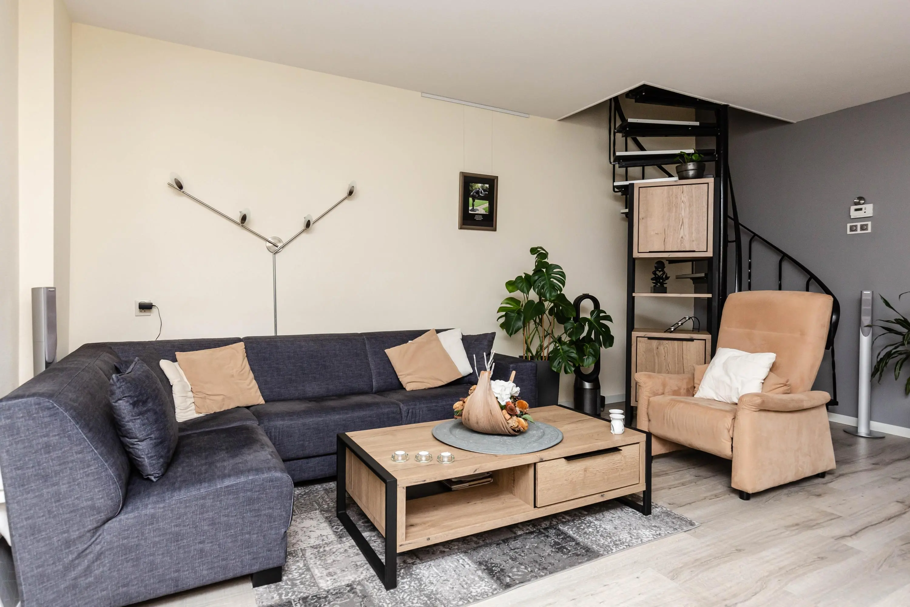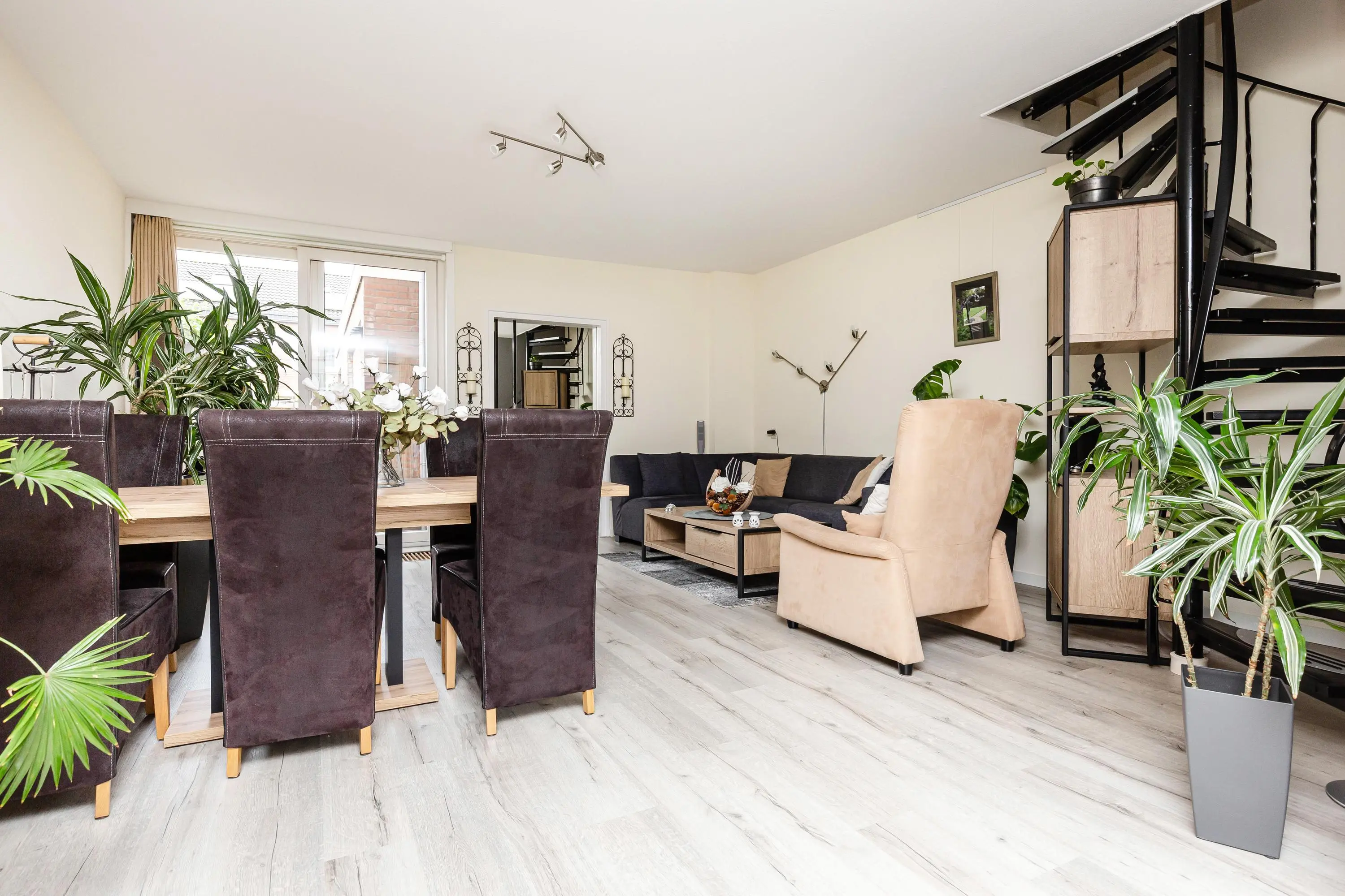 Aansluitend de grote woonkamer met eyecacher de spiltrap naar de eerste verdieping, kunststof schuifpui naar de achtertuin en een mooie spiegelschuifdeur naar de aanbouw en natuurlijk het laminaat.