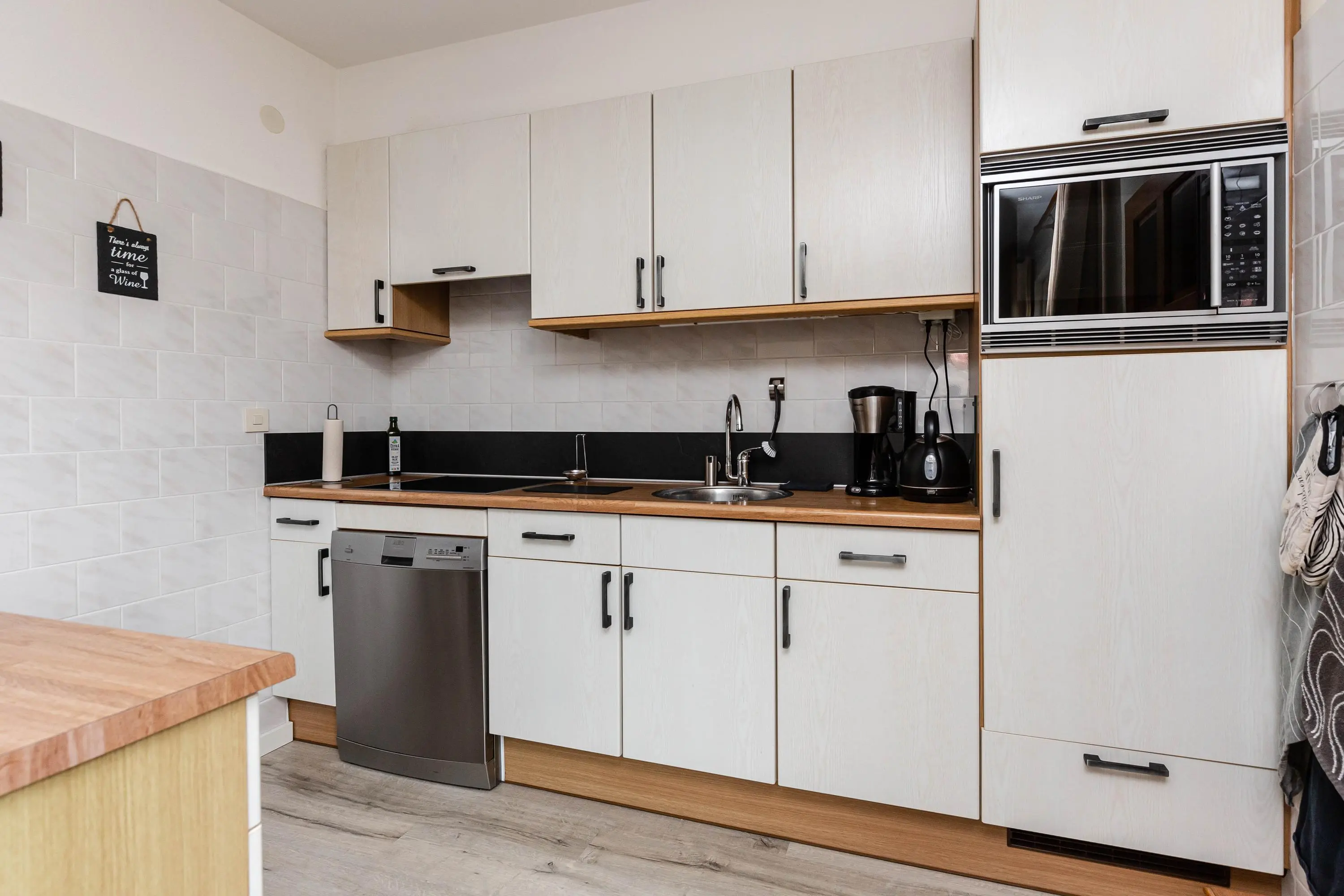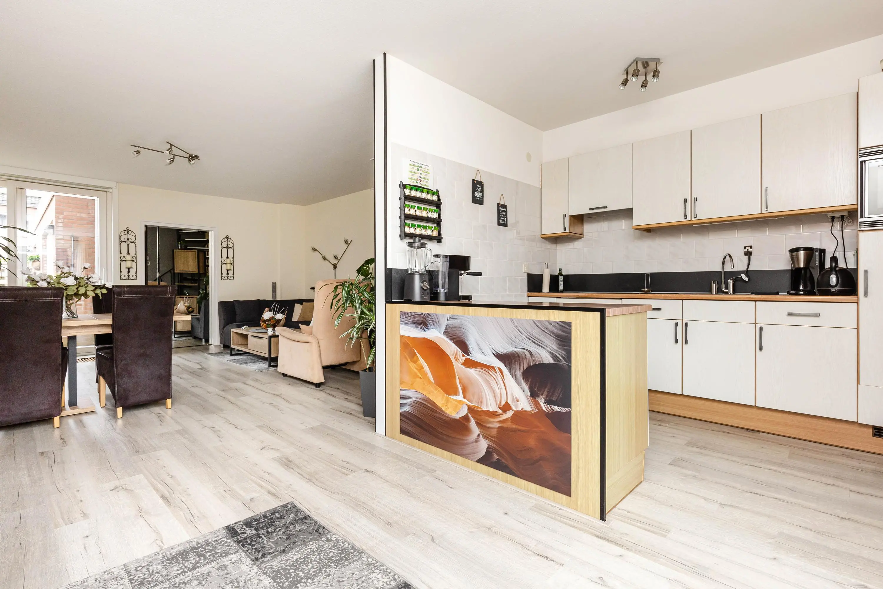 De heerlijk lichte openkeuken in rechte opstelling en bar is voorzien van inductiekookplaat, afzuigkap, combi magnetron, vaatwasser, koelkast en ruimte voor een eettafel.
