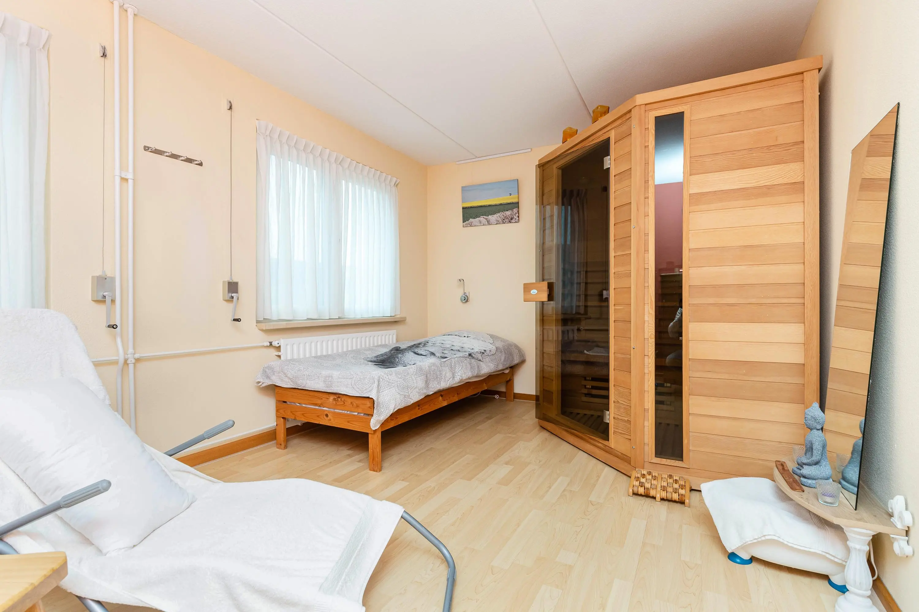 Als u de deur boven aan de trap opent komt u op de overloop met ook hier prachtige disign deuren en de gehele verdieping ook voorzien van laminaat. Hier bevind zich aan de voorzijde een slaapkamer over de gehele breedte. Nu de welnesskamer met infrarood sauna, aansluitend nette badkamer met douche cabine, toilet en een 2-tal wastafels, erg ideaal met meerdere personen. Aan de achterzijde is eveneens een slaapkamer over de gehele breedte gemaakt, wat een ruimte. Beiden slaapkamers zijn voorzien van kunststof kozijnen met rolluiken, heerlijk koel in de zomer en warm in de winter. Luxe in alle seizoenen.