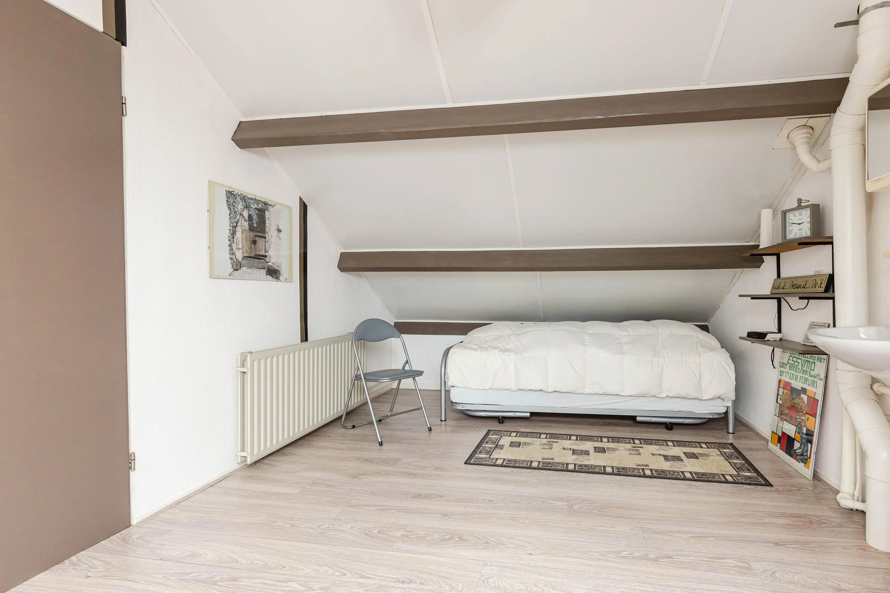 Via ook hier een vaste trap met nette vloerbedekking, lekker geluiddempend, komt u op de voorzolder met groot kunststof dakraam. Genoeg opbergruimte voor en achter. Hier bevind zich ook de cv ketel (Remeha 2008) jaarlijks onderhouden. Door de deur komt u wederom in een grote slaapkamer ditmaal over de gehele lengte van de woning, overal laminaat en kunststof dakkapel ook hier voorzien van rolluiken.