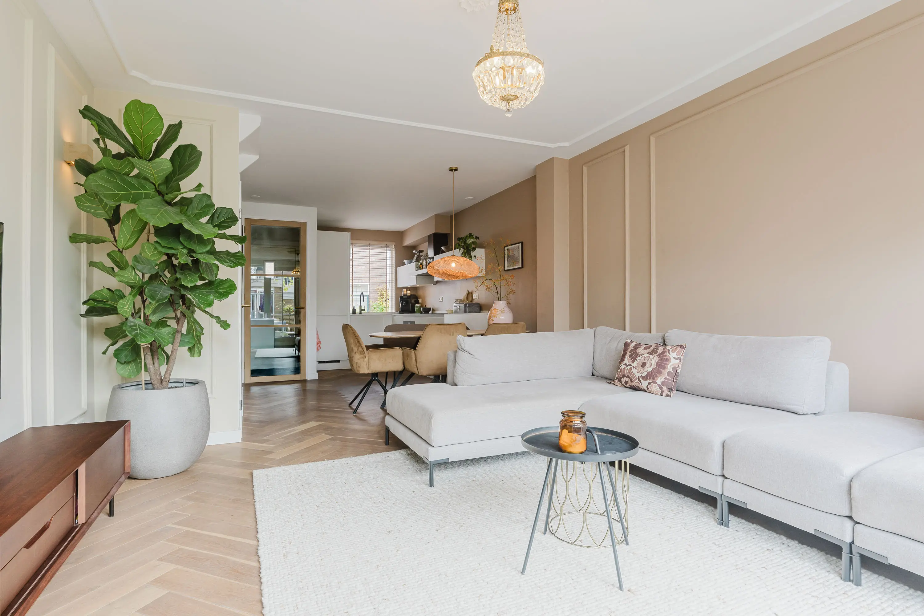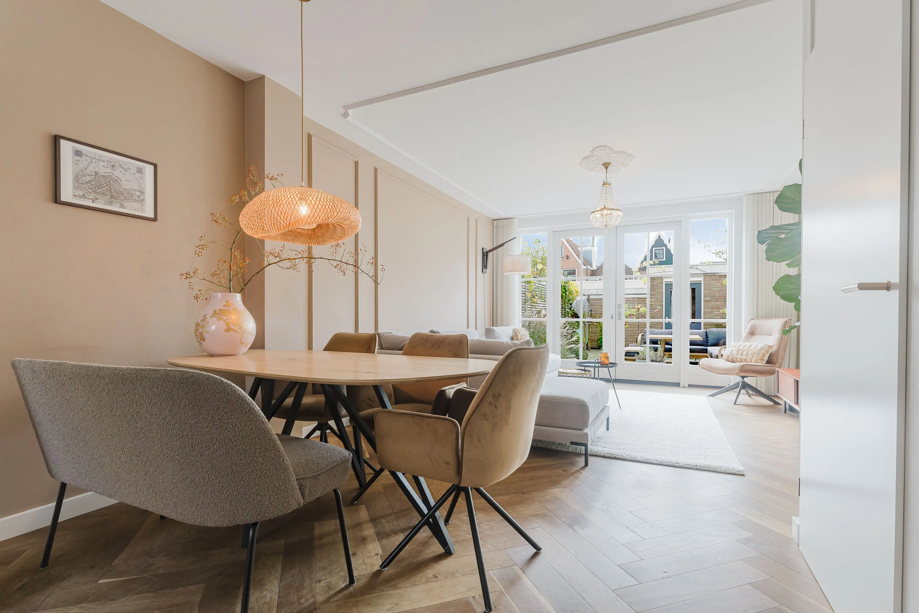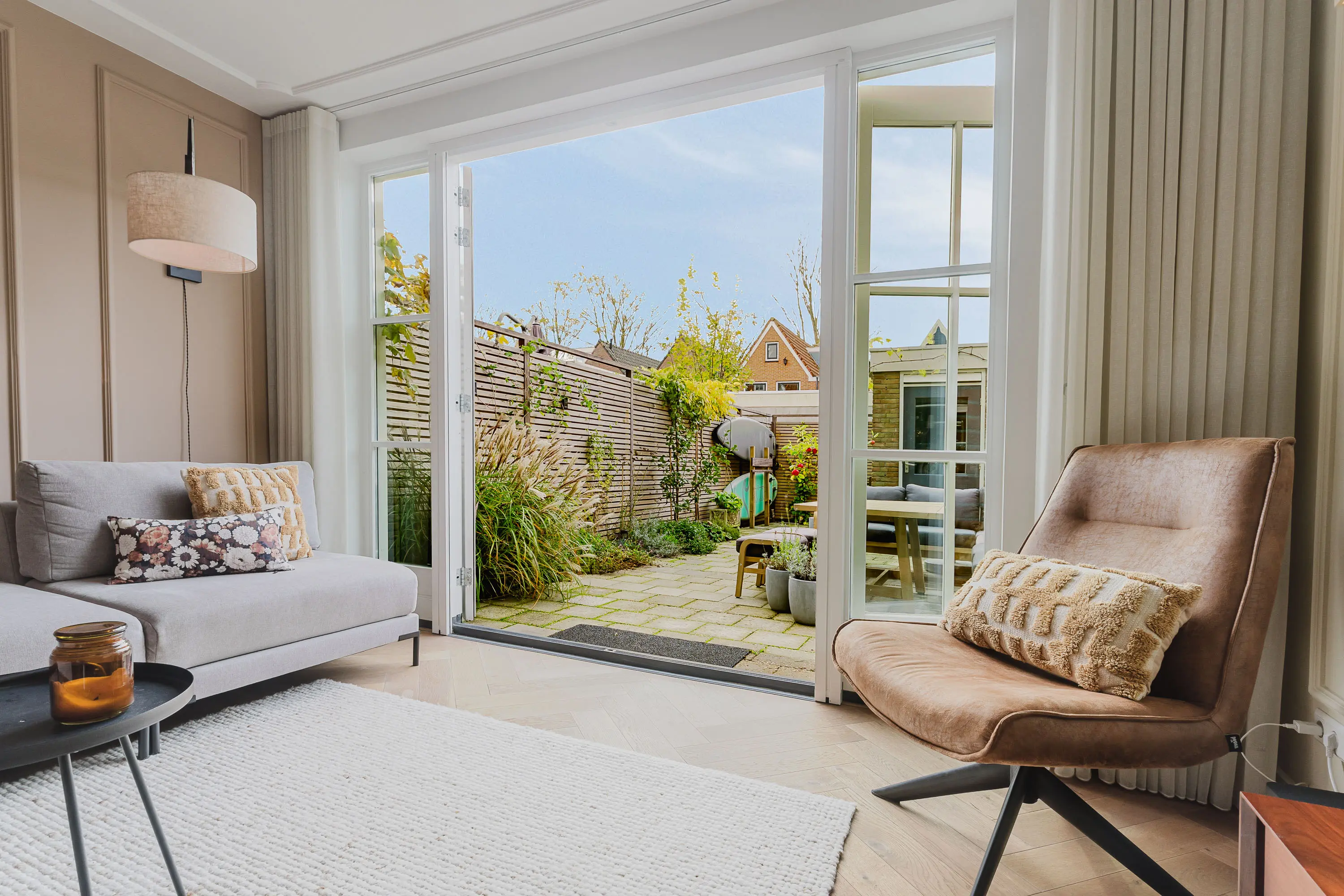 De woonkamer is licht en ruim, dankzij de vernieuwde achterpui met openslaande deuren naar de tuin. Hier geniet je van een fijne zithoek en een royale eethoek met ruimte voor lange avonden tafelen.