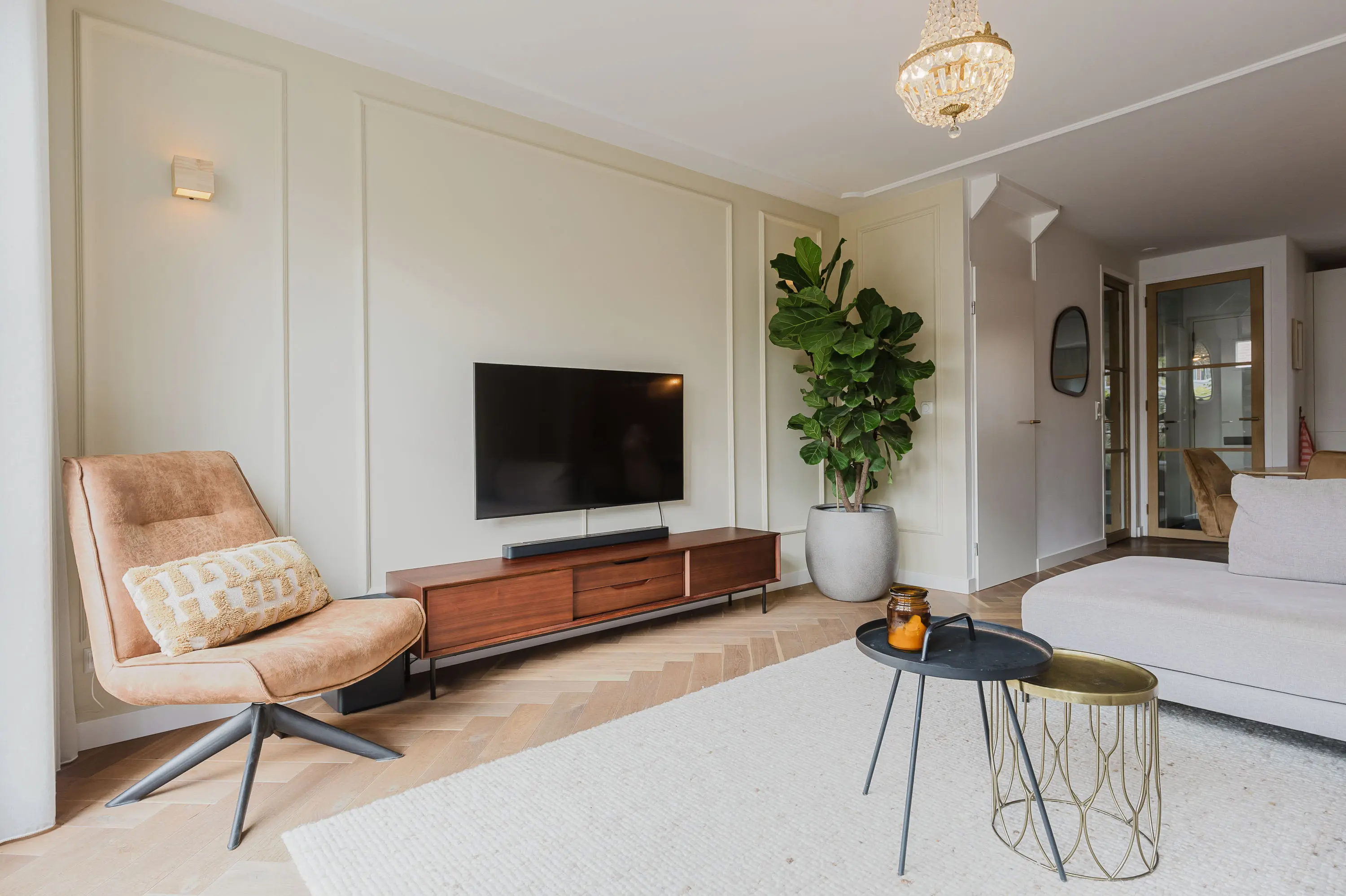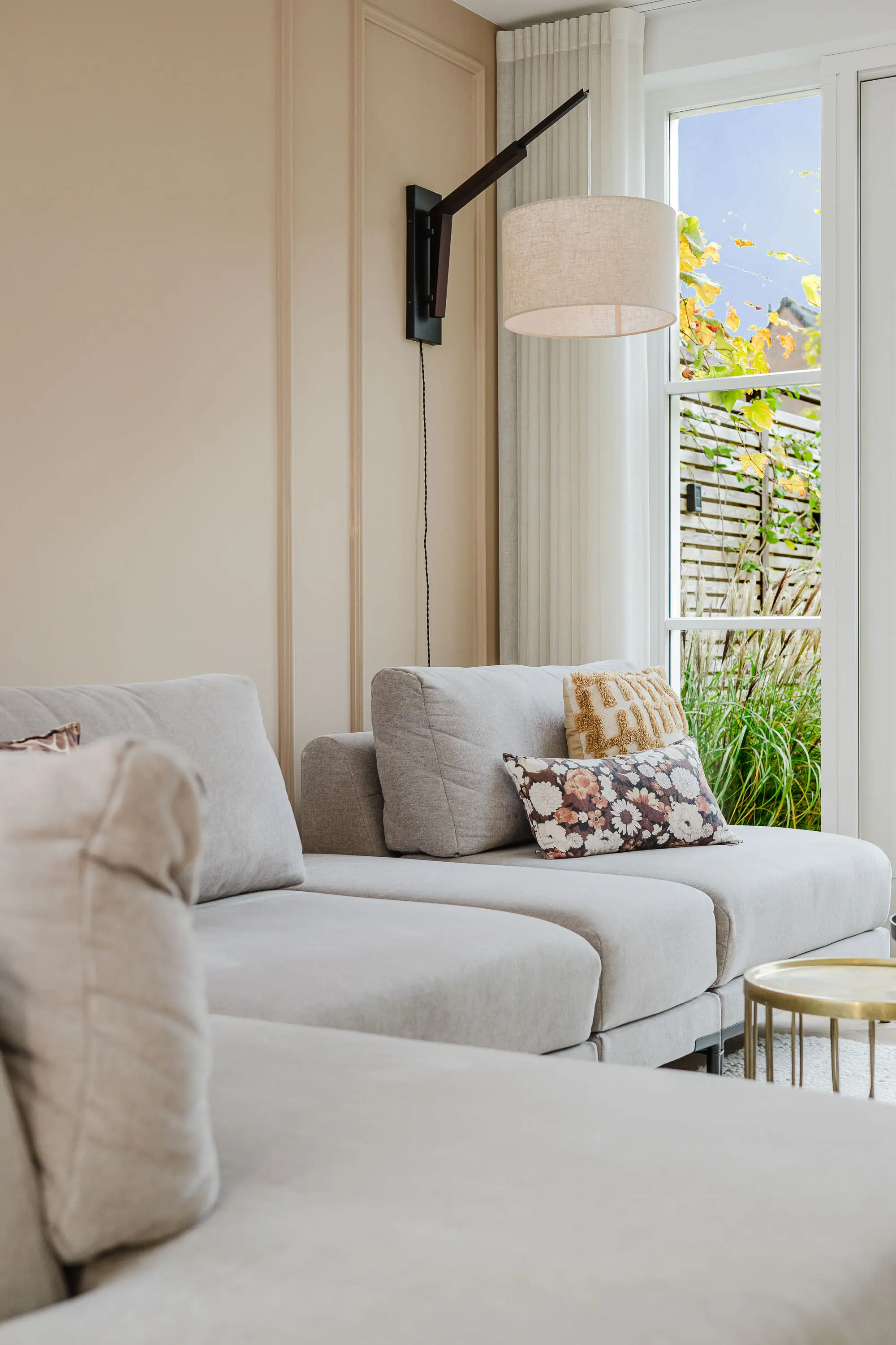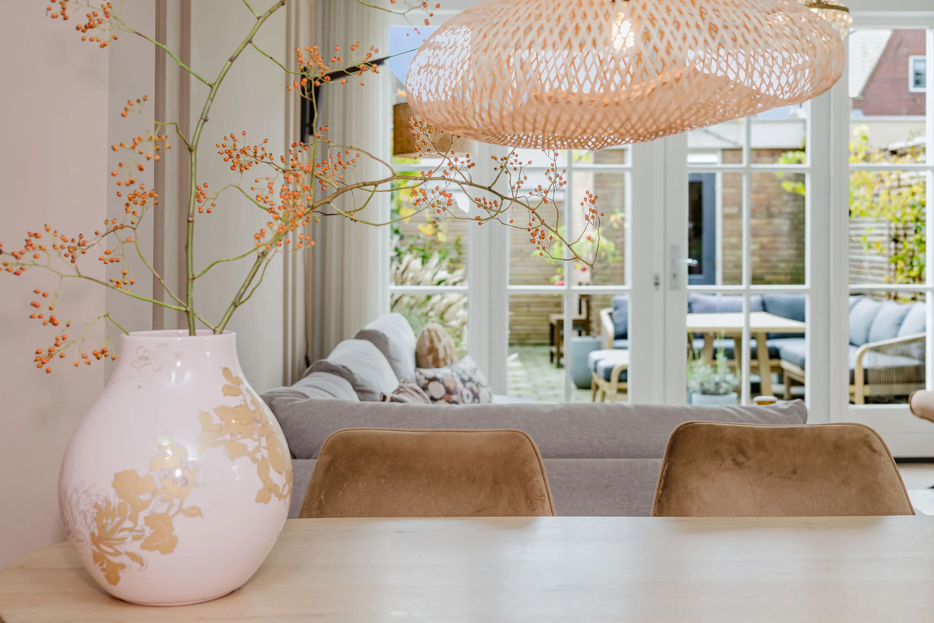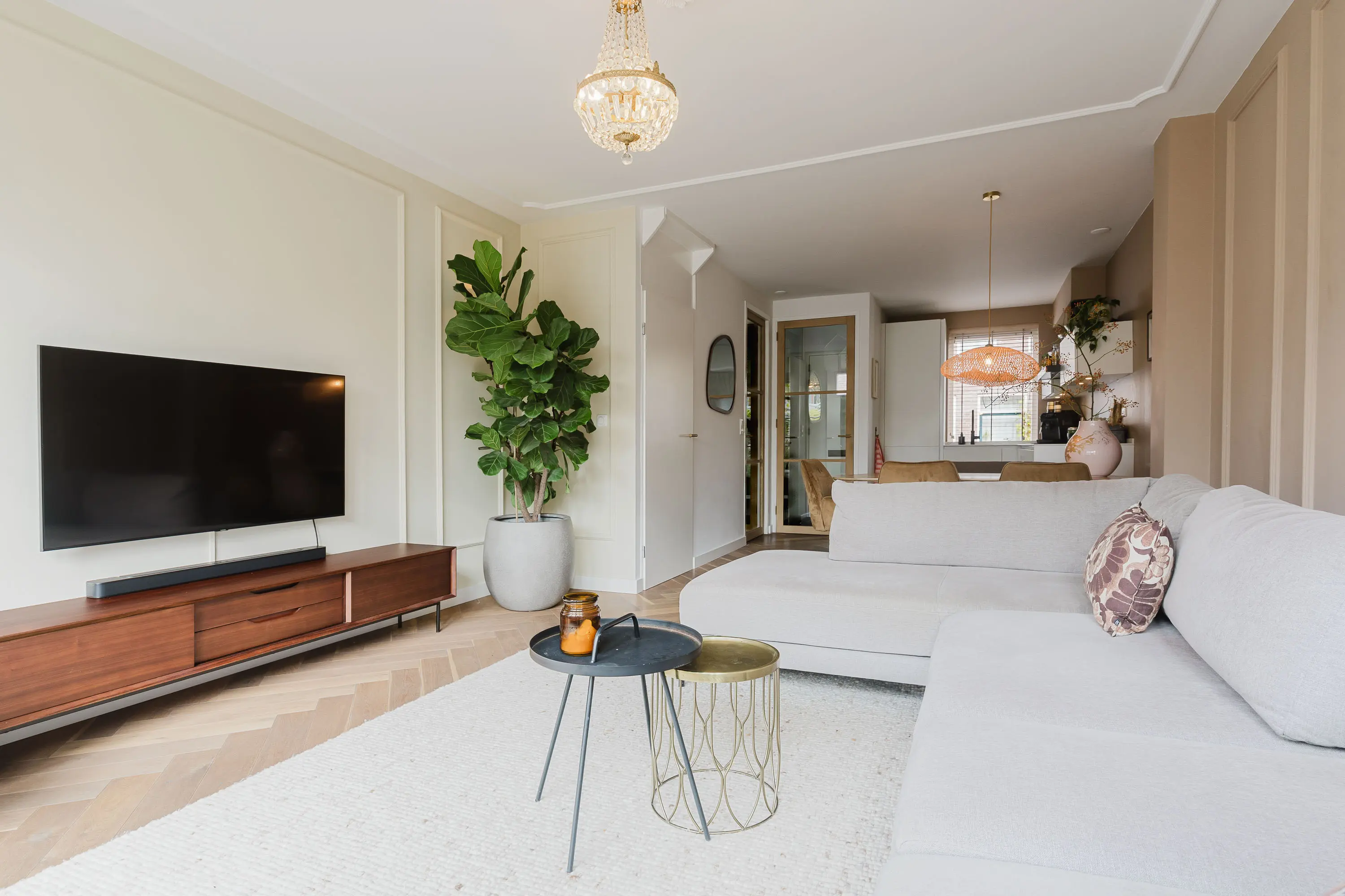 De woonkamer is licht en ruim, dankzij de vernieuwde achterpui met openslaande deuren naar de tuin. Hier geniet je van een fijne zithoek en een royale eethoek met ruimte voor lange avonden tafelen.
