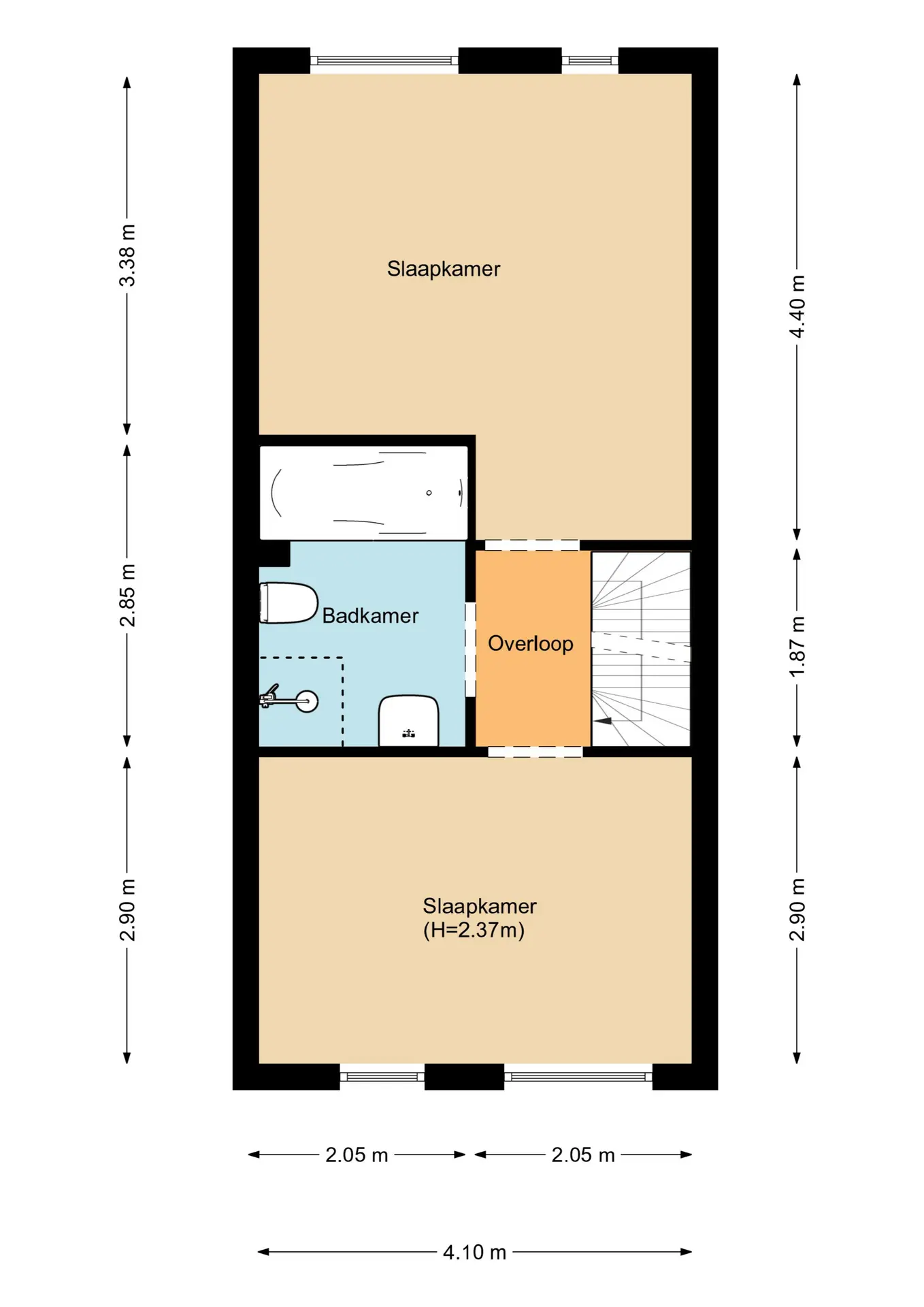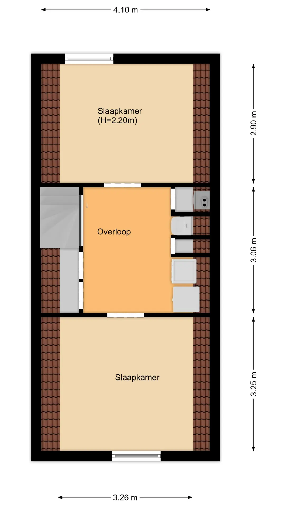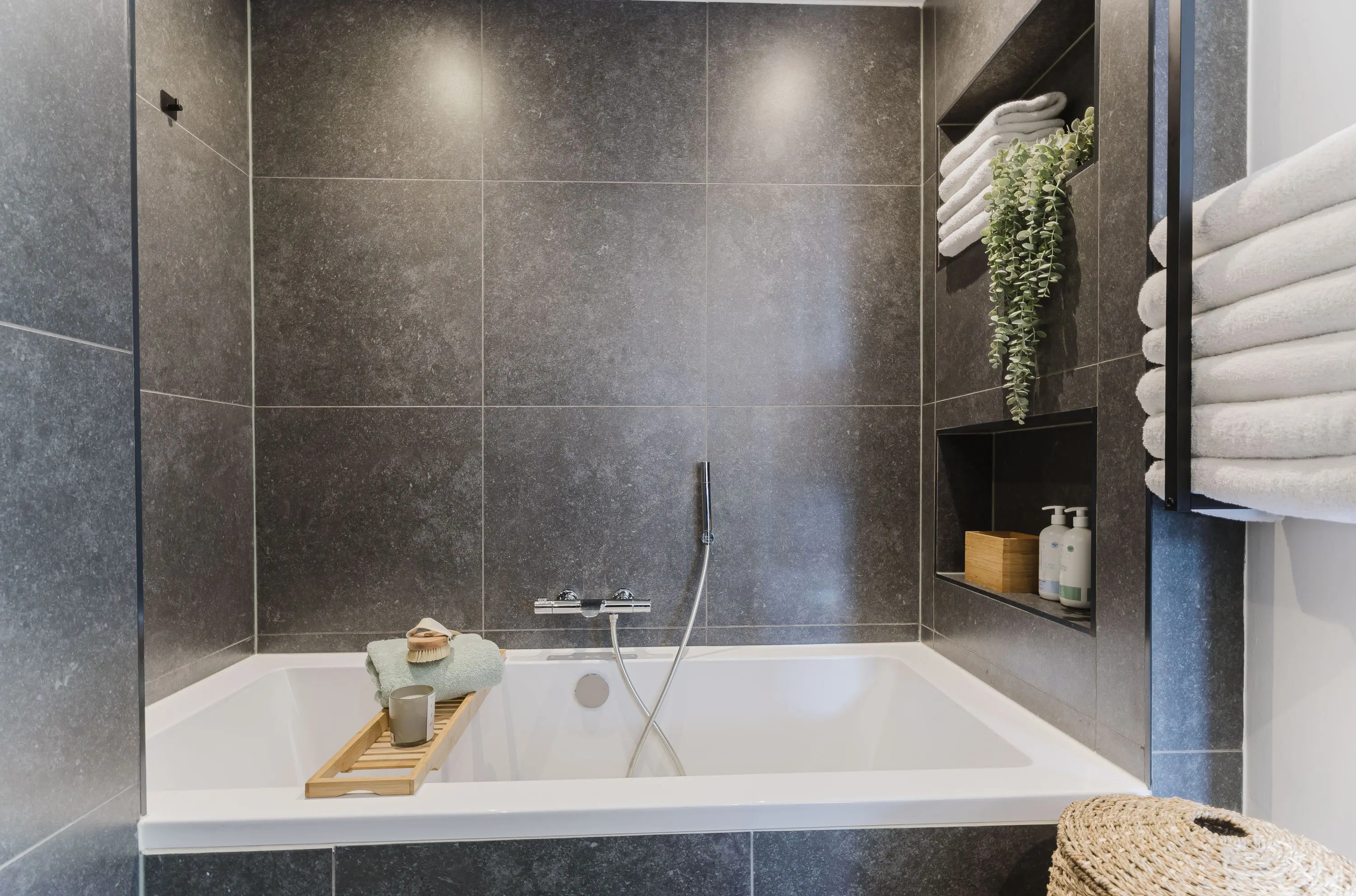 De overloop geeft toegang tot twee ruime slaapkamers — één aan de voorzijde en één aan de achterzijde, beide over de volledige breedte van de woning. De badkamer, vernieuwd in 2020, straalt hotelallure uit: volledig betegeld, met een inloopdouche, ligbad, hangtoilet, wastafelmeubel en vloerverwarming.
