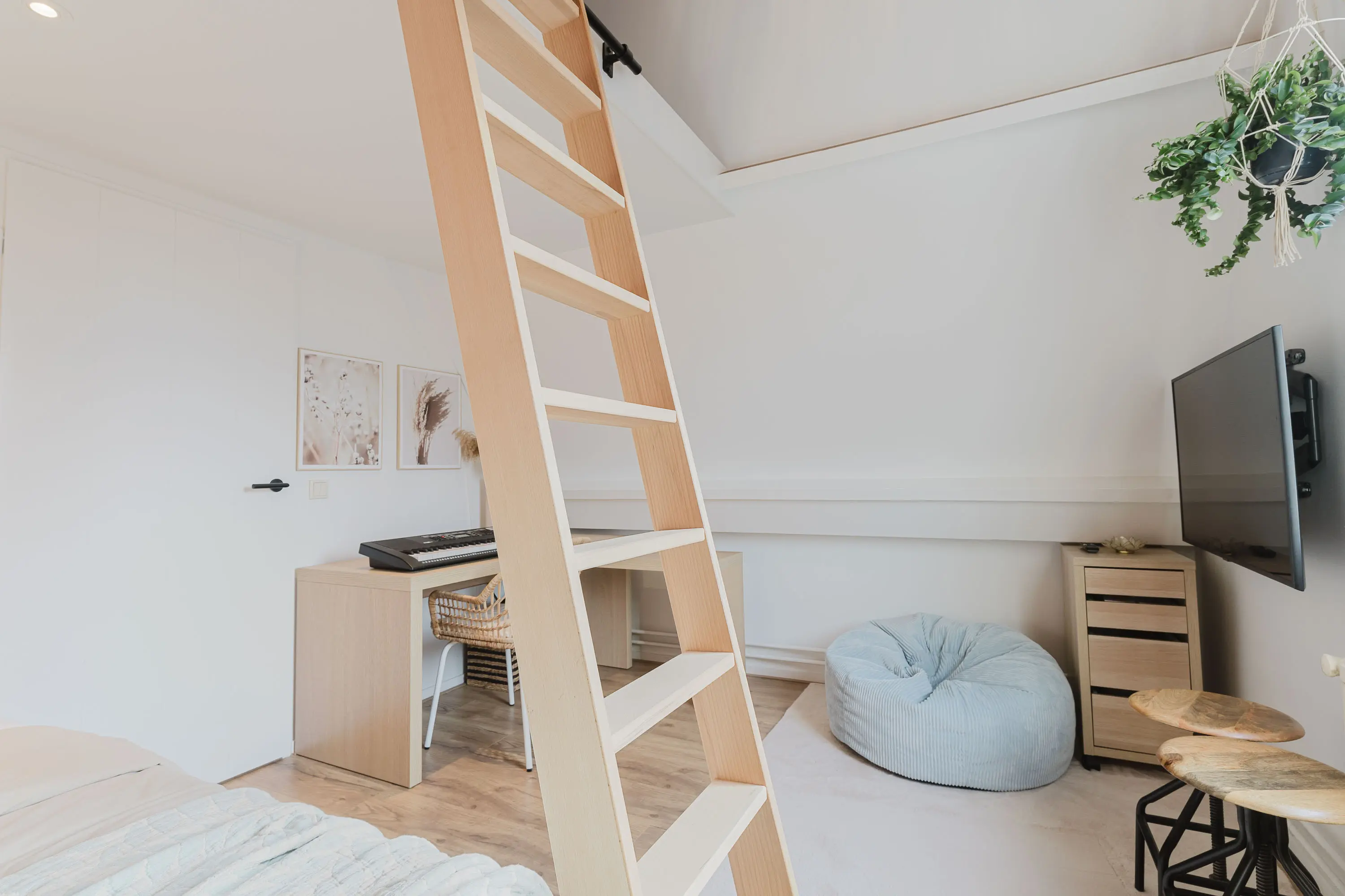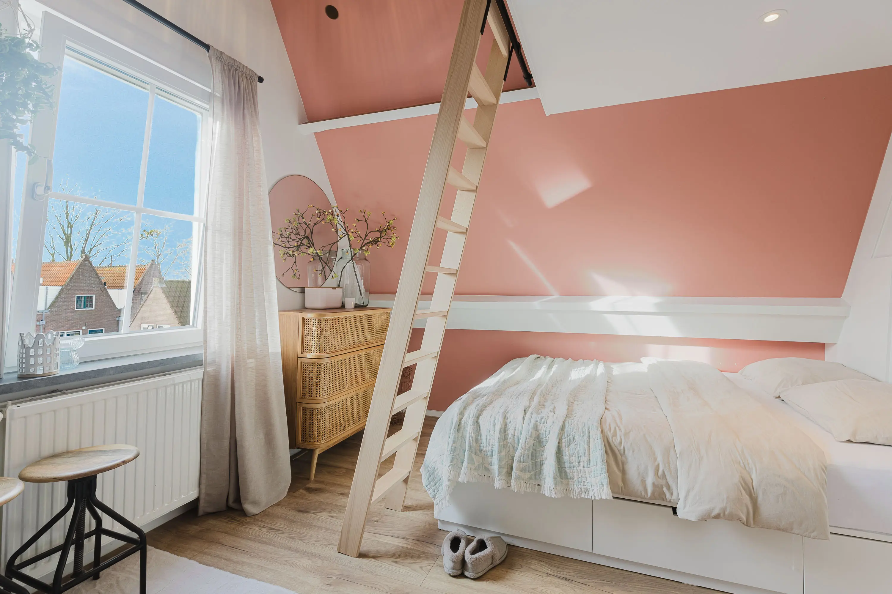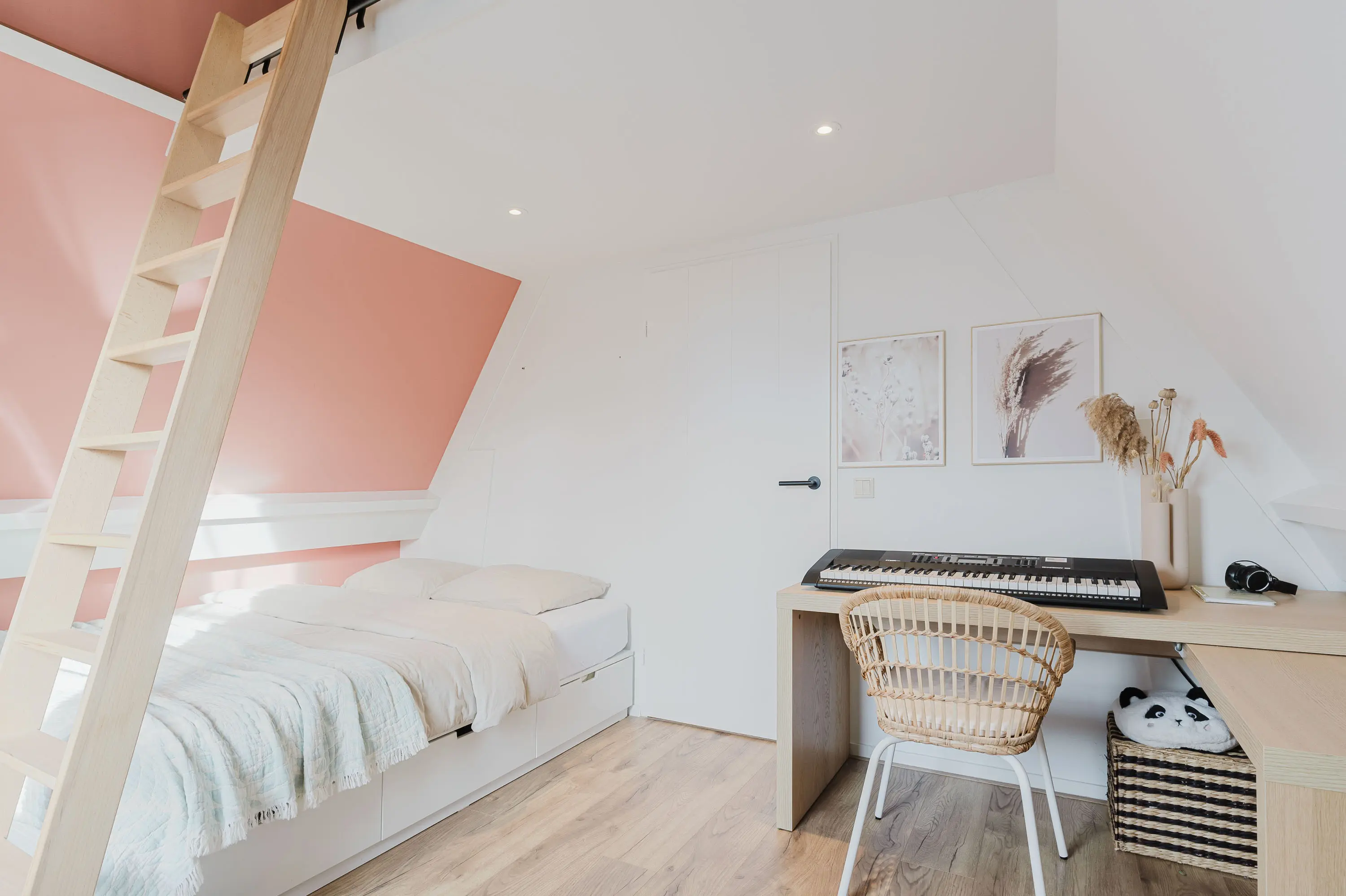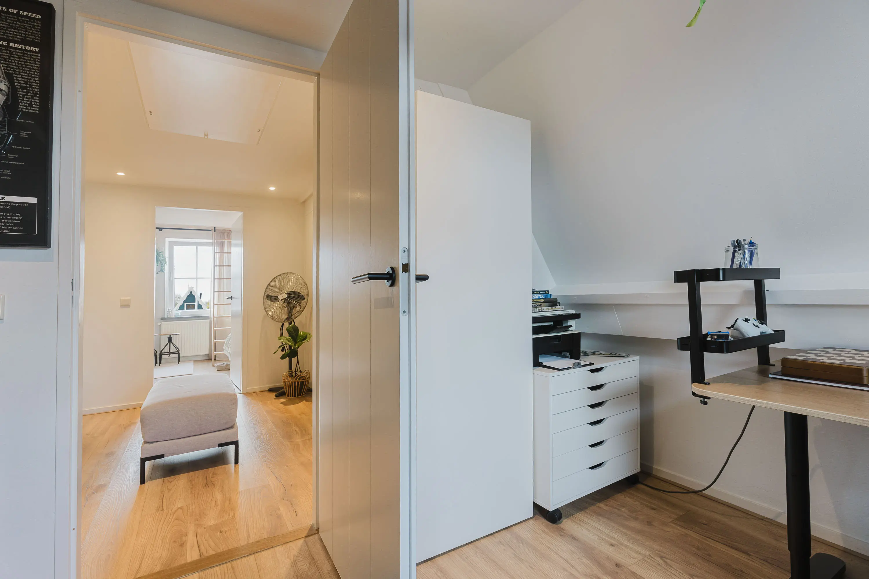 Via een vaste trap bereik je de tweede verdieping met nog eens twee lichte slaapkamers met een vide. Op de overloop zijn keurige kasten gerealiseerd voor het plaatsen van de wasmachine en droger, tevens is hier nog een wastafel geplaatst en biedt een vliering nog extra opbergruimte.