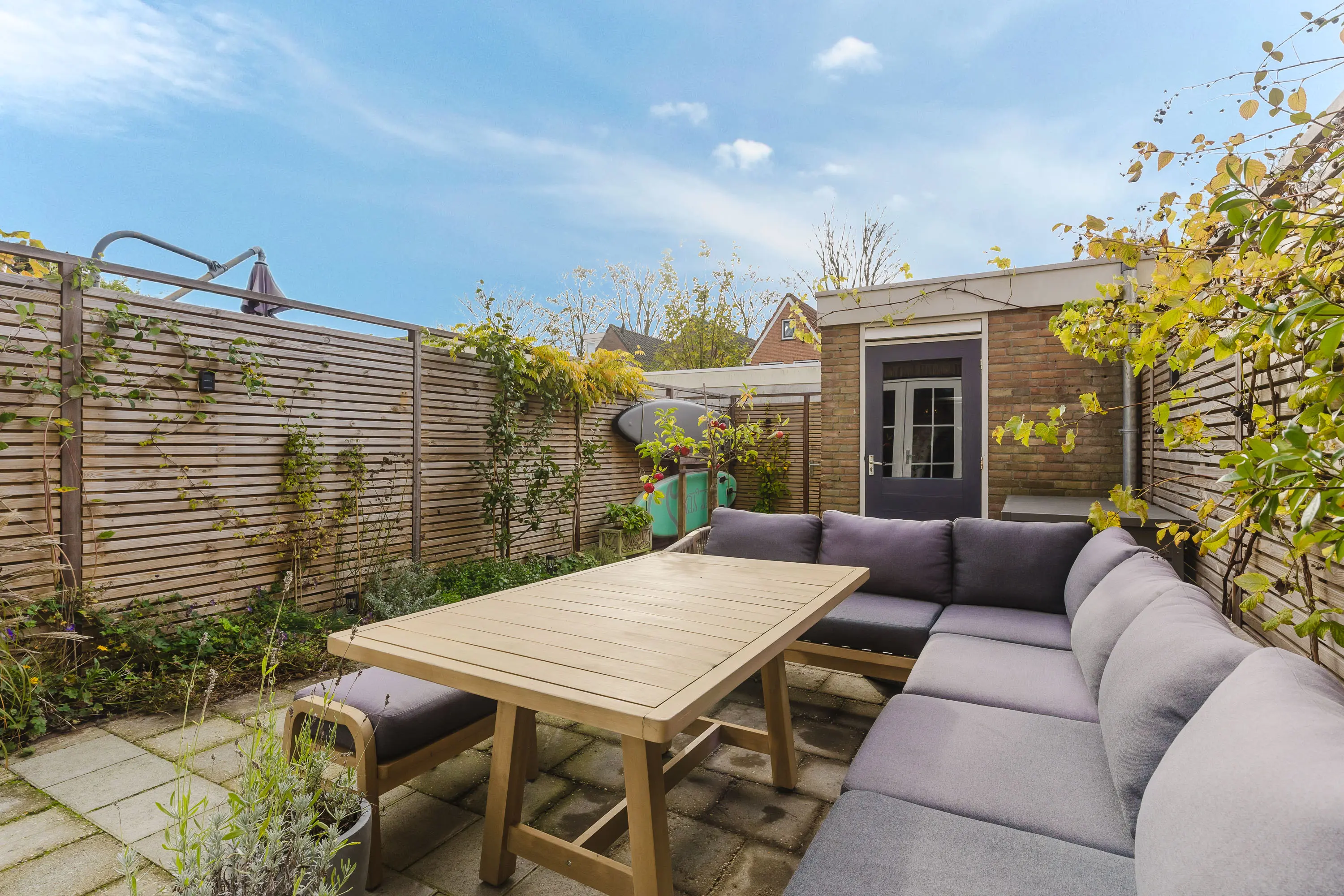 De zonnige achtertuin is fraai aangelegd, onderhoudsvriendelijk en biedt volop privacy. Dankzij de ligging op het zuiden geniet je hier de hele dag van de zon. Achterin bevindt zich een ruime stenen berging, ideaal voor fietsen en extra opslag, en er is een handige achterom. Via dit achterom wandel je eenvoudig naar het markermeer!