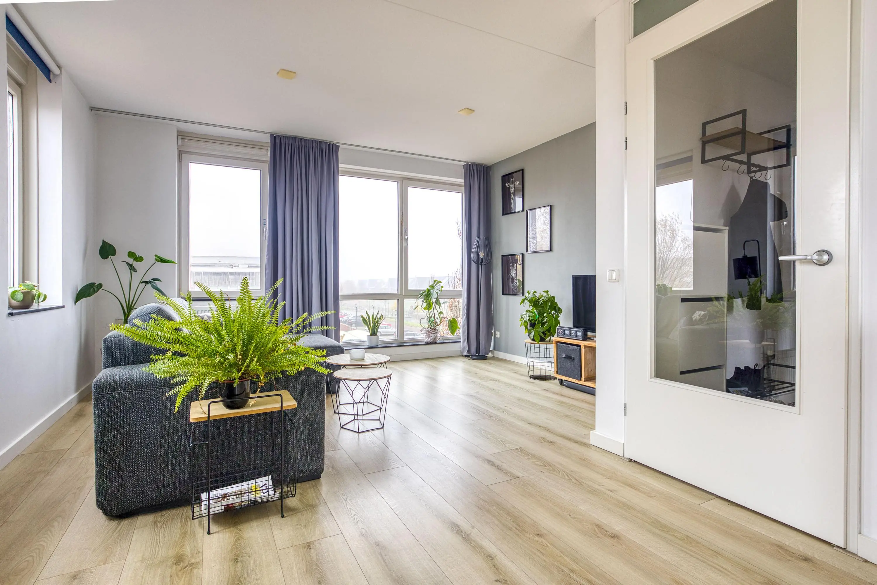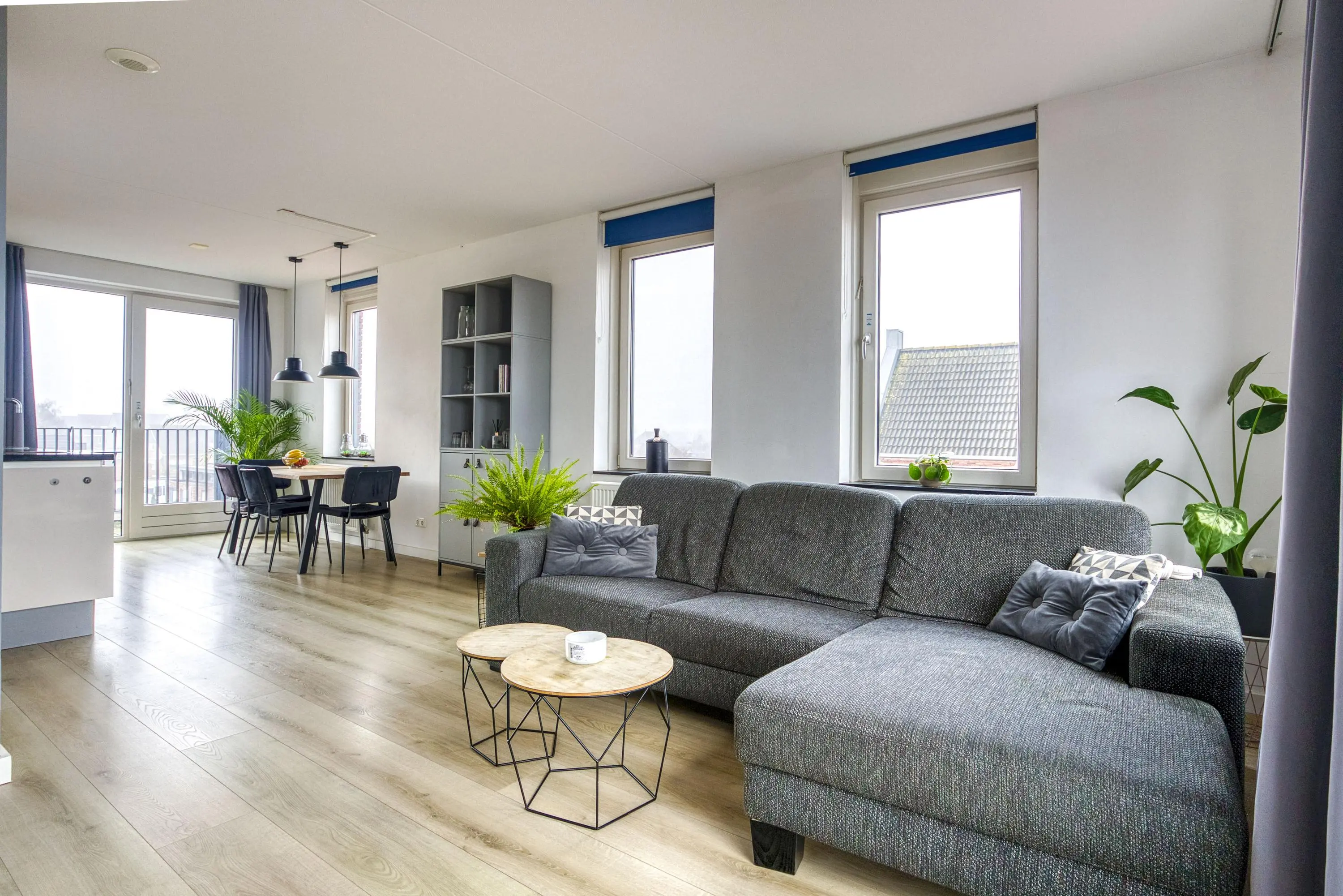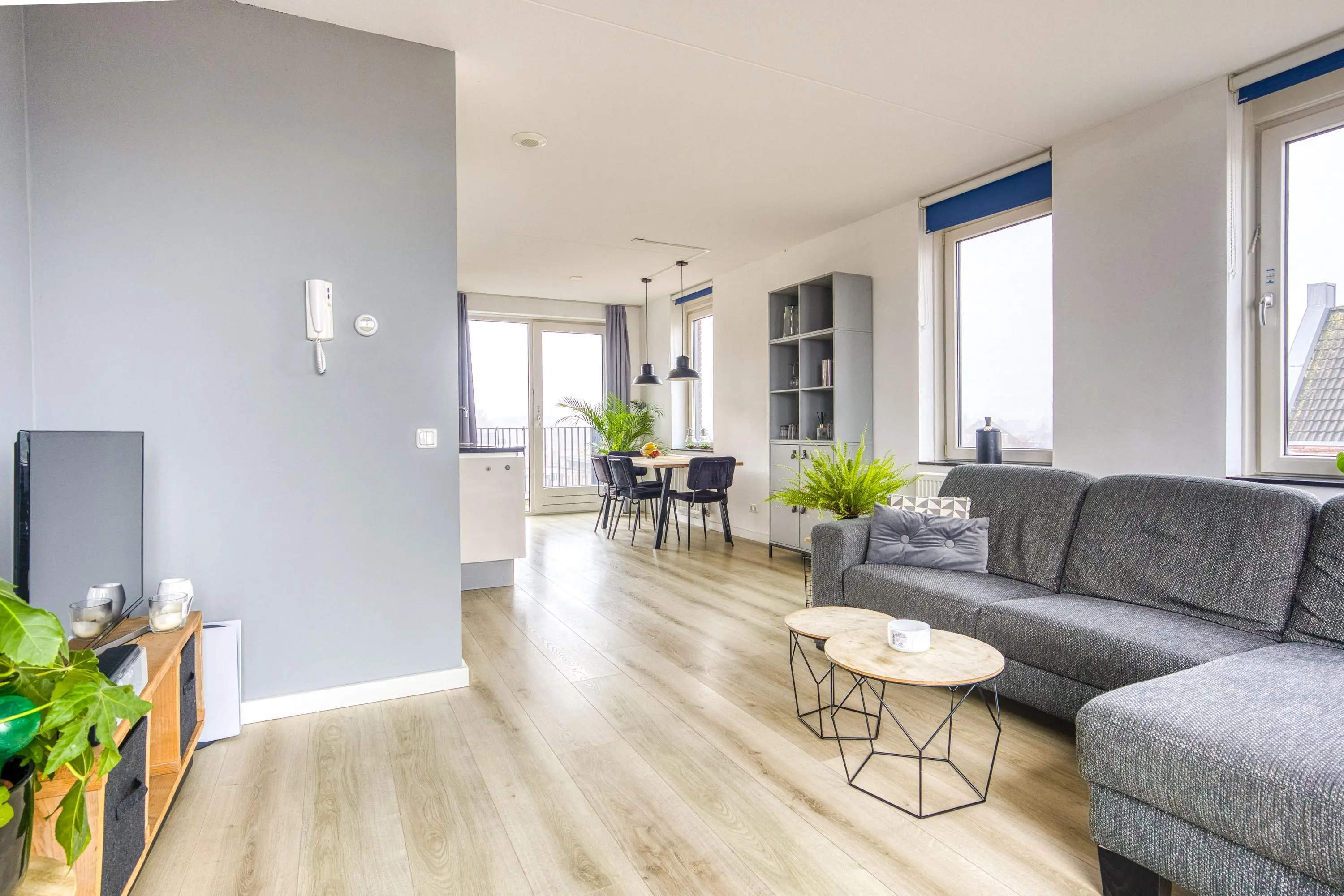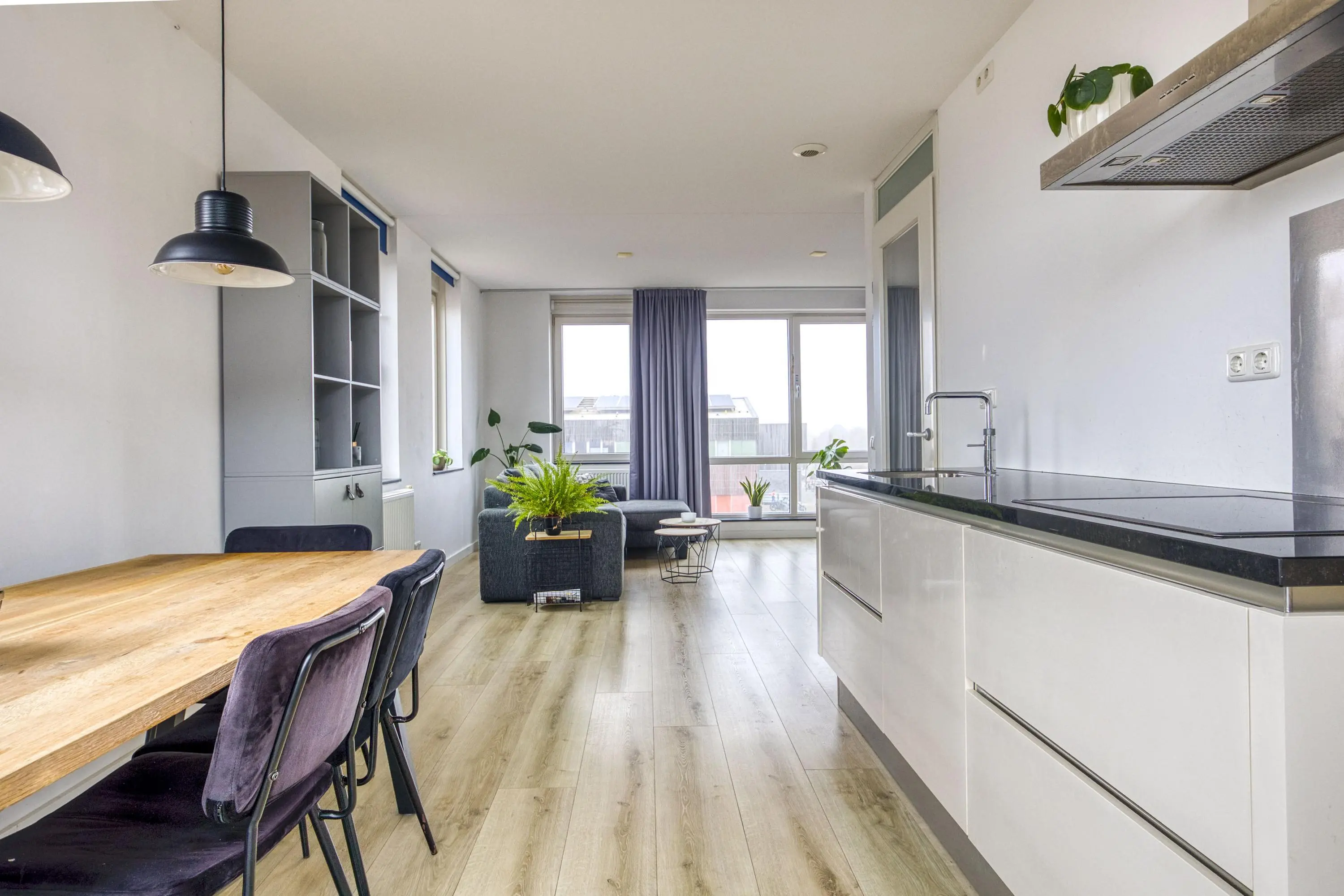 De lichte L-vormige woonkamer is heerlijk ruimtelijk en vormt samen met de open keuken (met diverse inbouwapparatuur) een prettige leefruimte. Via de woonkamer stap je het zonnige balkon op het zuidoosten op—hier geniet je van privacy, rust en een vrij uitzicht.