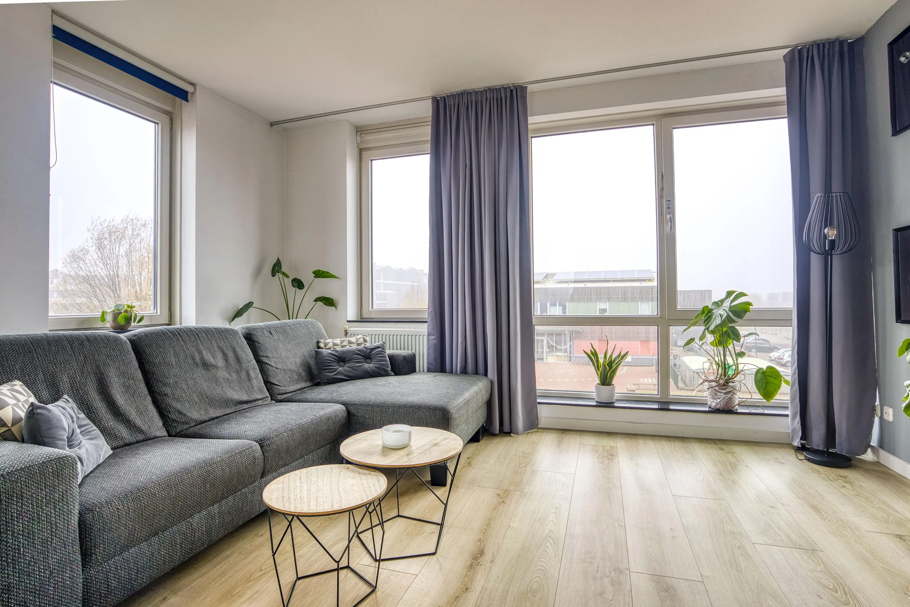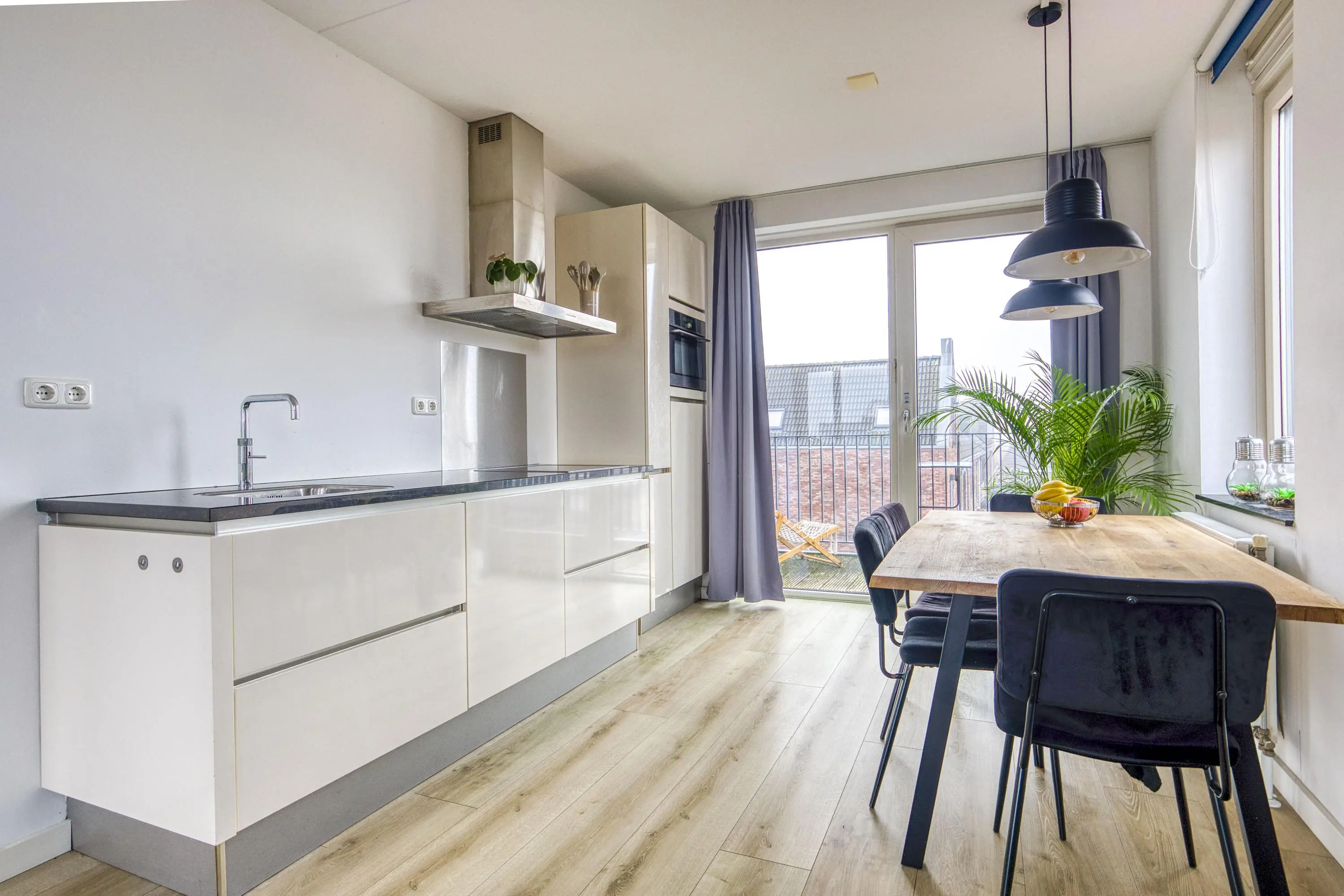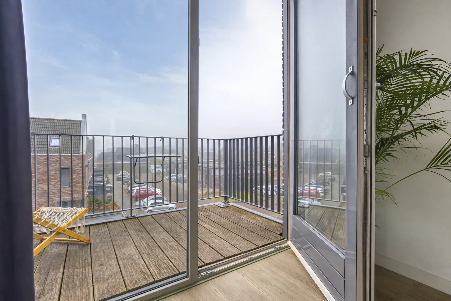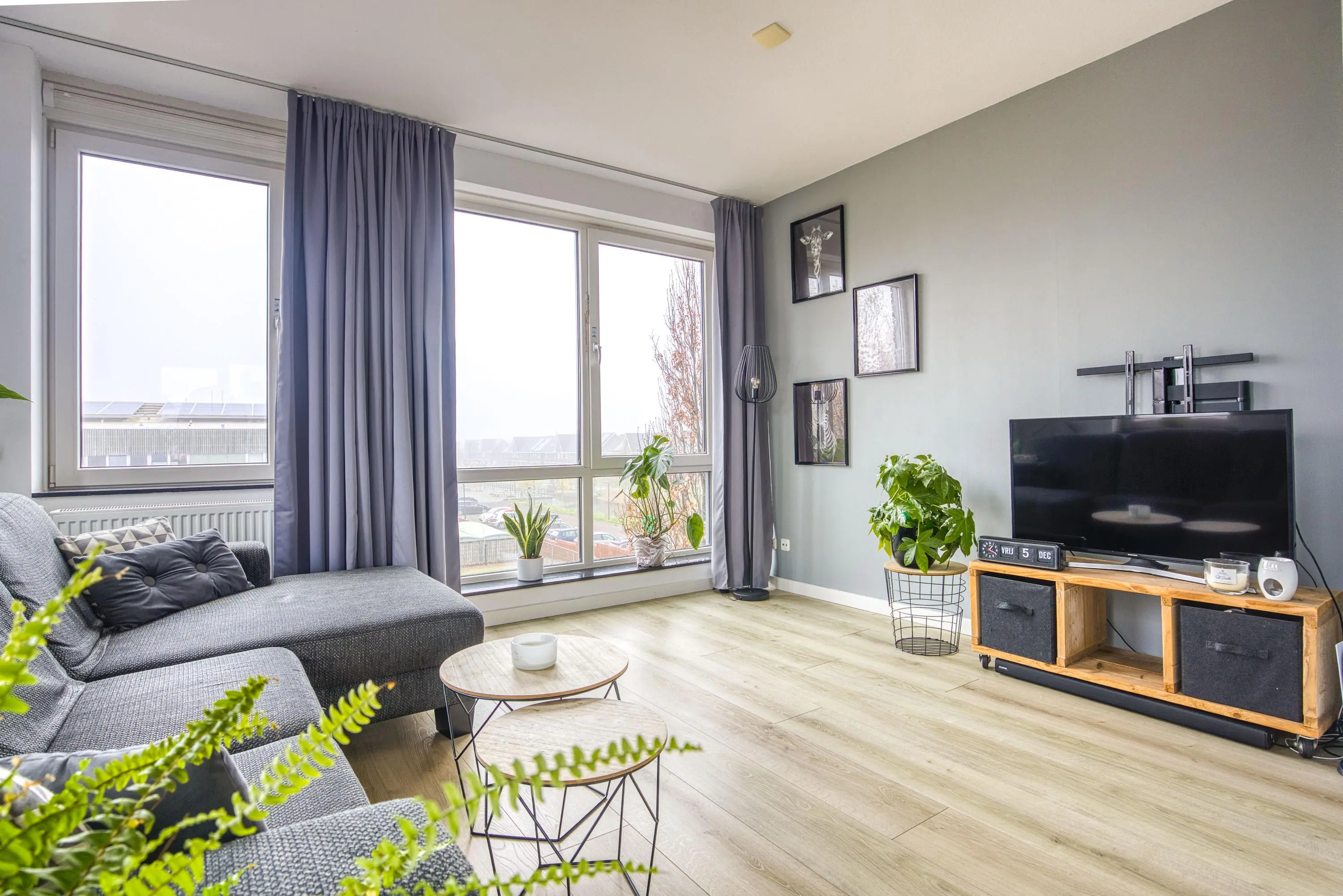 De lichte L-vormige woonkamer is heerlijk ruimtelijk en vormt samen met de open keuken (met diverse inbouwapparatuur) een prettige leefruimte. Via de woonkamer stap je het zonnige balkon op het zuidoosten op—hier geniet je van privacy, rust en een vrij uitzicht.