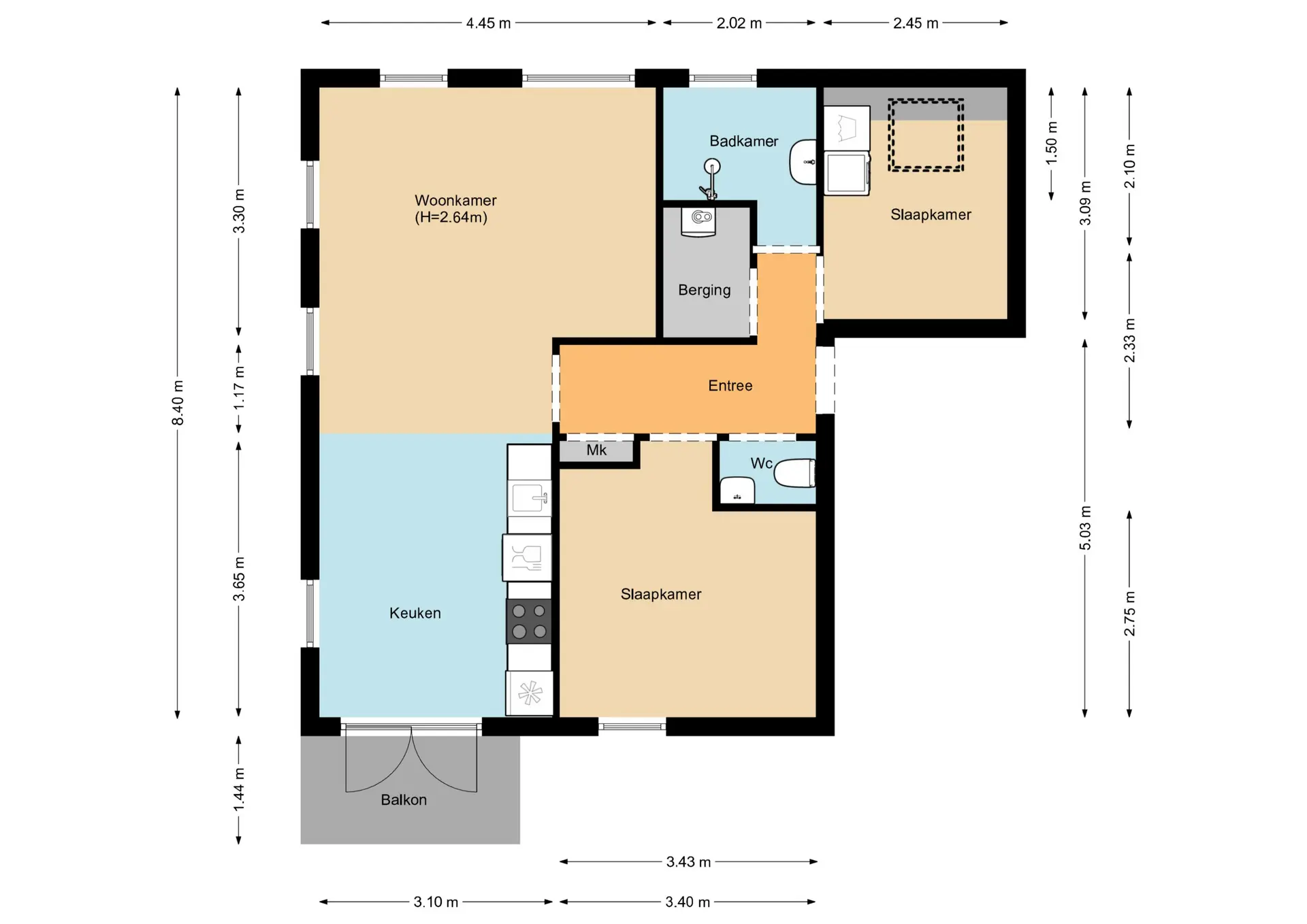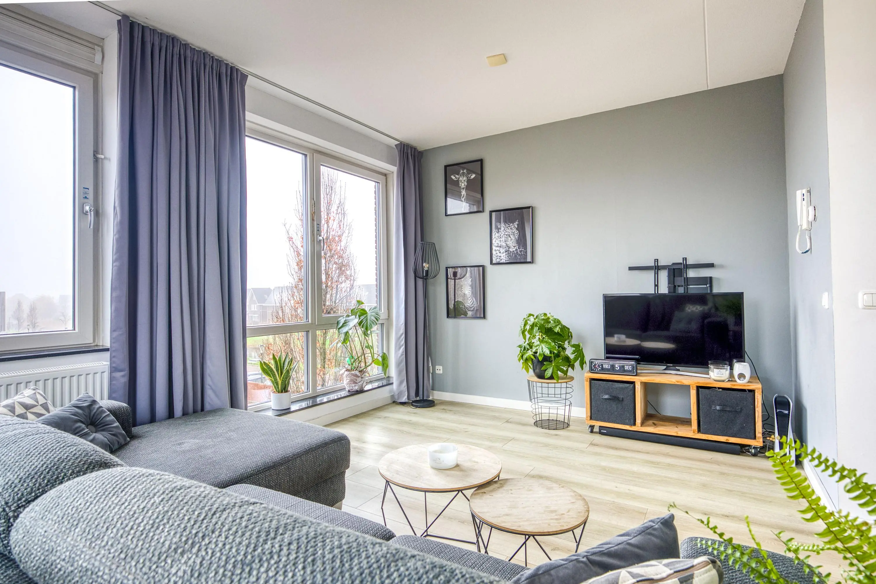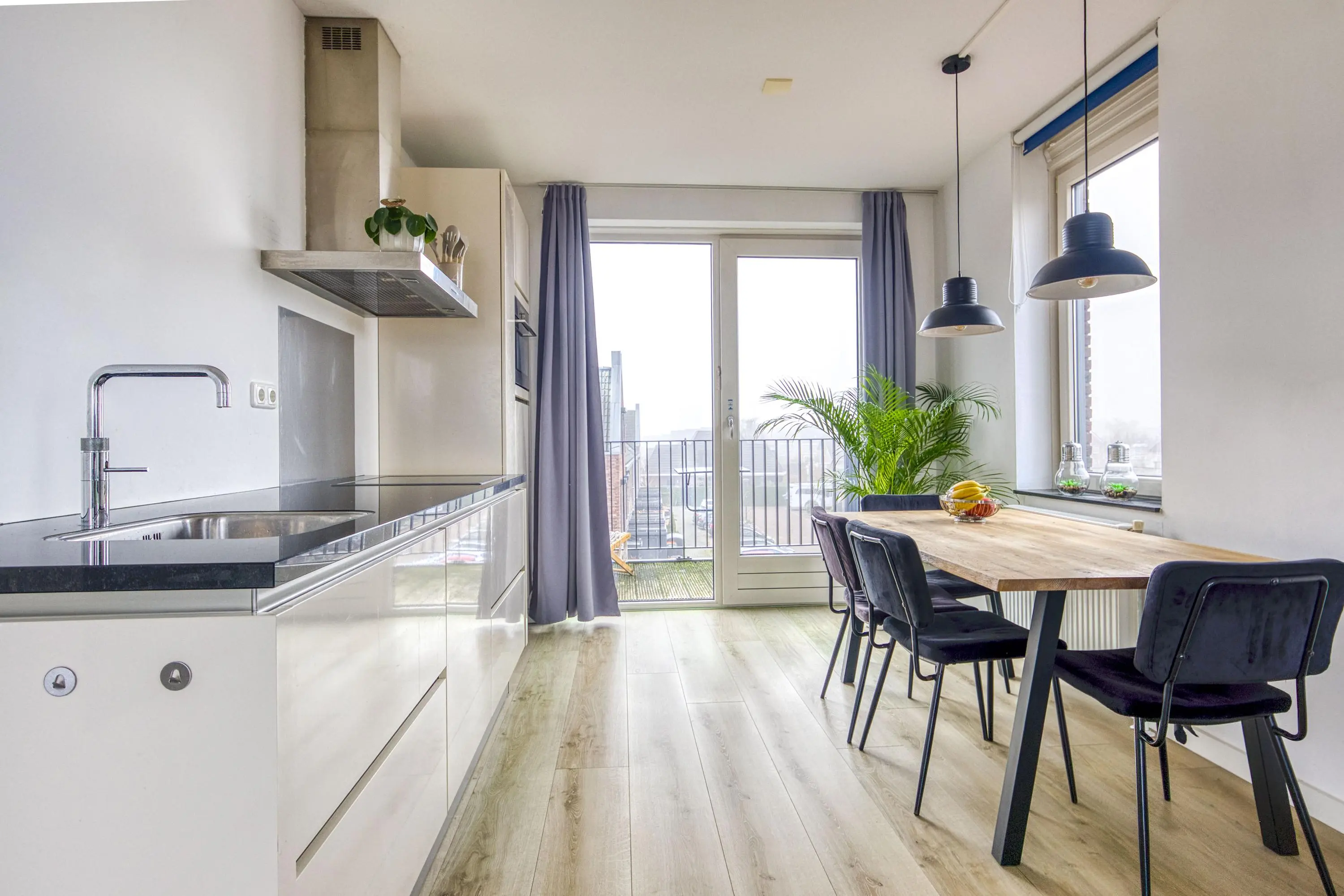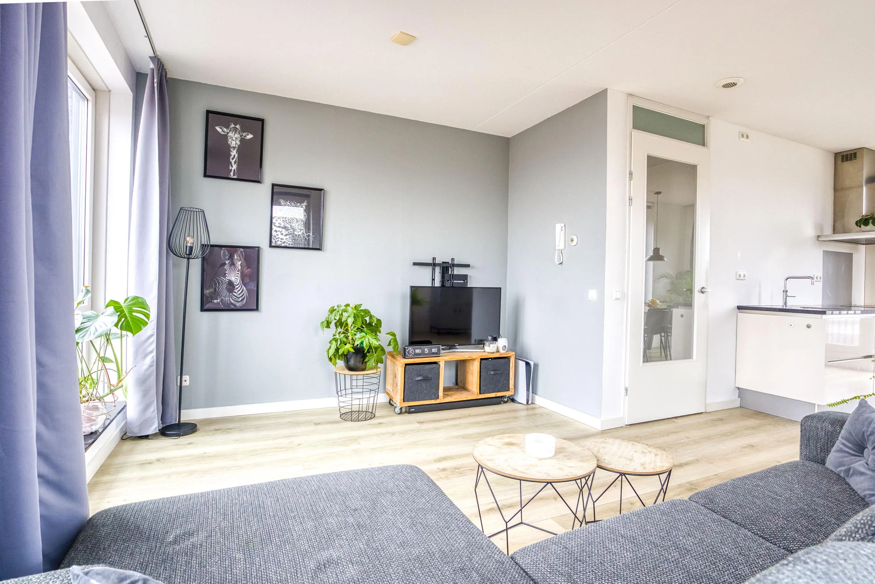 De lichte L-vormige woonkamer is heerlijk ruimtelijk en vormt samen met de open keuken (met diverse inbouwapparatuur) een prettige leefruimte. Via de woonkamer stap je het zonnige balkon op het zuidoosten op—hier geniet je van privacy, rust en een vrij uitzicht.