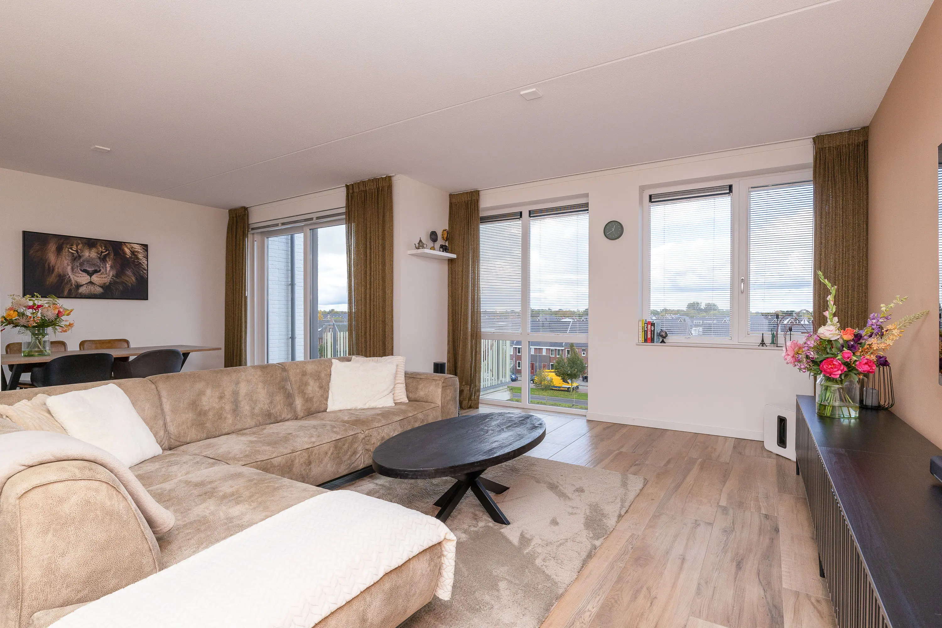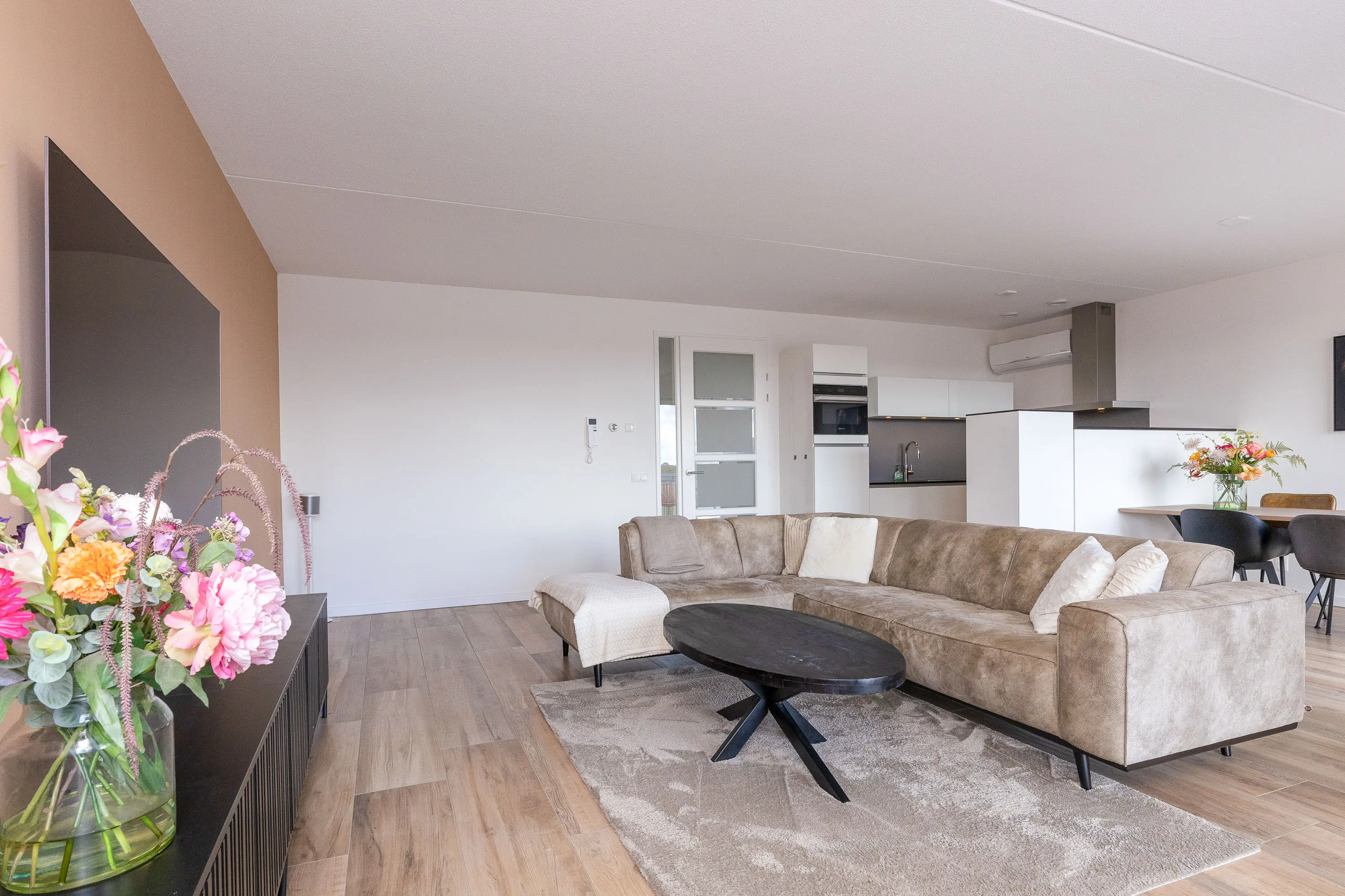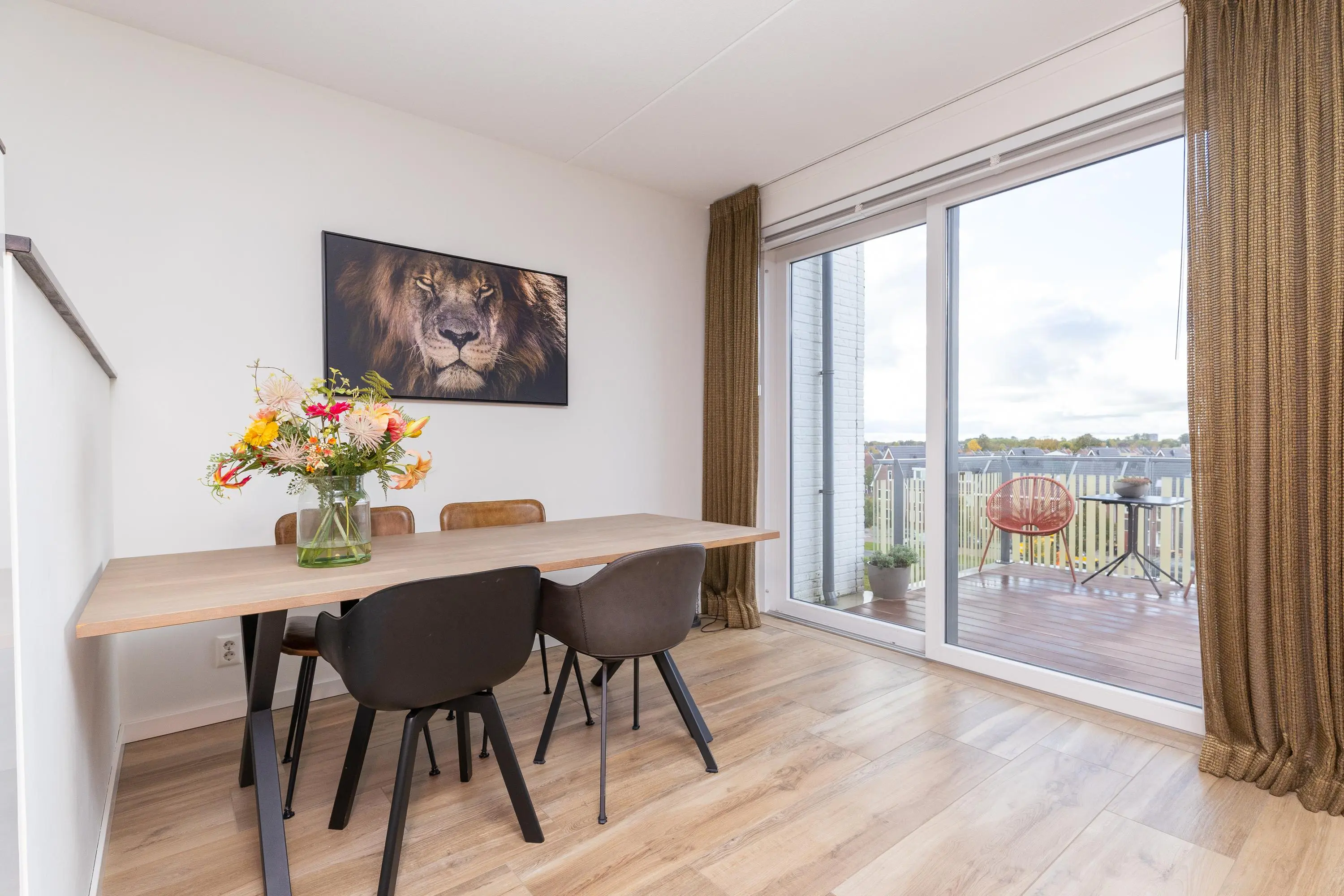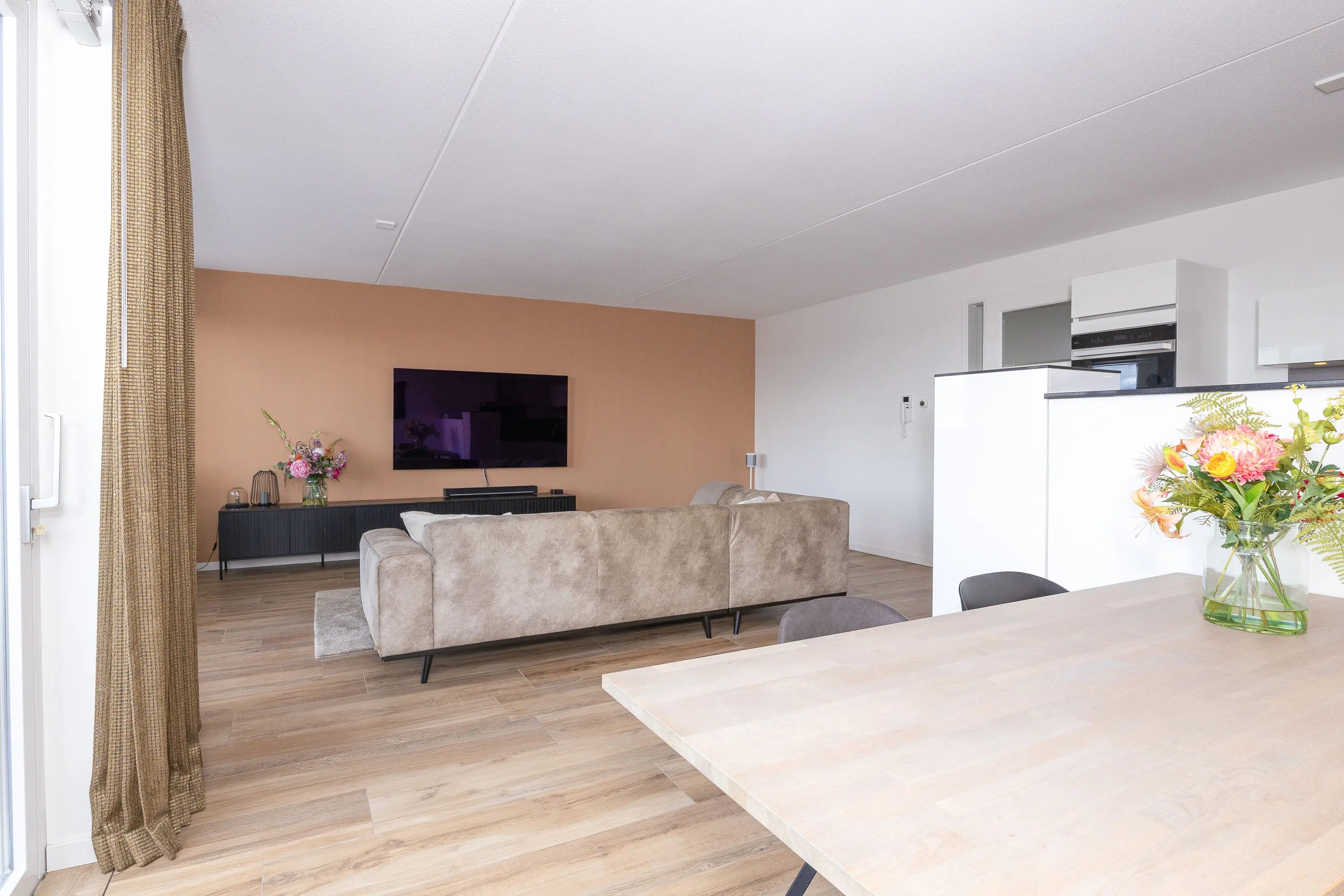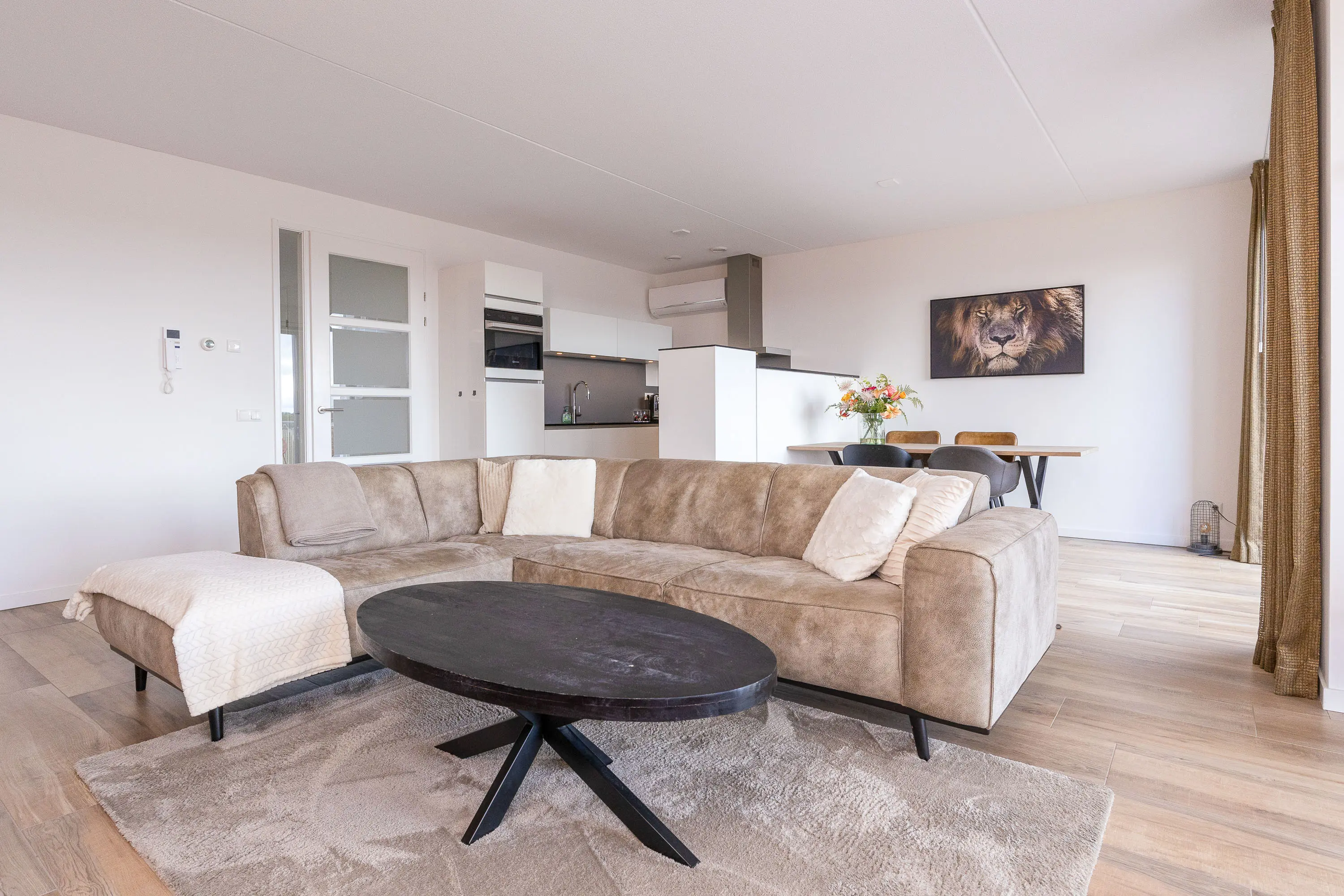 Geniet van de lichte woonkamer met directe toegang tot het ruime balkon op het zuidwesten: de ideale plek om te ontspannen met een goed glas wijn of een kop koffie in de middag- en avondzon.