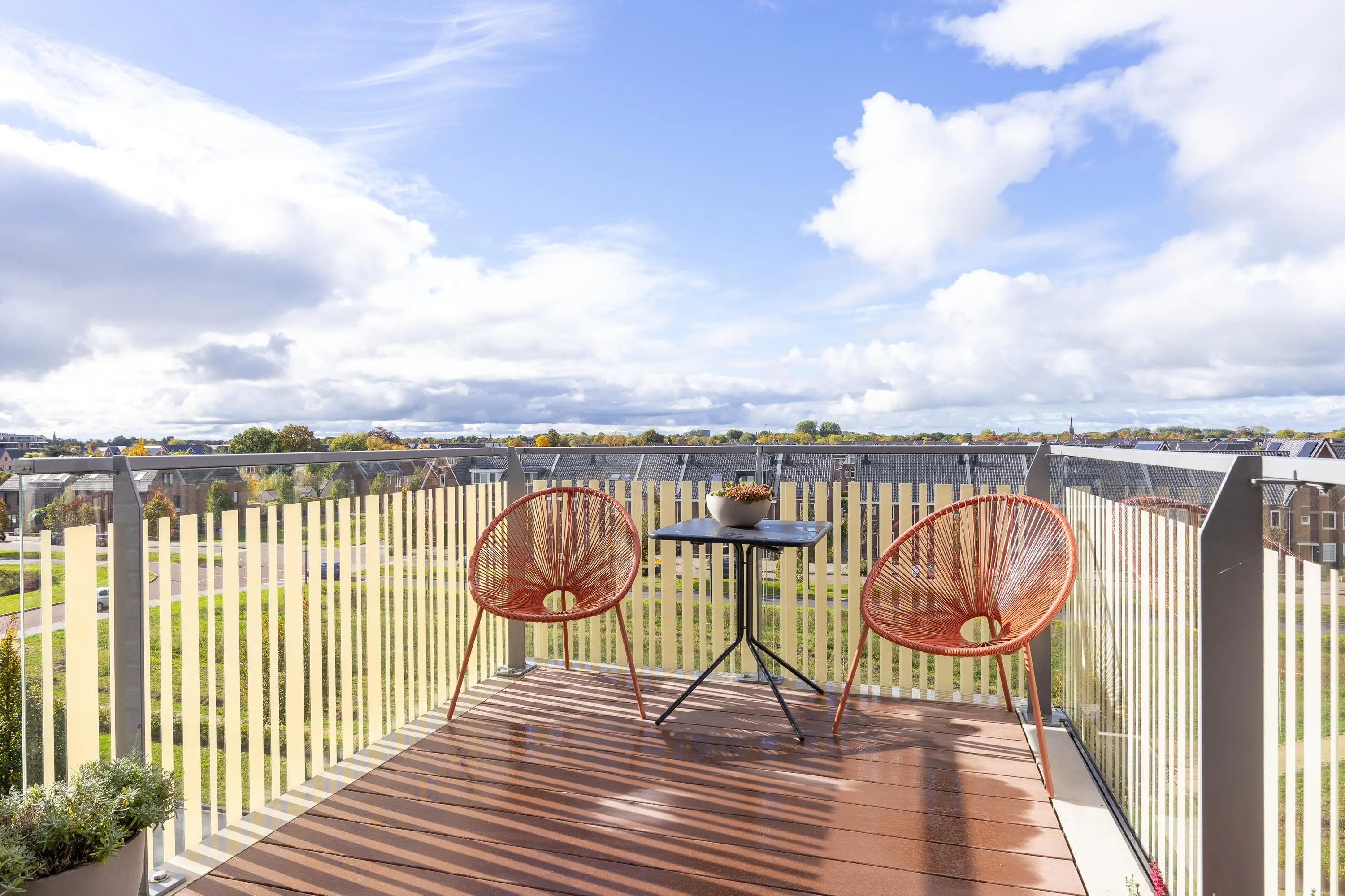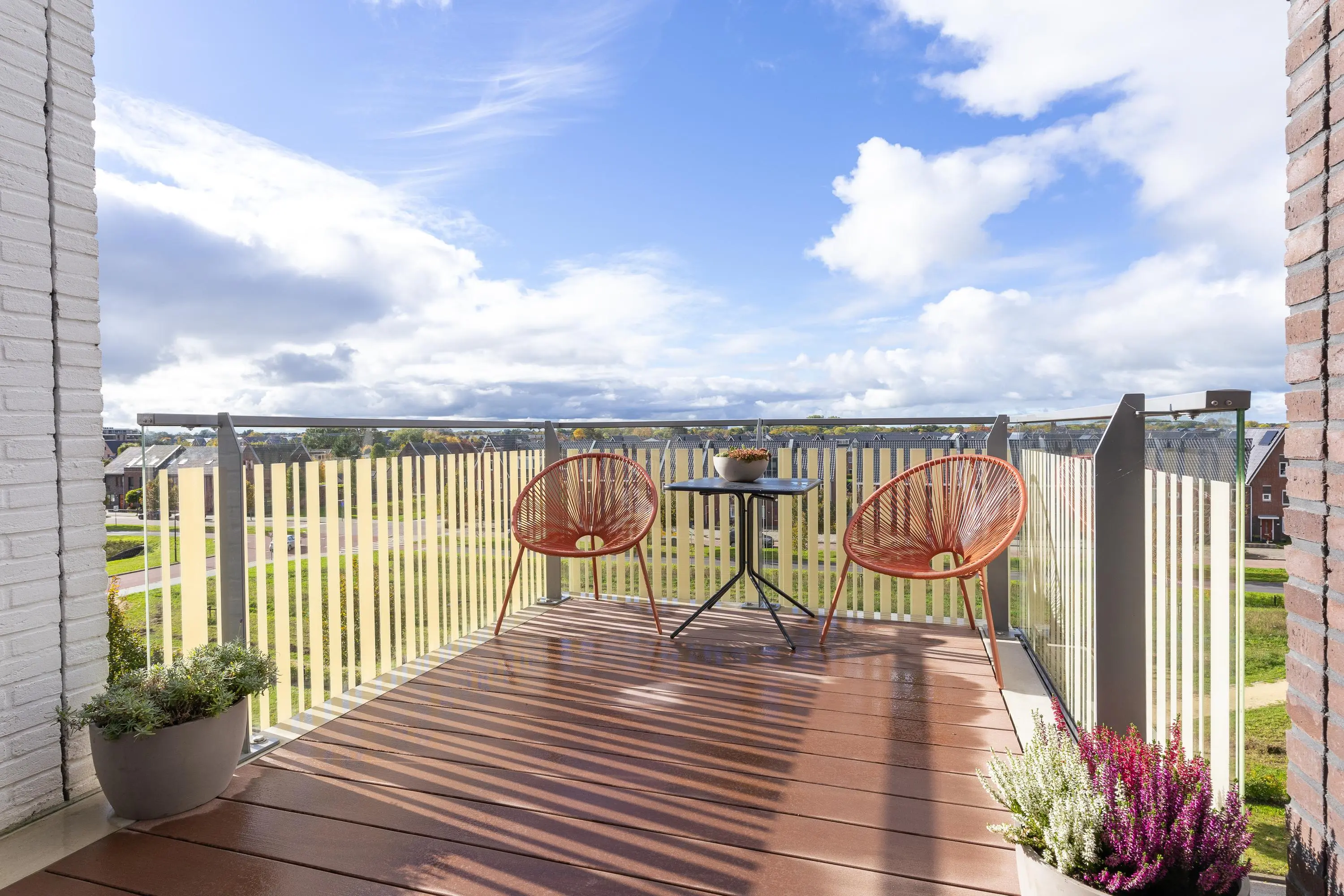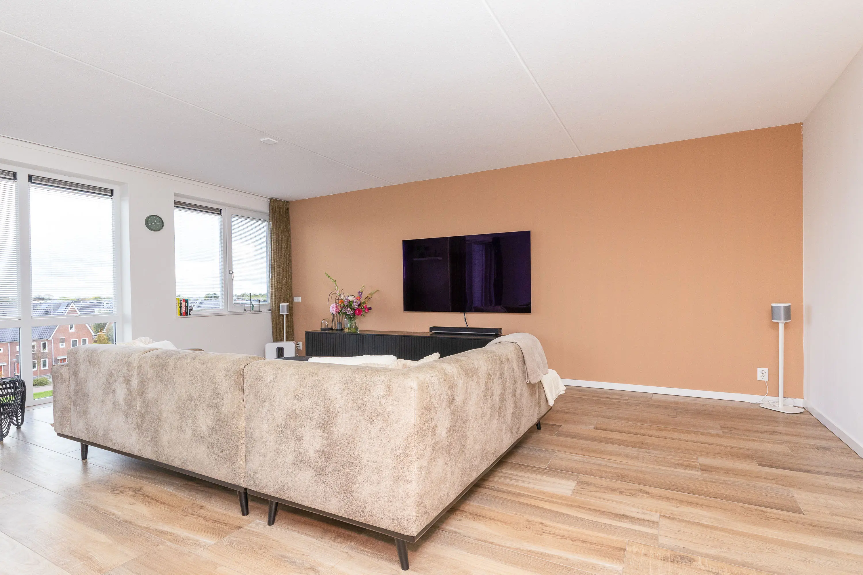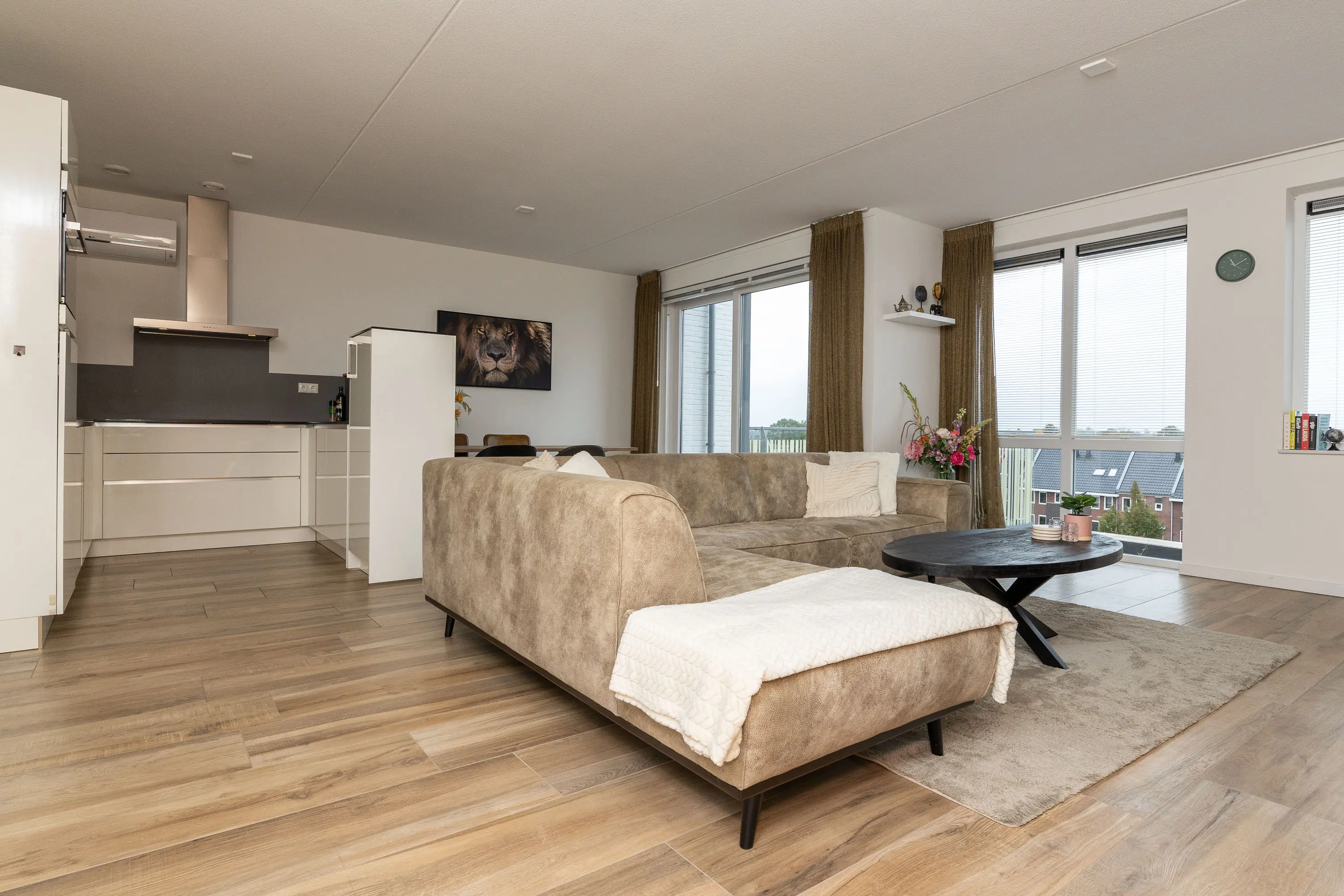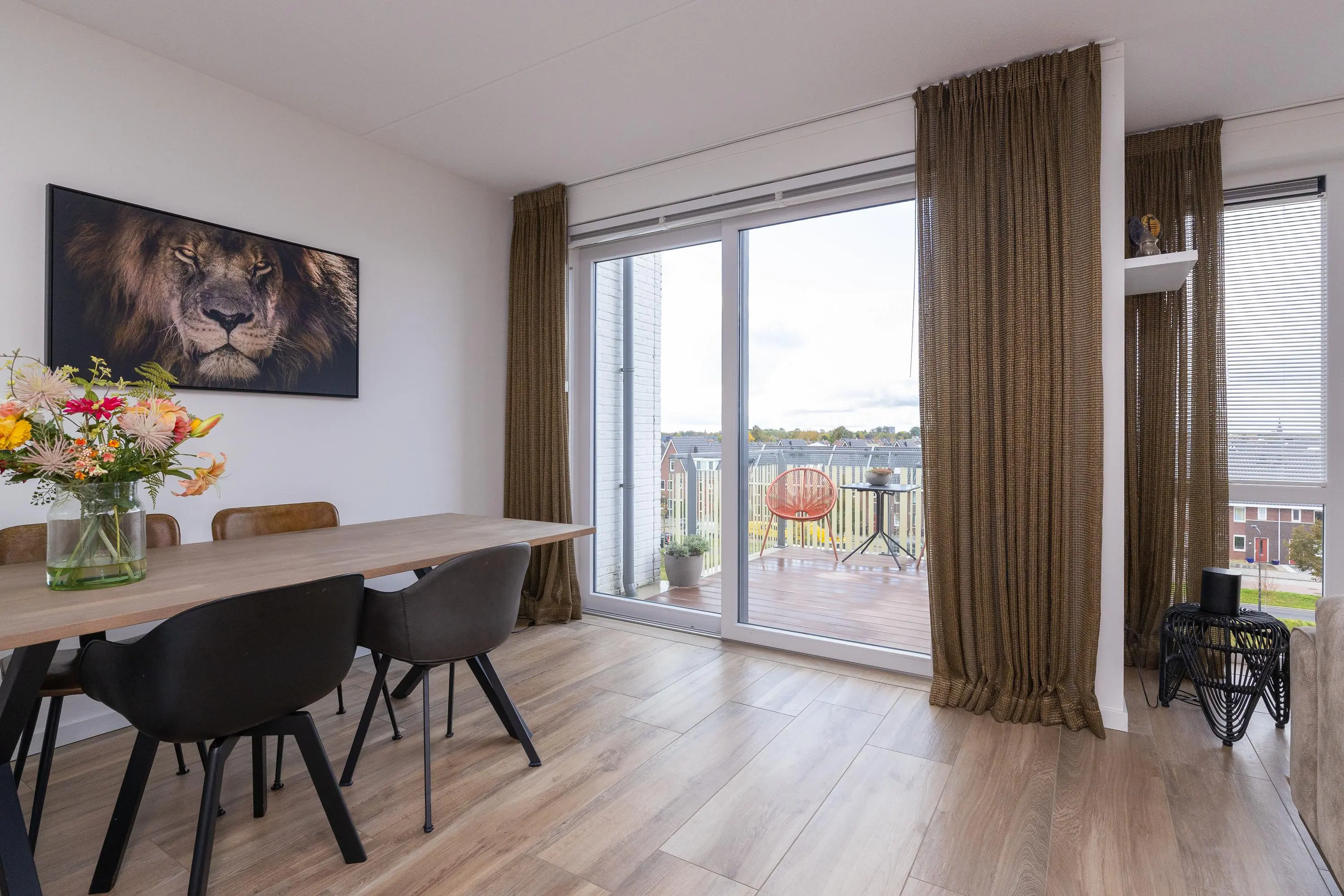 Geniet van de lichte woonkamer met directe toegang tot het ruime balkon op het zuidwesten: de ideale plek om te ontspannen met een goed glas wijn of een kop koffie in de middag- en avondzon.