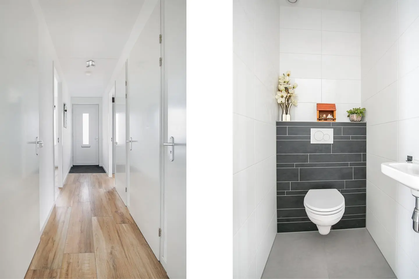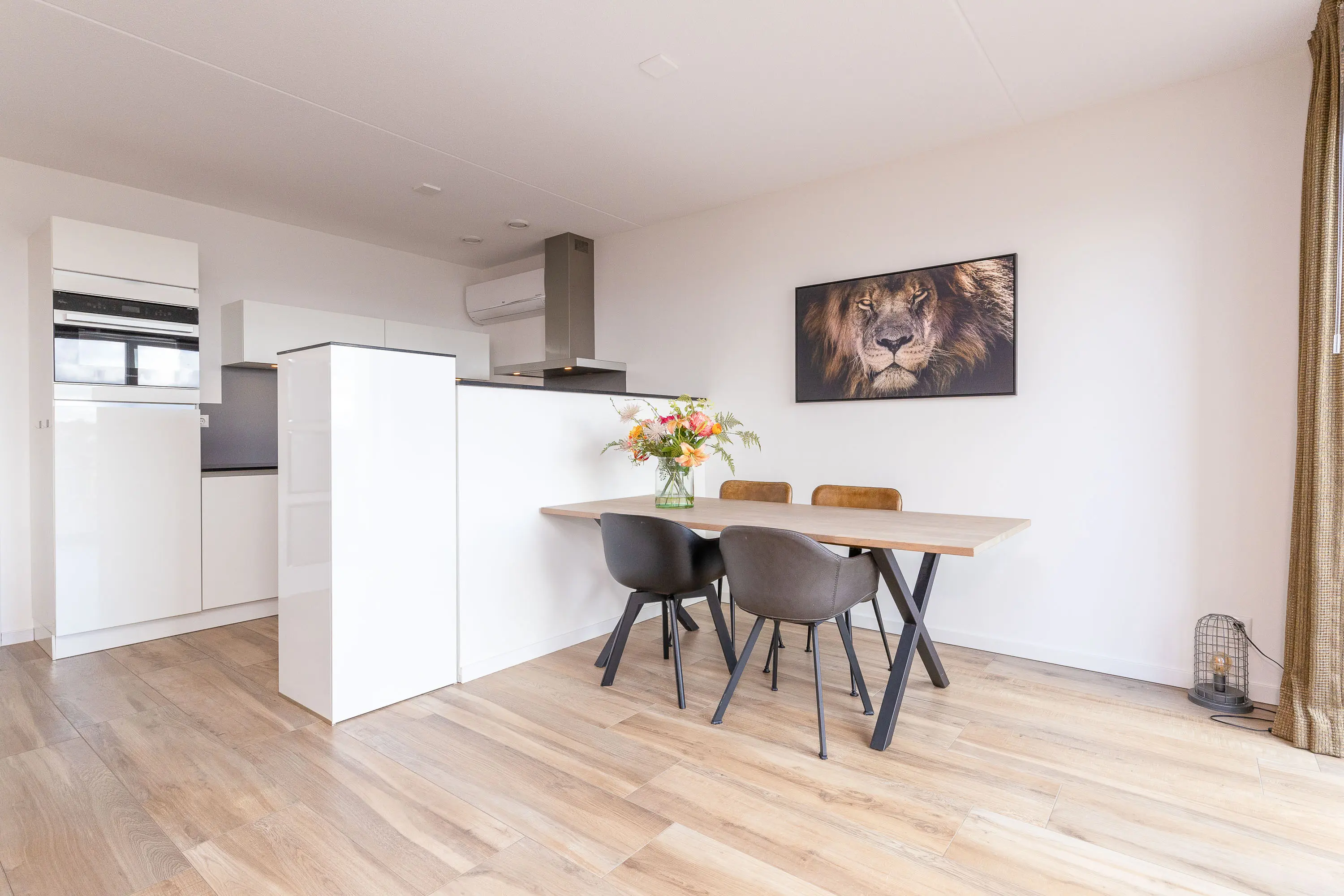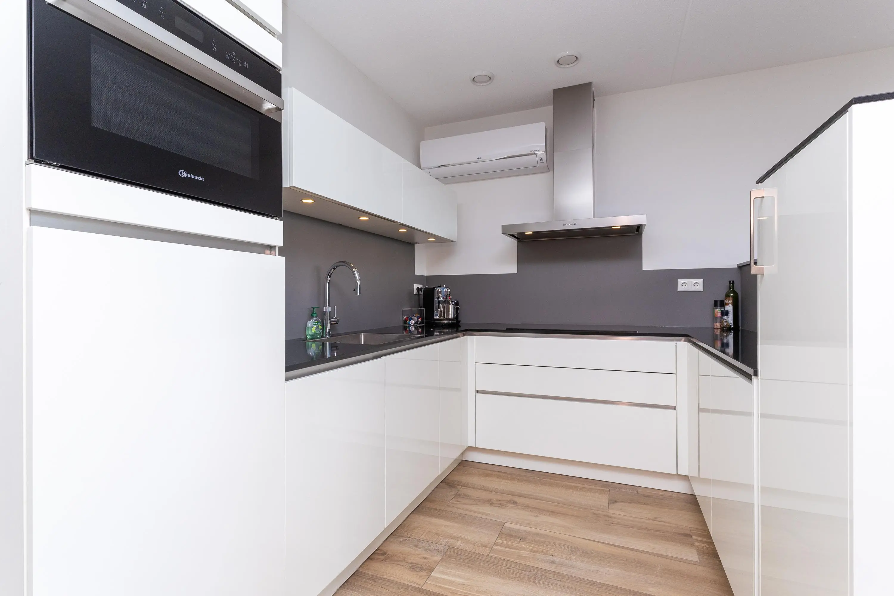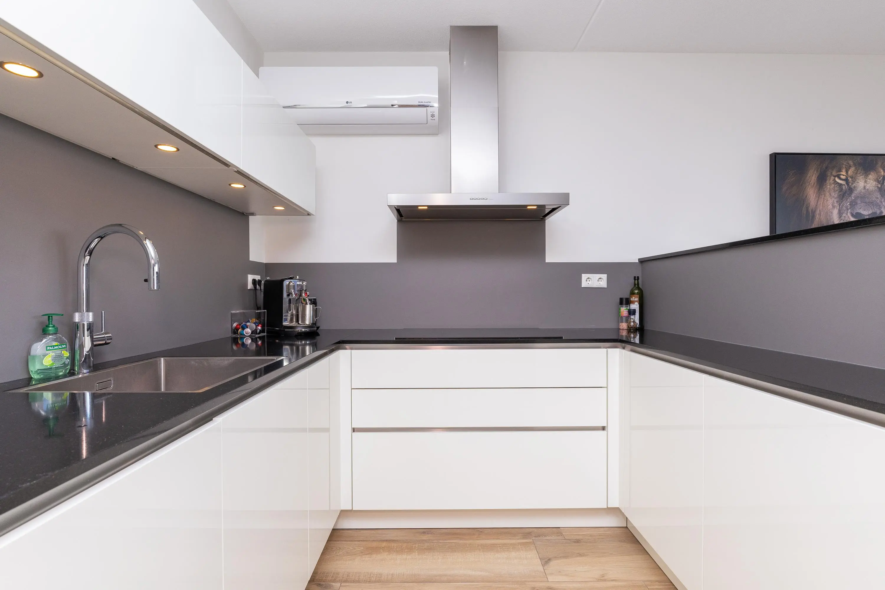 De royale living is modern ingericht en strak afgewerkt. De open keuken in U-opstelling is een echte eyecatcher en voorzien van hoogwaardige inbouwapparatuur zoals een inductiekookplaat, vaatwasser, combi-oven, koelkast, afzuigkap én een Quooker. Dankzij de vloerverwarming én airconditioning is het hier elk seizoen heerlijk genieten.