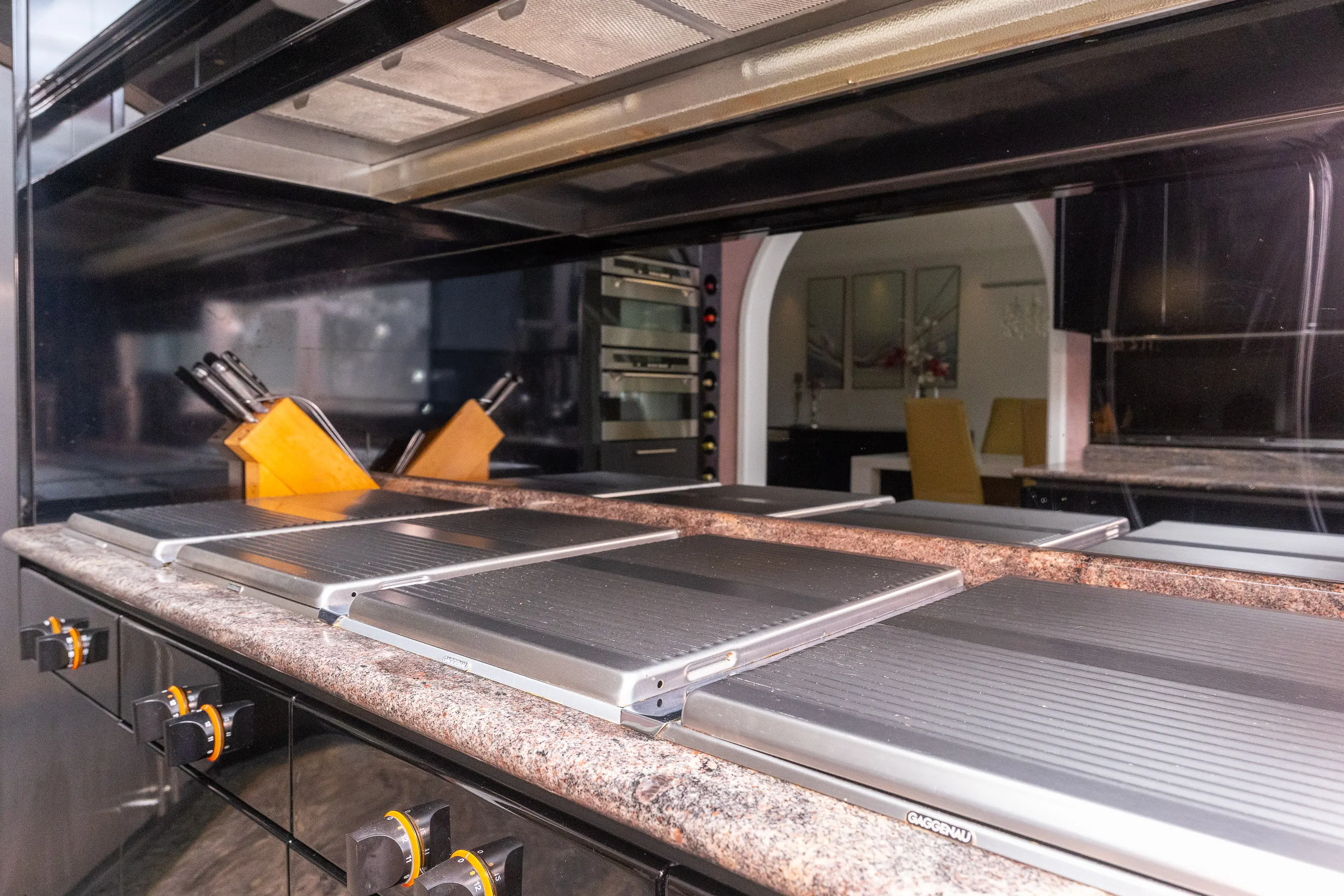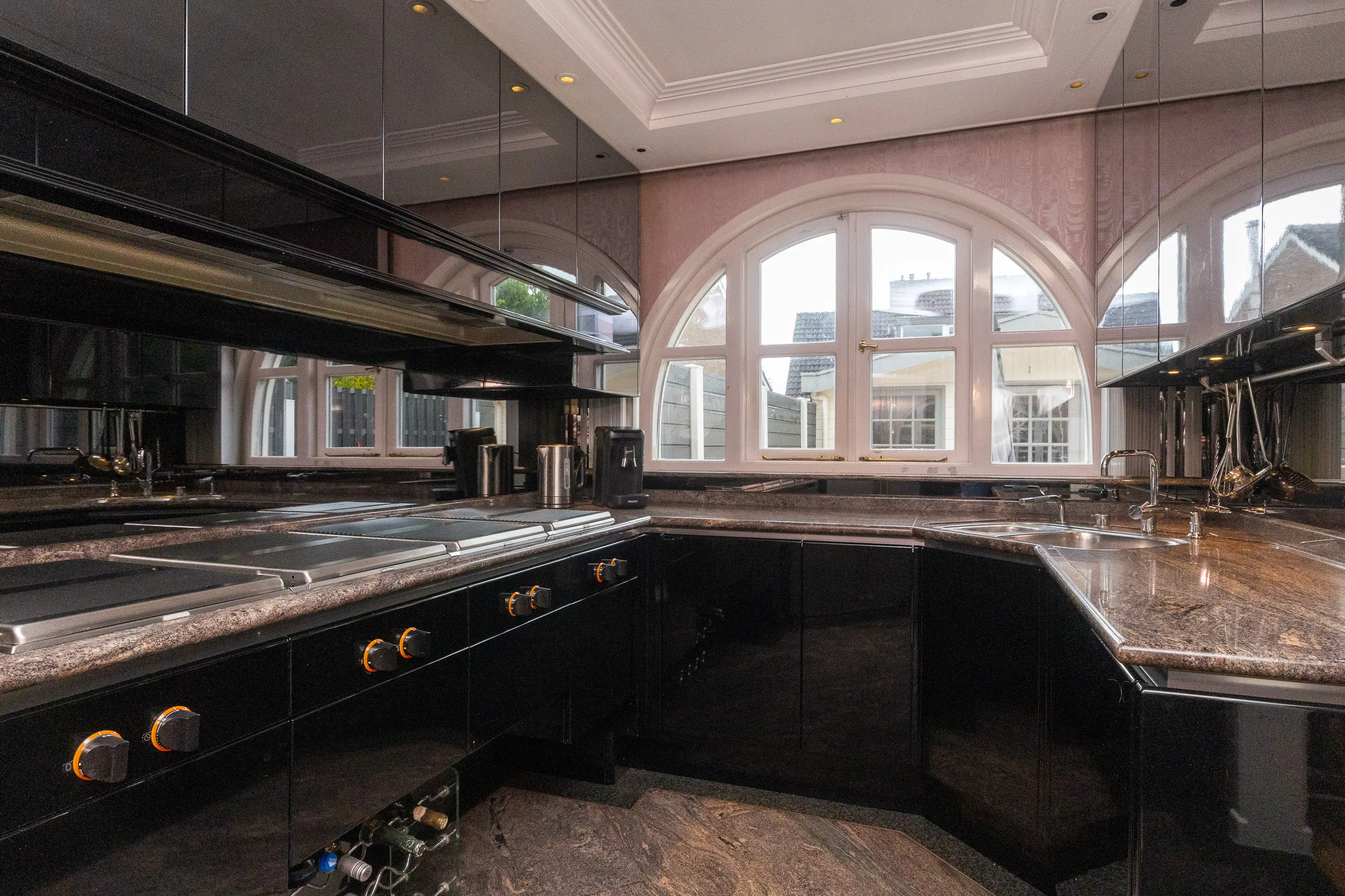 Achterin de woonkamer is de eethoek gesitueerd, met een directe verbinding naar de zonnige tuin op het zuidwesten via openslaande deuren. Naast de eethoek bevindt zich de luxe keuken. Aan kwaliteit geen gebrek: merkapparatuur, oven, combioven, Amerikaanse koelkast, een professioneel breed afzuigsysteem (extra krachtig), vernieuwde vaatwasser, een 8-pits fornuis en een fraai granieten aanrechtblad. Hier wordt koken een ware beleving. De keuken is bovendien voorzien van vloerverwarming, wat bijdraagt aan het comfort.