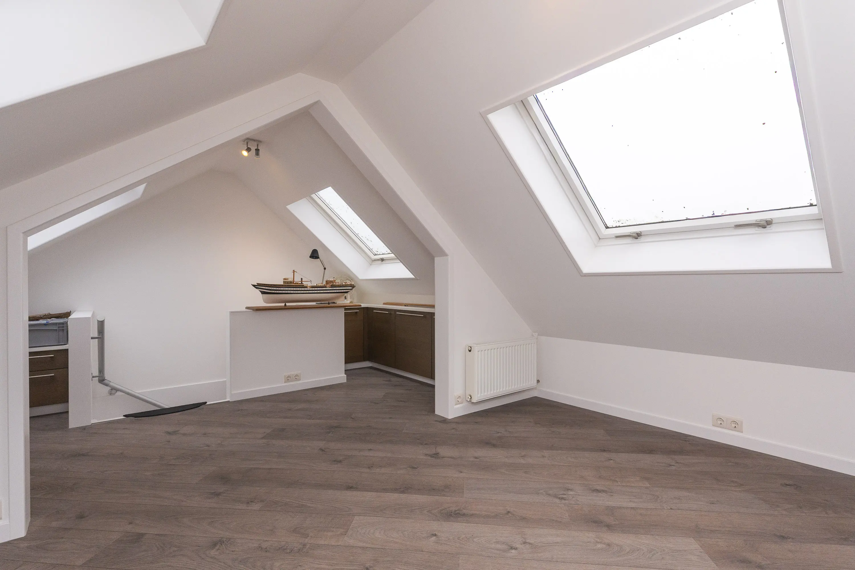 Een vaste trap leidt naar de tweede etage, waar u een ruime en keurig afgewerkte verdieping aantreft met maar liefst vier grote dakramen en radiatoren. Het dak is geïsoleerd en de verdieping is voorzien van een eigen wastafel. De cv-installatie is netjes weggewerkt in een wandkast, waardoor de ruimte optimaal benut wordt. Deze verdieping biedt tal van mogelijkheden, zoals een extra slaapkamer, werkkamer of hobbyruimte.