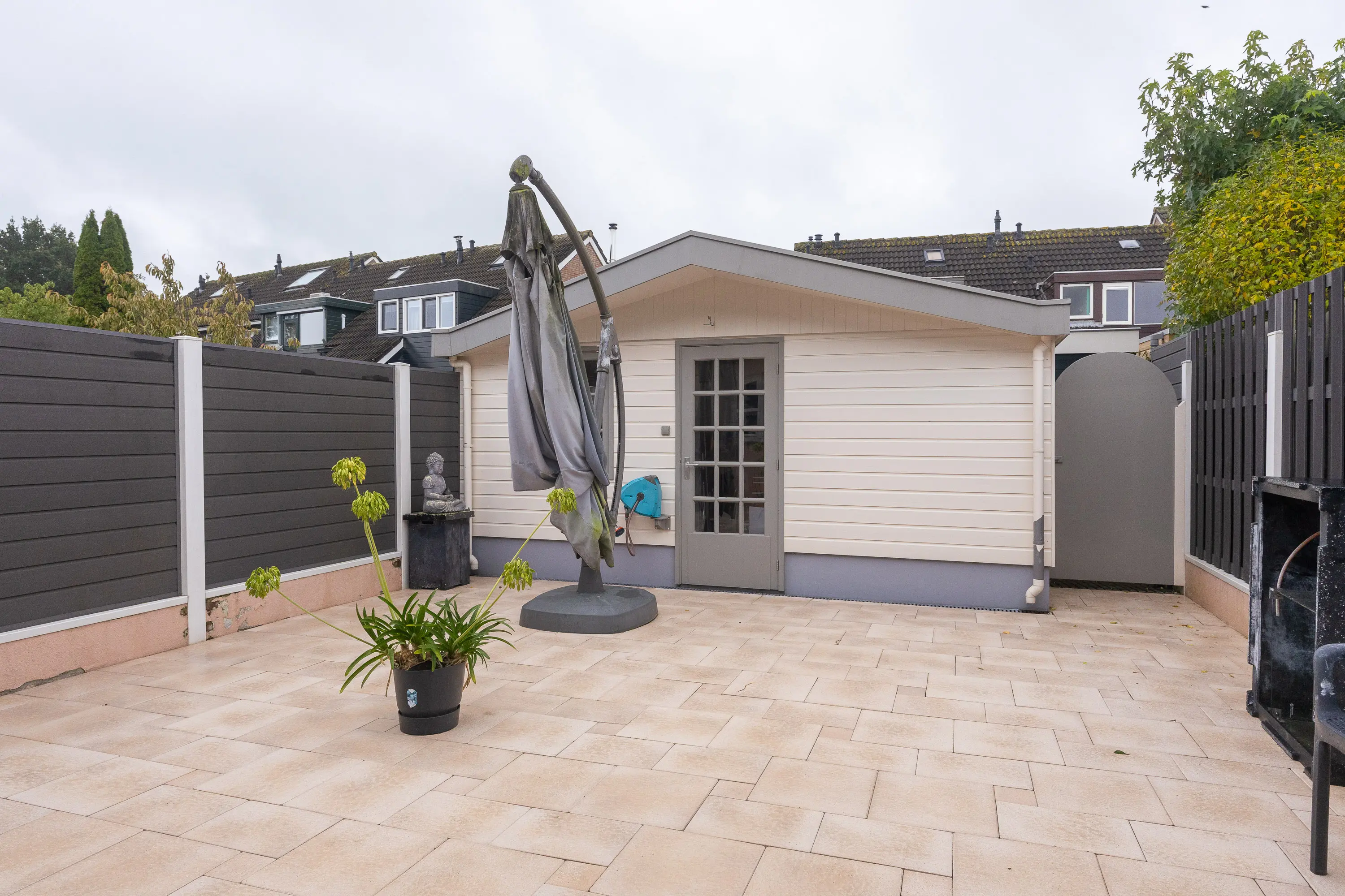 De achtertuin is gesitueerd op het zuidwesten, wat zorgt voor veel zon en lichtinval in de woning. De tuin is modern aangelegd, met strakke bestrating en moderne schuttingen aan beide zijden. Achterin bevindt zich een ruime berging/bijgebouw, volledig betegeld en voorzien van witgoedaansluitingen, water, eigen groepen en elektra. De biedt een achterom en uiteraard ontbreekt ook hier de kenmerkende ronde afwerking niet, welke is terug te vinden in de poort. Aan de achterzijde zijn ook goede de unieke kozijnen en achterdeuren met de ronde vormen zichtbaar die de woning een geheel eigen uitstraling geeft.