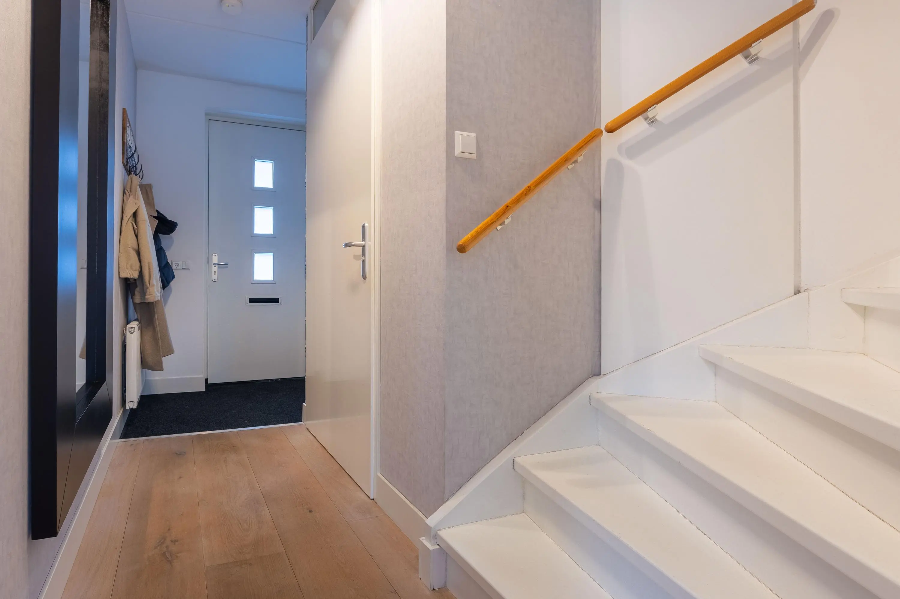 Overloop, tweetal slaapkamers aan de achterzijde en een ruime slaapkamer aan de voorzijde. In de nette badkamer treft u een inloopdouche, een dubbele wastafelmeubel en een tweede toilet, het raam zorgt voor natuurlijk licht en ventilatie er is ook mechanische ventilatie aanwezig.